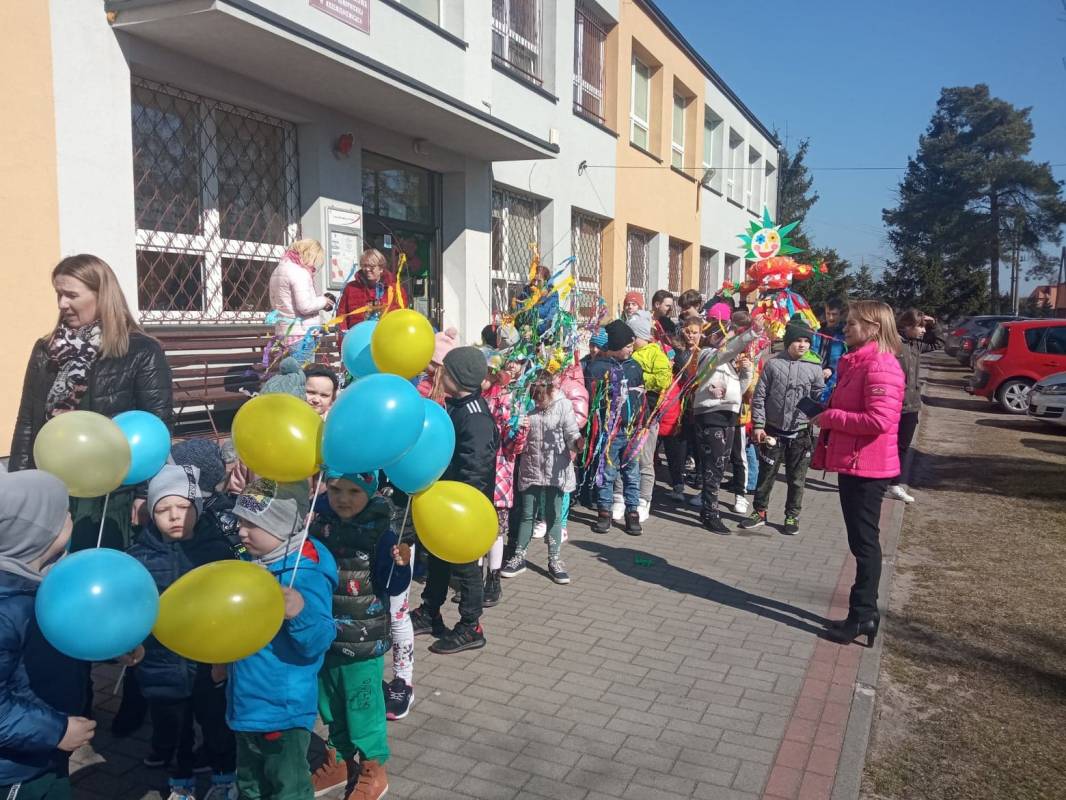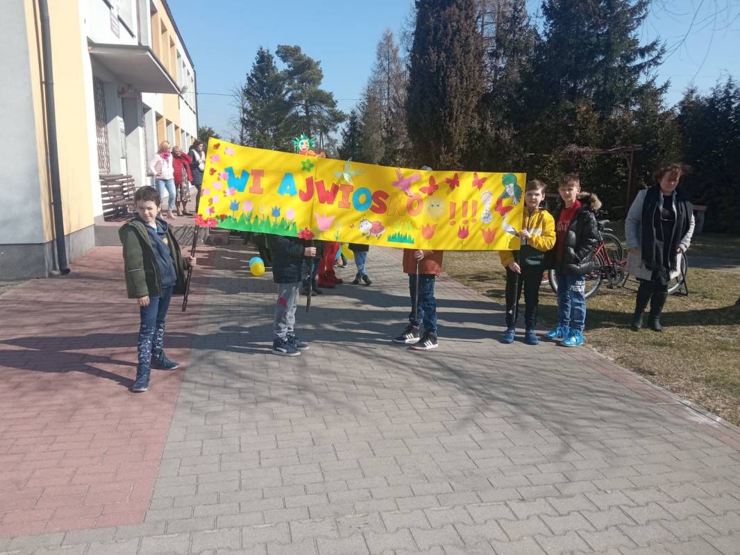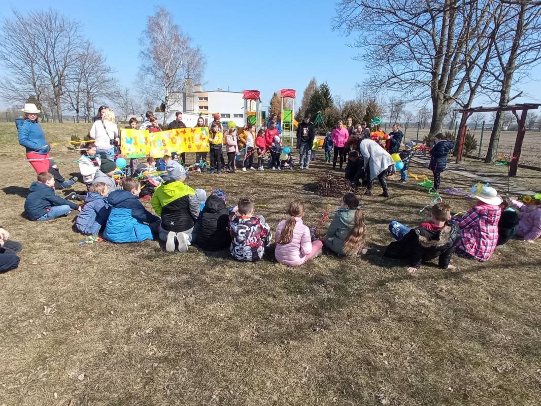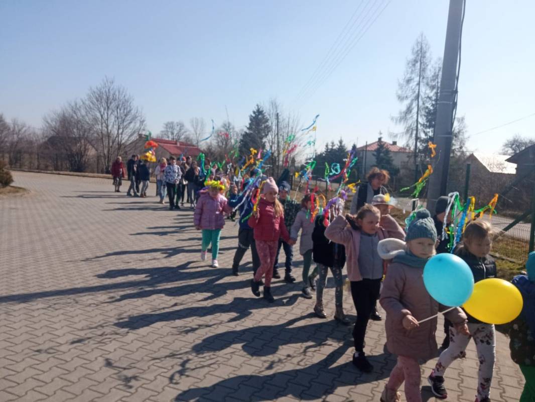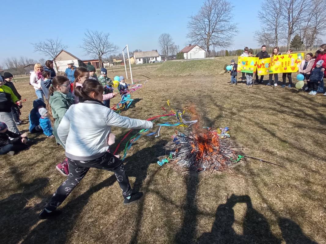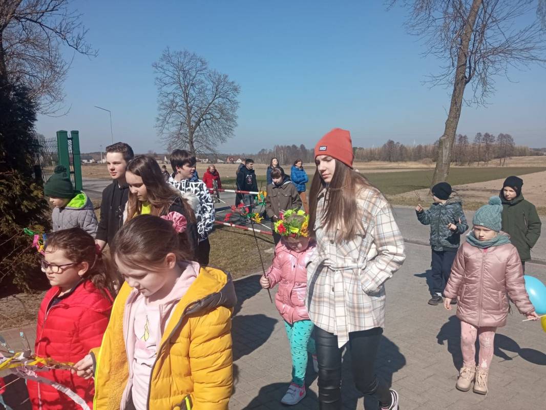 Takie same nastroje towarzyszyły od pewnego czasu również uczniom Szkoły Podstawowej w Krzemieniewicach. I w końcu doczekali się! Z wiankami na głowach, w kolorowych strojach, trzymając w rękach wiosenne gaiki udali się na krótki spacer, by powitać wiosnę. Barwnemu korowodowi przewodniczyli uczniowie niosący powitalny transparent. Nie zabrakło oczywiście ekologicznej marzanny, która na zakończenie pochodu spłonęła w ognisku, na dobre żegnając mroźną i długą zimę. Wszystkie dzieci i nauczyciele z uśmiechami na twarzach i w promieniach słońca powitali wiosnę.