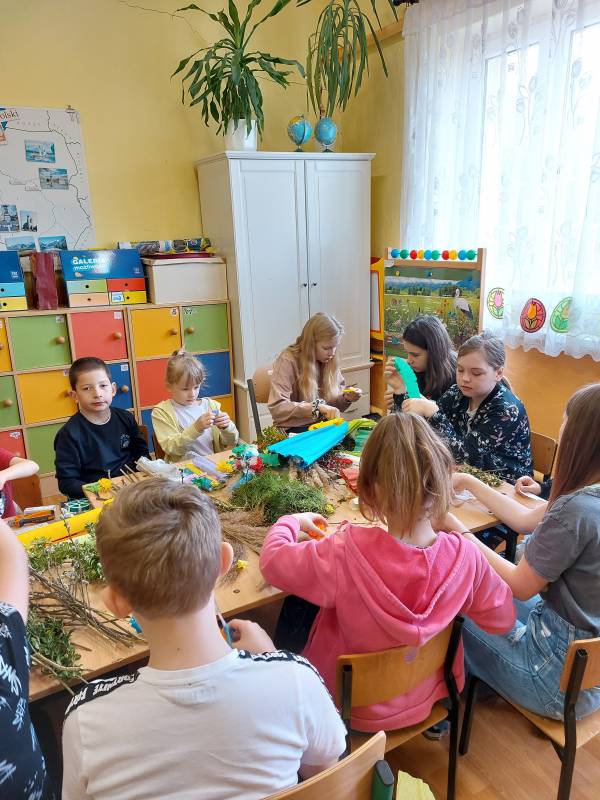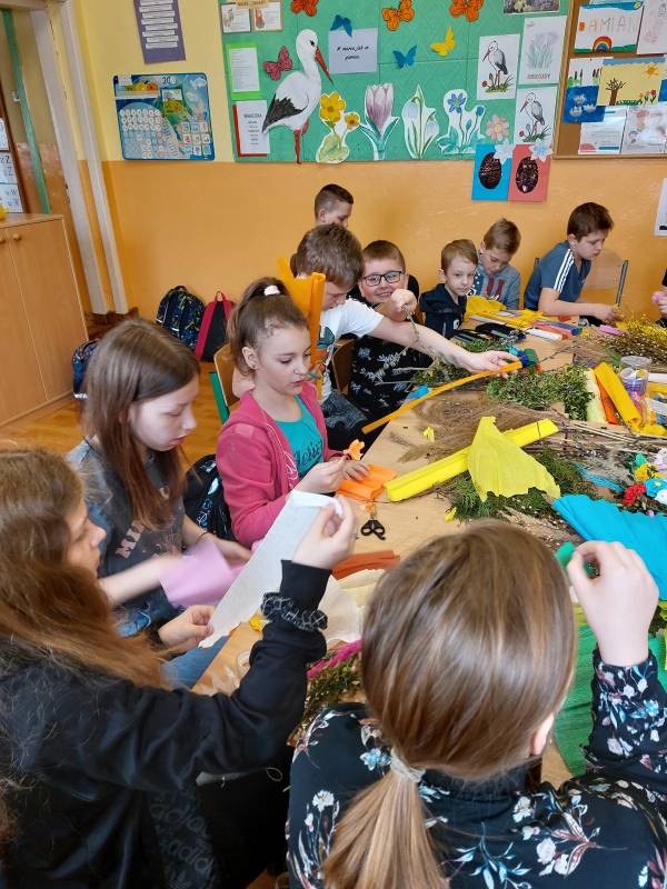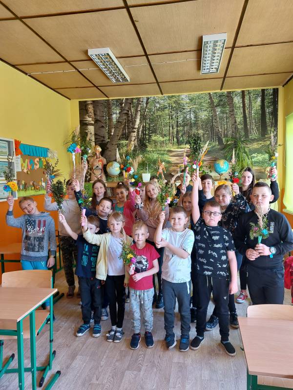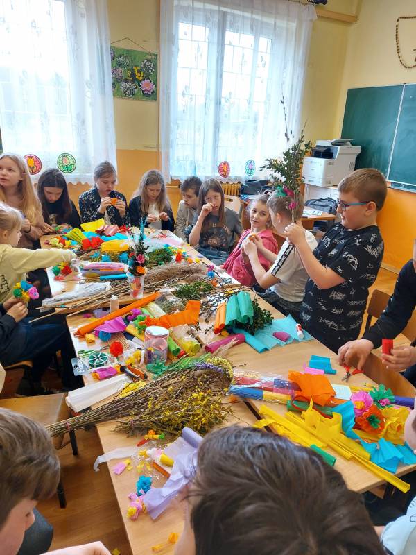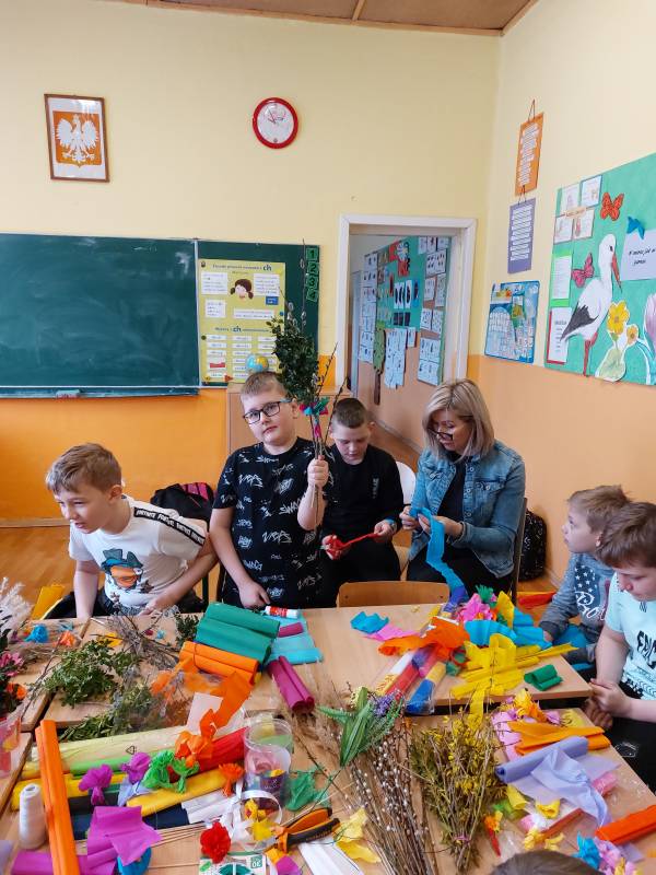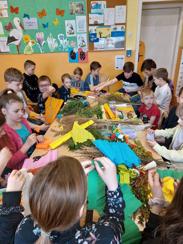 Uczniowie z wielkim zapałem i zaangażowaniem uczestniczyli w spotkaniu, przynieśli gałązki wierzby, kolorowe bibuły, wstążki i bukszpan.