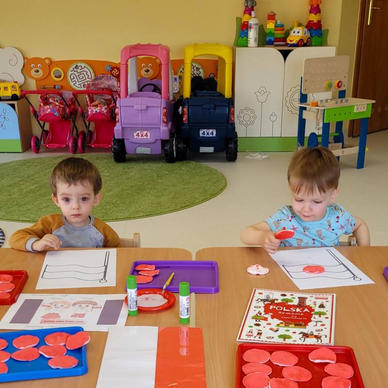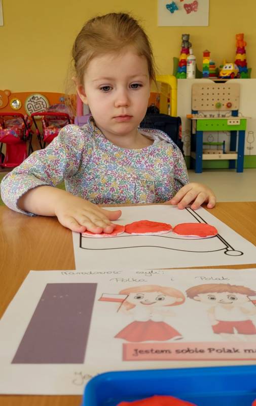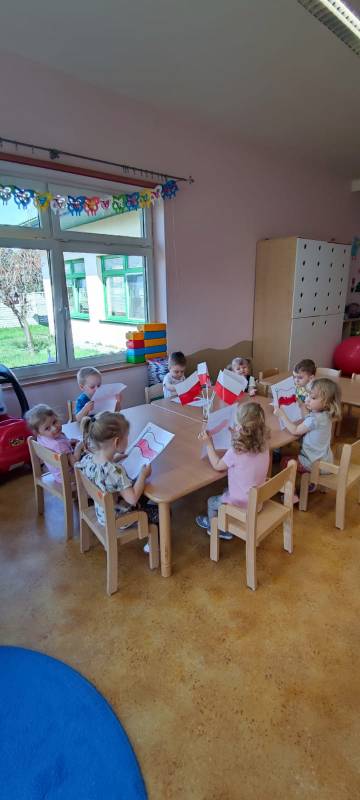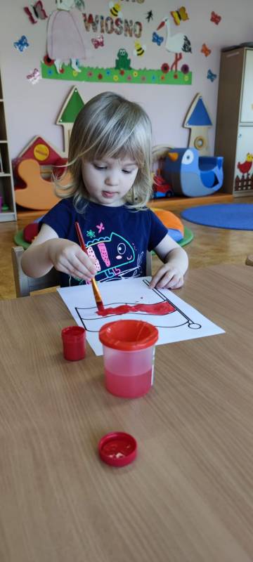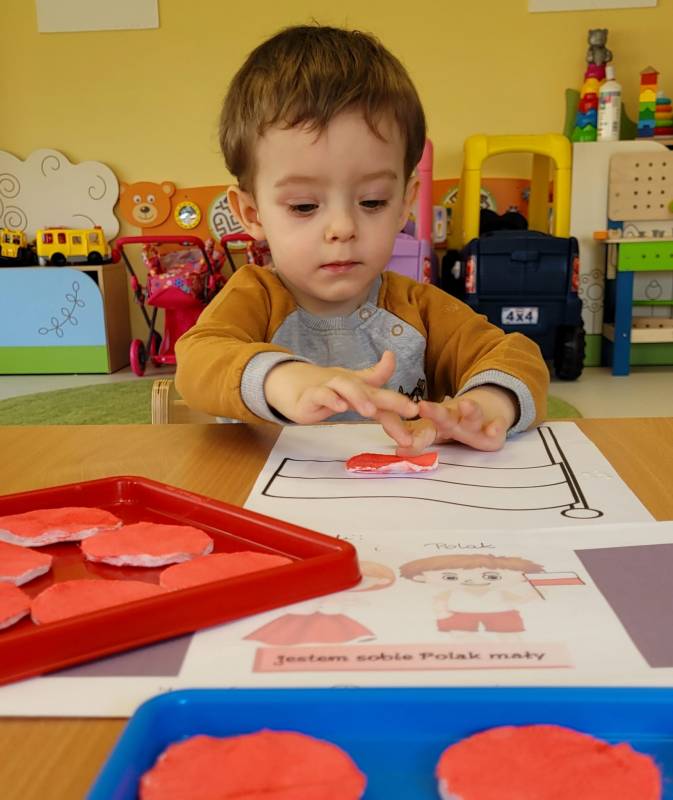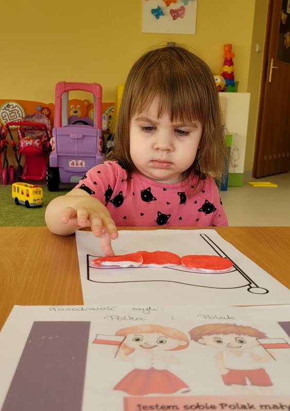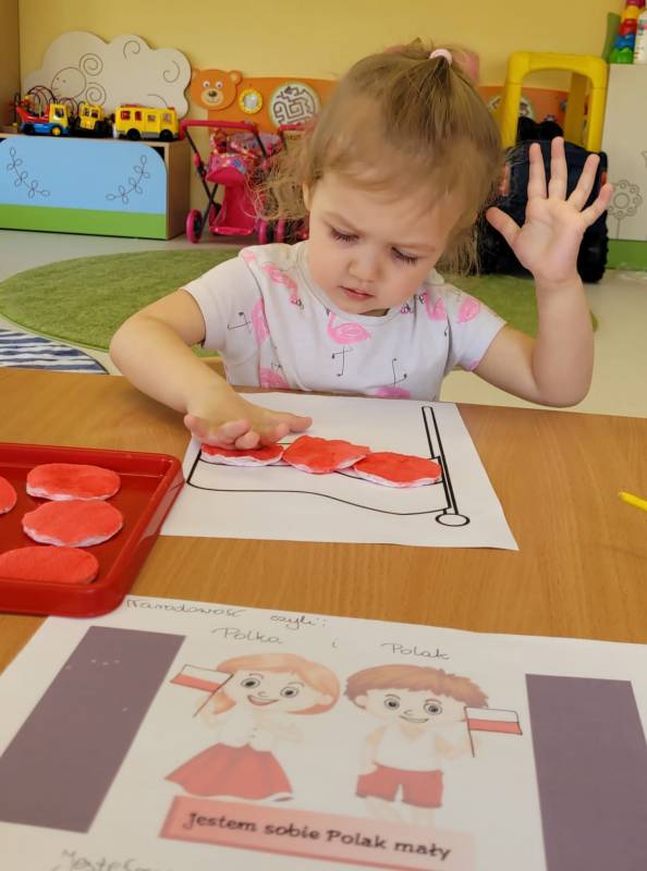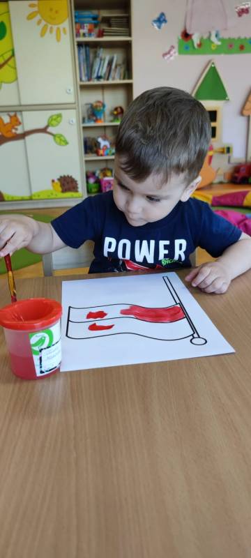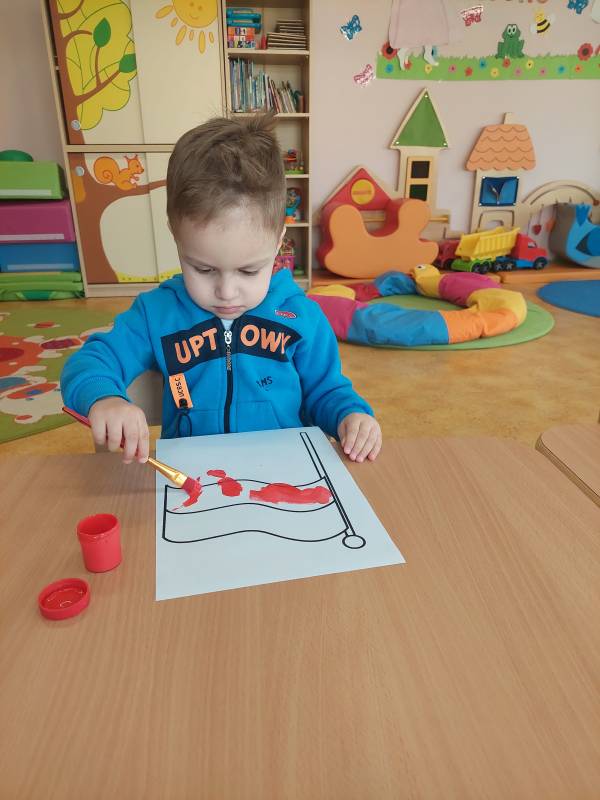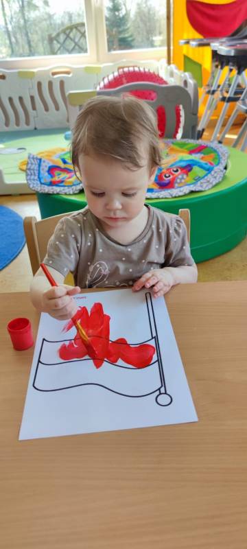W poczuciu tożsamości narodowej i szacunek dla narodowych symboli w naszym Klubiku zorganizowano zajęcie nawiązujące do świąt państwowych. 2 maja obchodzony jest Dzień Flagi Rzeczypospolitej Polskiej. My także postanowiliśmy uczcić nasze barwy ojczyste. Zajęcie zostało poświęcone poznawaniu naszych symboli narodowych. Dzień ten był dla dzieci lekcją przypomnienia, że są Polakami, a Polska to ich Ojczyzna. Maluszki chętnie uczestniczyły w zabawach ruchowych oraz zajęciach plastycznych, podczas których każde z nich wykonało swoją flagę .