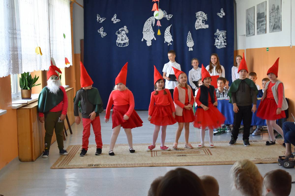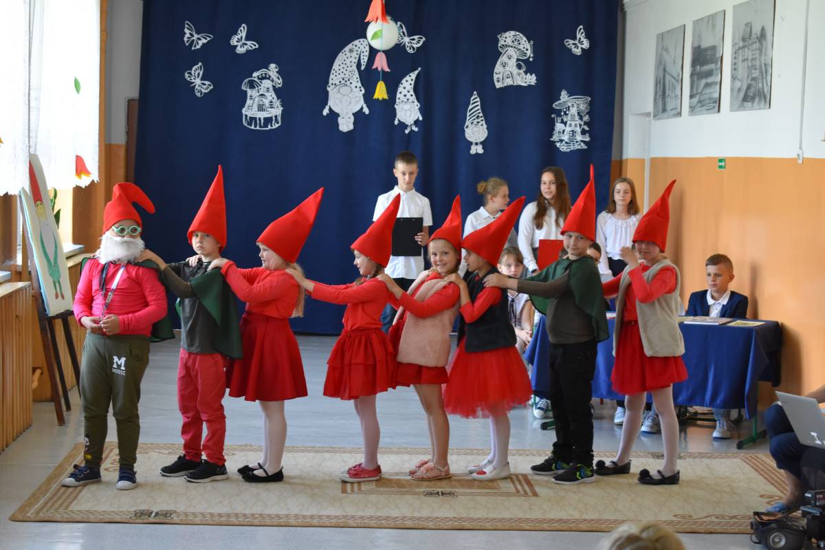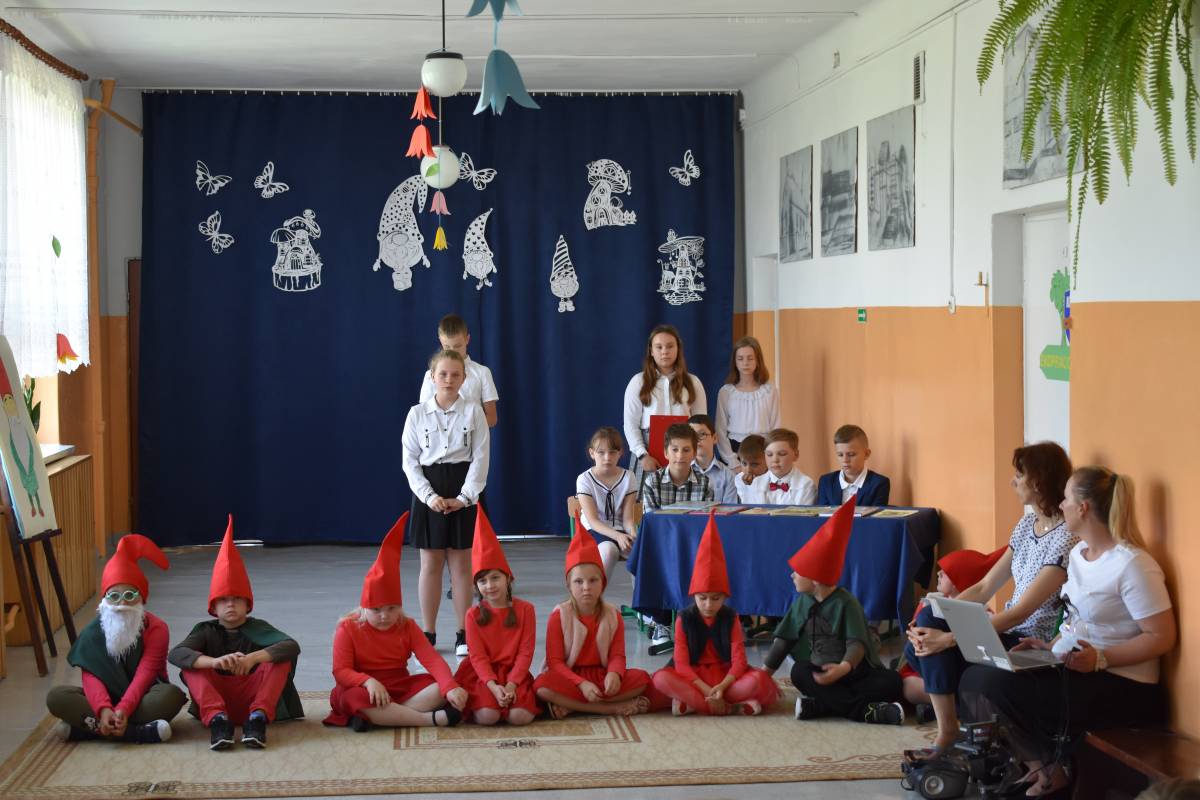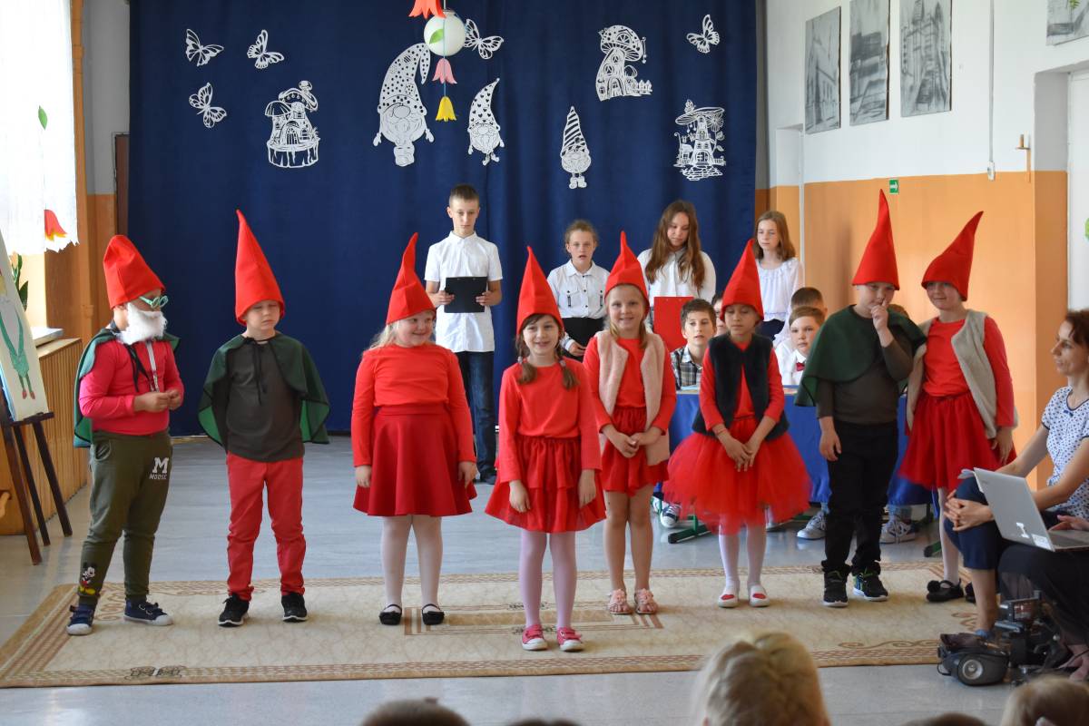 Aby uczcić Patronkę szkoły, przygotowaliśmy uroczystą akademię. Rozpoczęliśmy od przypomnienia życiorysu Marii Konopnickiej, która w tym roku obchodziłaby 180 rocznicę urodzin. Scenariusz akademii został opracowany na podstawie książki pt. „O krasnoludkach i o sierotce Marysi” oraz poznanych wcześniej przez uczniów baśni i filmów dla dzieci, w których pojawiły się krasnoludki. W inscenizacji zatytułowanej „Wszystko o krasnoludkach” wzięli udział uczniowie -„naukowcy”, którzy wnikliwie badali budowę, miejsce zamieszkania, imiona, zajęcia i zainteresowania skrzatów. W sposób humorystyczny przedstawili oni rezultaty swoich badań. Uzupełnieniem sesji naukowej był barwny pokaz „skrzaciej” mody, piosenki i wierszyki o krasnoludkach oraz wystawa lapbooków poświęconych Marii Konopnickiej wyeksponowana na korytarzu szkolnym. Całości dopełniała piękna, „ażurkowa” dekoracja.