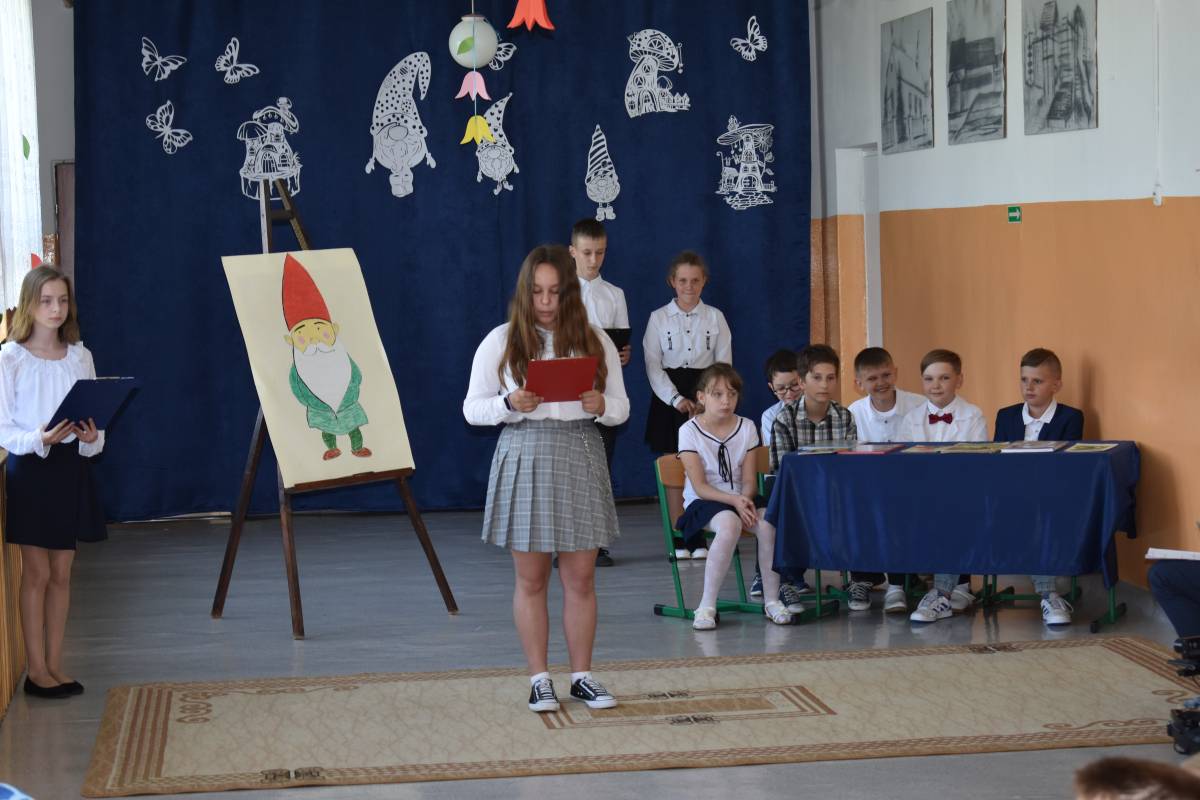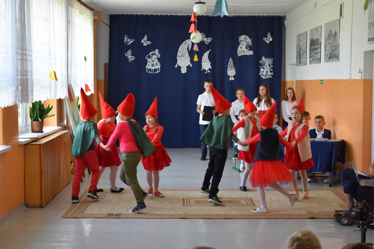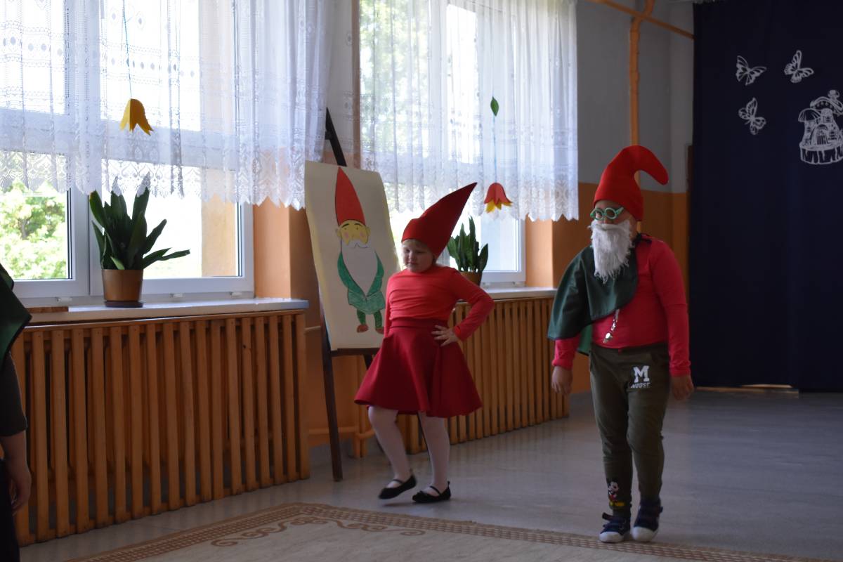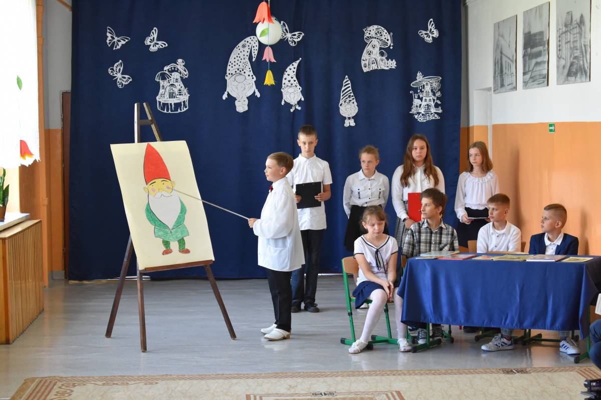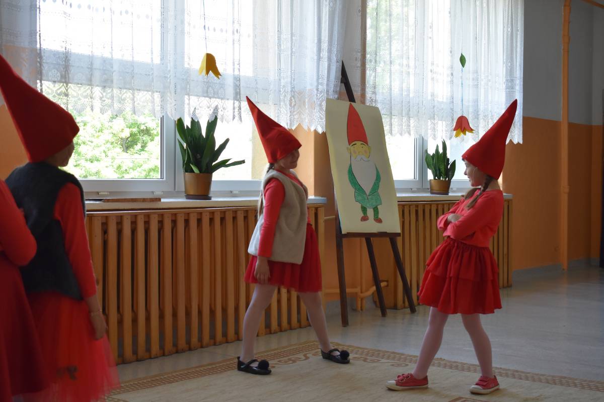 Aby uczcić Patronkę szkoły, przygotowaliśmy uroczystą akademię. Rozpoczęliśmy od przypomnienia życiorysu Marii Konopnickiej, która w tym roku obchodziłaby 180 rocznicę urodzin. Scenariusz akademii został opracowany na podstawie książki pt. „O krasnoludkach i o sierotce Marysi” oraz poznanych wcześniej przez uczniów baśni i filmów dla dzieci, w których pojawiły się krasnoludki. W inscenizacji zatytułowanej „Wszystko o krasnoludkach” wzięli udział uczniowie -„naukowcy”, którzy wnikliwie badali budowę, miejsce zamieszkania, imiona, zajęcia i zainteresowania skrzatów. W sposób humorystyczny przedstawili oni rezultaty swoich badań. Uzupełnieniem sesji naukowej był barwny pokaz „skrzaciej” mody, piosenki i wierszyki o krasnoludkach oraz wystawa lapbooków poświęconych Marii Konopnickiej wyeksponowana na korytarzu szkolnym. Całości dopełniała piękna, „ażurkowa” dekoracja.