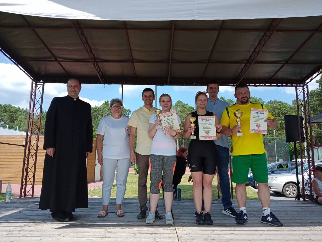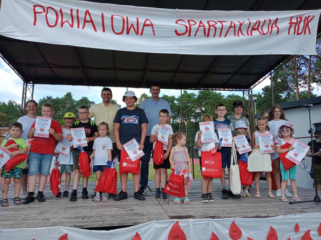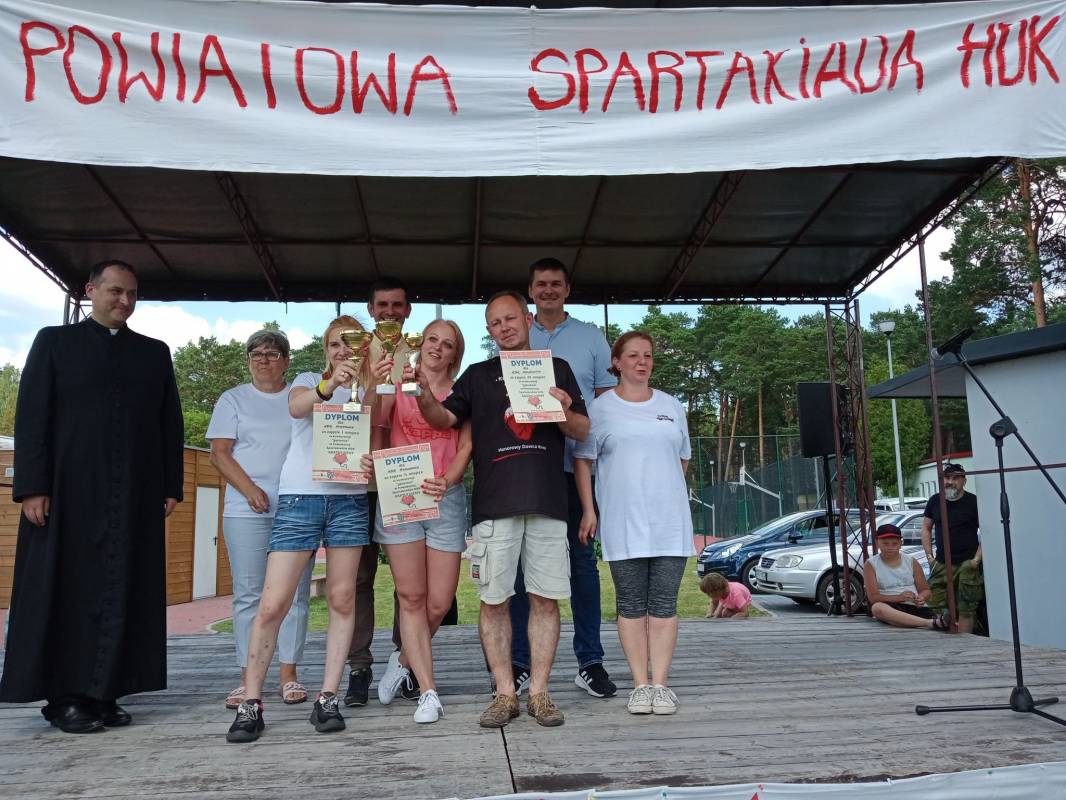 Puchary i nagrody wręczali Członek Zarządu Powiatu Piotrkowskiego Oskar Kuliński, Pani Halina Ałaszewska z Regionalnego Centrum Krwiodawstwa i Krwiolecznictwa w Łodzi, Ks. Proboszcz Robert Glen oraz gość specjalny tegorocznej spartakiady – Michał Bąkiewicz, który w ubiegłym roku w roli trenera z juniorską reprezentacją Polski siatkarzy zdobył mistrzostwo świata.
