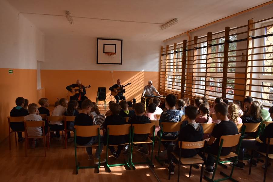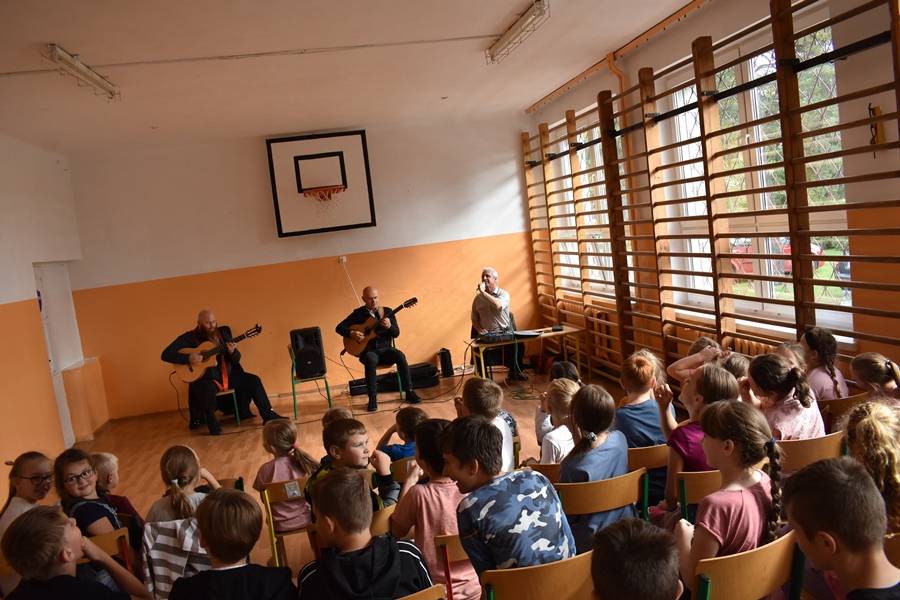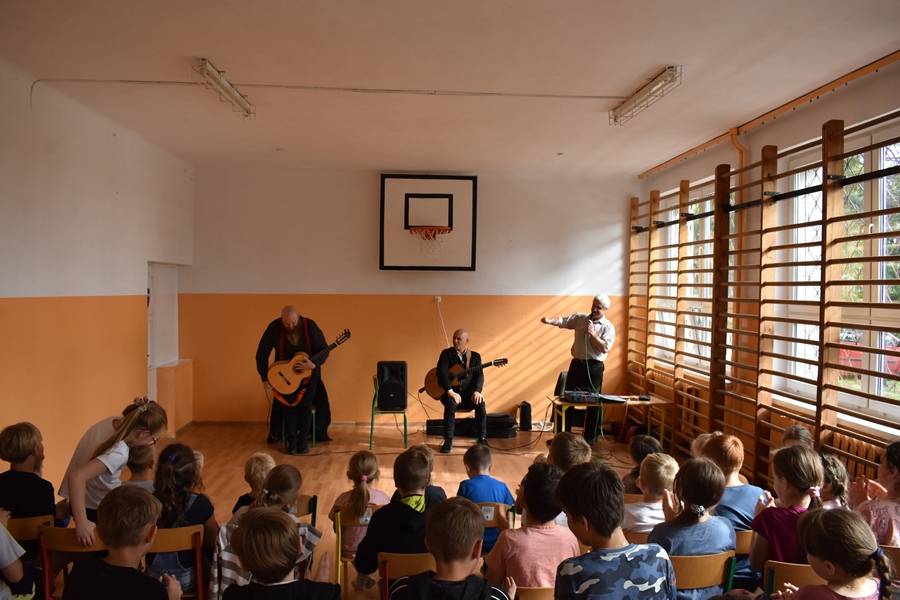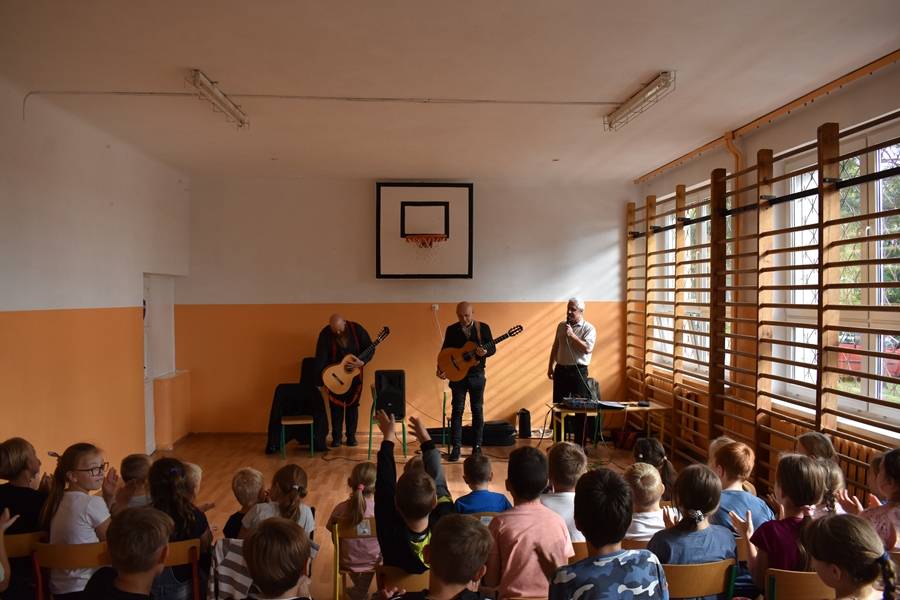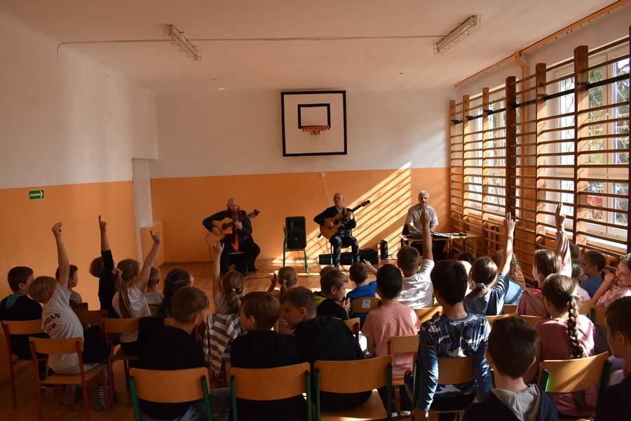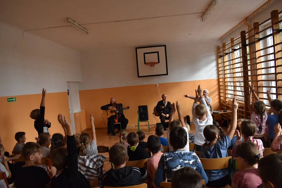 Choć wakacje już się dawno skończyły, to w czwartkowy ranek, 29 września, uczniowie Szkoły Podstawowej w Krzemieniewicach mogli jeszcze, choć na chwilę, przenieść się do ojczyzny corridy i paso doble. Stało się to za sprawą muzyków - Jarosława Czajczyńskiego oraz Michała Izydorczyka, którzy zaprezentowali piękne utwory inspirowane kulturą hiszpańską.