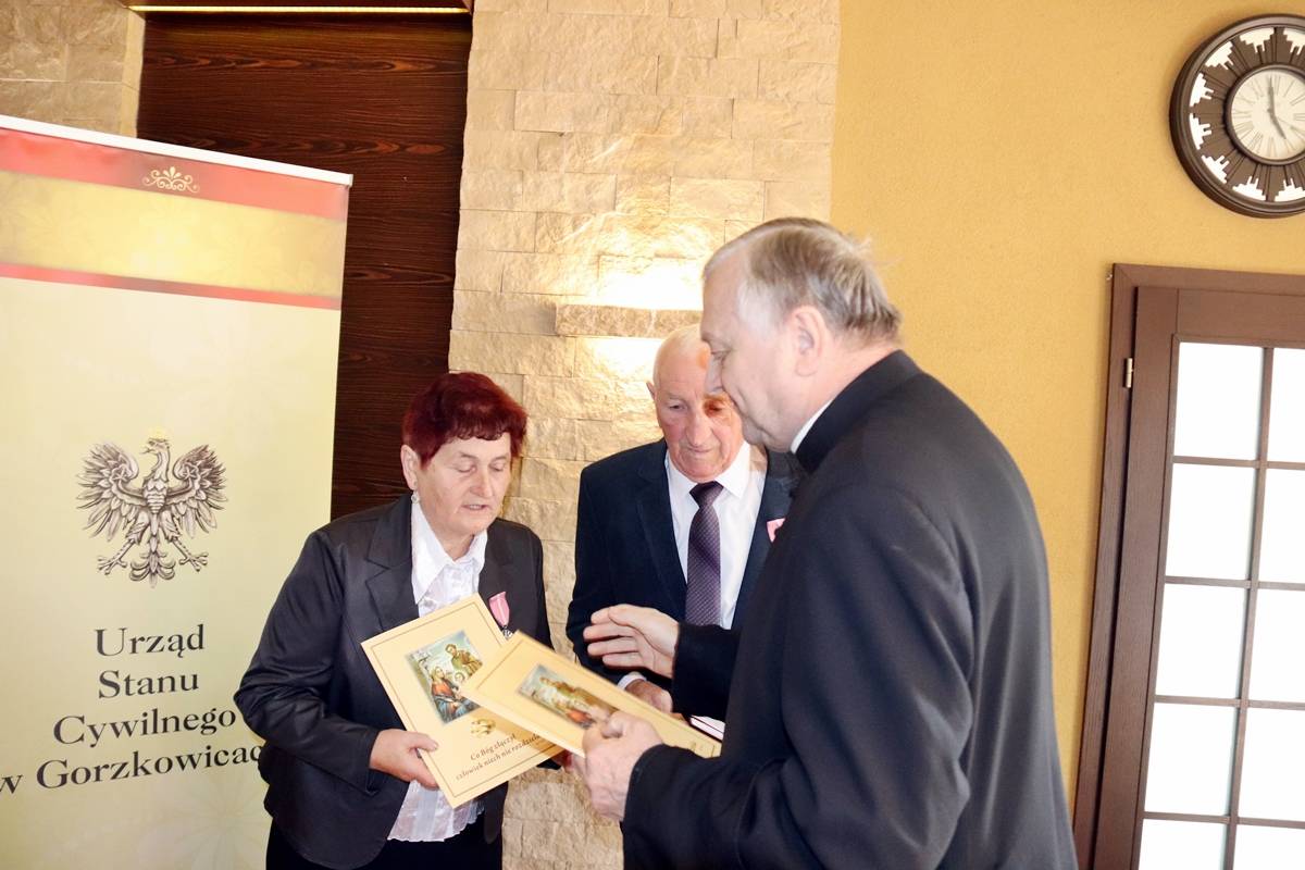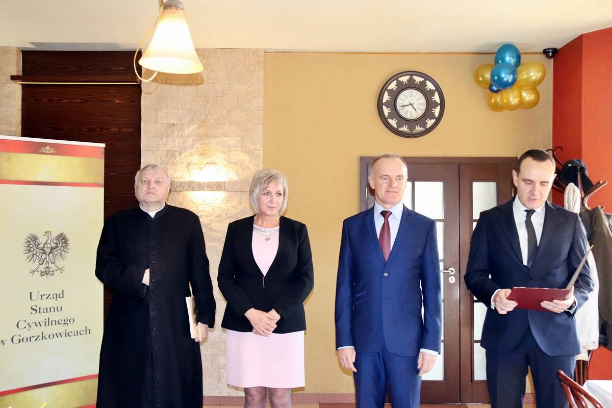 Pan Dariusz Olczyk z-ca Kierownika USC w Gorzkowicach powitał szanownych Jubilatów, a także Wójta Gminy Gorzkowice Alojzego Włodarczyka, Przewodniczącą Rady Gminy Gorzkowice Anetę Karbowiak i księdza Proboszcza Ryszarda Bryłkę.