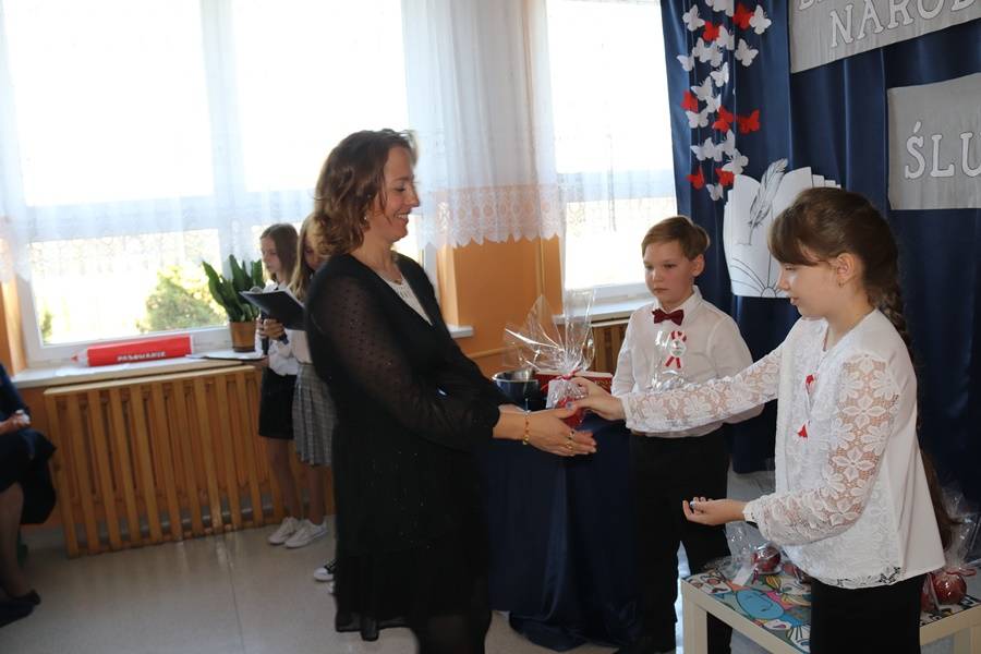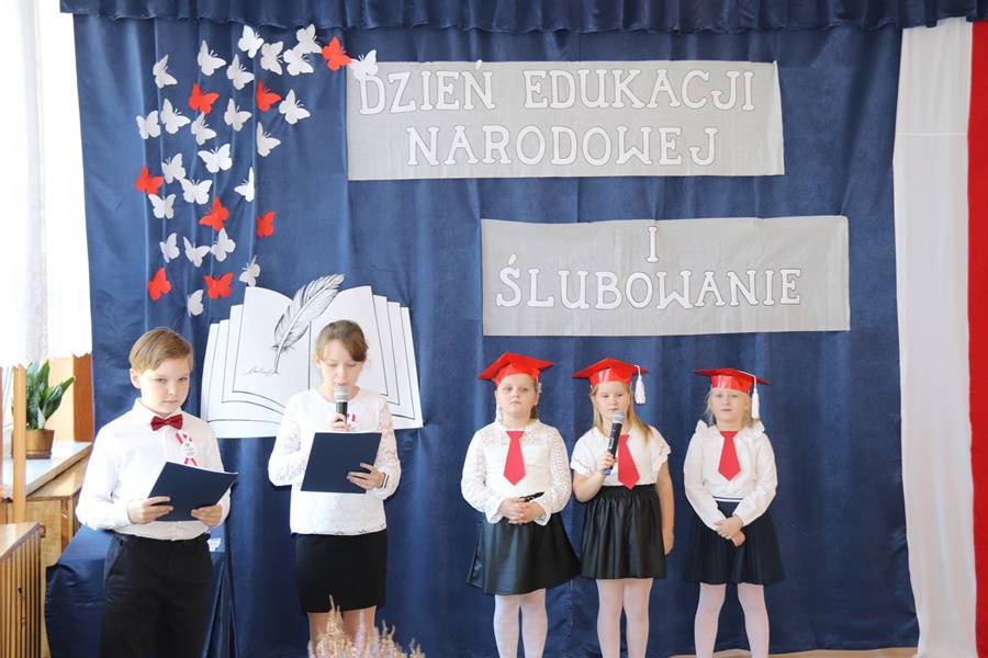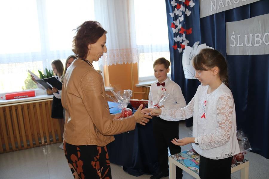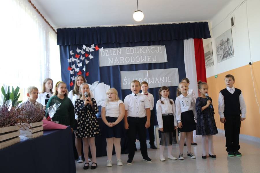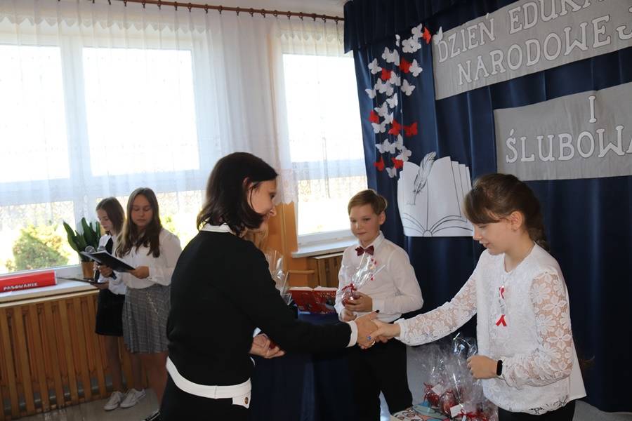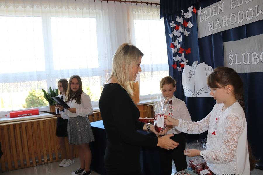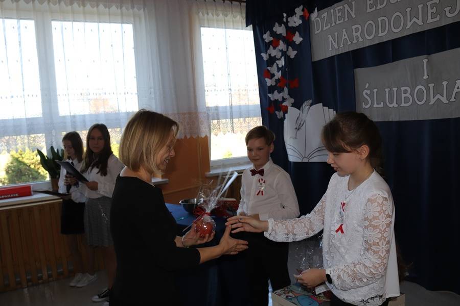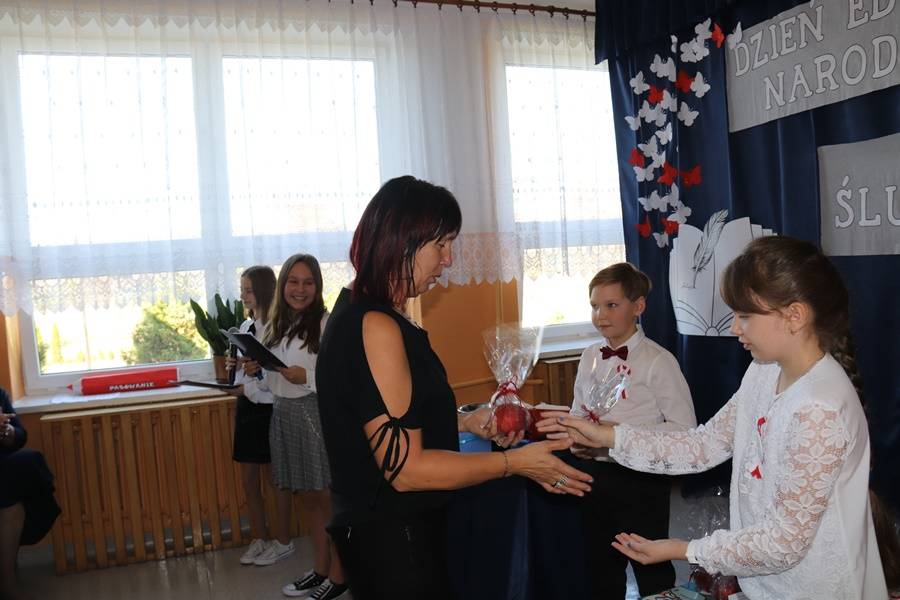 W wigilię Dnia Edukacji Narodowej nie mogło również zabraknąć życzeń i części artystycznej poświęconej pedagogom i pracownikom szkoły. Najpierw przedstawiony został „Przepis na ucznia”, gdyż, aby być uczniem, nie wystarczy samo chodzenie do szkoły. Potrzeba jeszcze paru innych składników… Następnie odbyła się nietypowa uroczystość pn. Gala Oscarowo-Jabłkowa, podczas której uczniowie postanowili podziękować swoim nauczycielom i pracownikom szkoły. Wszystkim zostały wręczone rumiane jabłka w różnych kategoriach, m.in. Baw się z nami laleczkami, Kłam nie grzesząc, Muza młodych twórców czy Znawca śrubki, wkrętki i pokrętki. Głos zabrała także oczywiście Zaradna Matka Dyrektorka Pani Elżbieta Włodarczyk, która podziękowała wszystkim nauczycielom i pracownikom za trud wkładany w codzienną pracę na rzecz naszej szkoły i uczniów oraz za budowanie przyjaznej i miłej atmosfery każdego dnia.