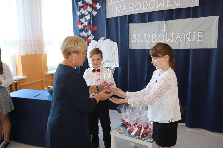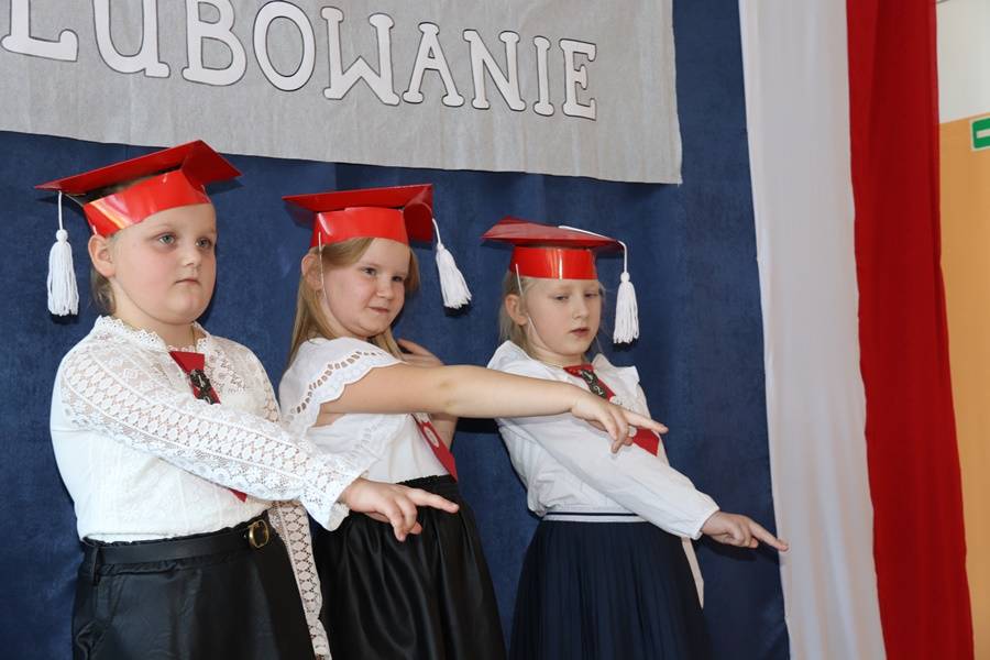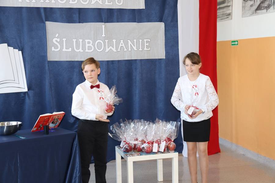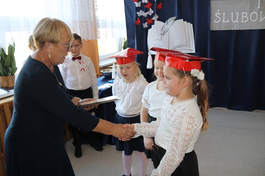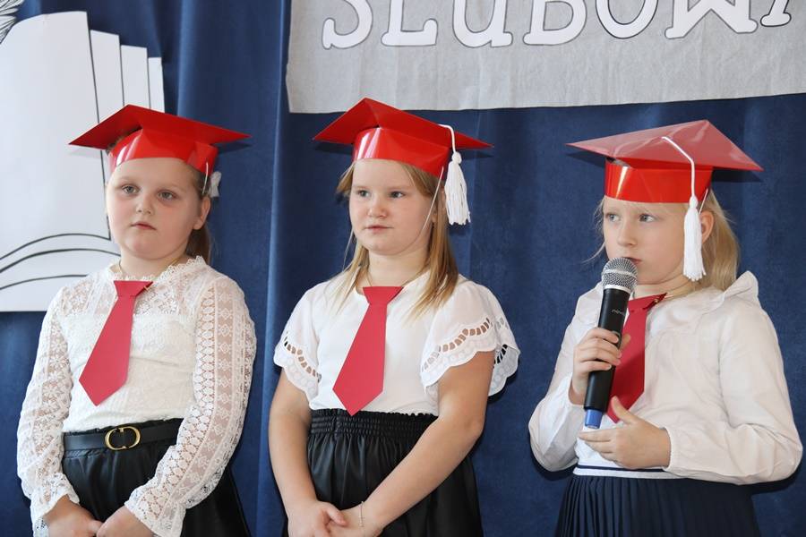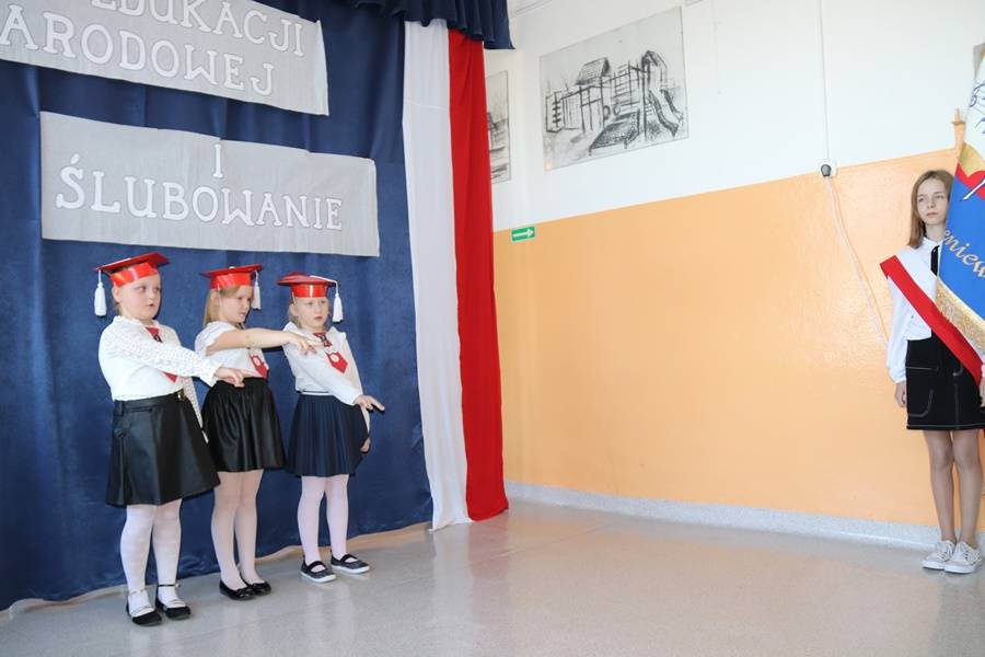Pierwszoklasistki w asyście starszych koleżanek i kolegów zaprezentowały krótki program artystyczny, w którym zdały pierwszy egzamin na ucznia. Śpiewająco odpowiadały na pytania dotyczące naszej ojczyzny, szkolnej nauki oraz zasad zachowania, pięknie recytowały wiersze i śpiewały. Wszyscy zgromadzeni na widowni zgodnie stwierdzili, że egzamin pięknie zdały i mogą już zostać przyjęte do braci uczniowskiej. Pierwszoklasistki ślubowały na sztandar szkoły, zaś Pani Dyrektor dokonała aktu pasowania na uczniów szkoły. Uczennice otrzymały pamiątkowe dyplomy i upominki. Głos zabrali również zaproszeni goście.