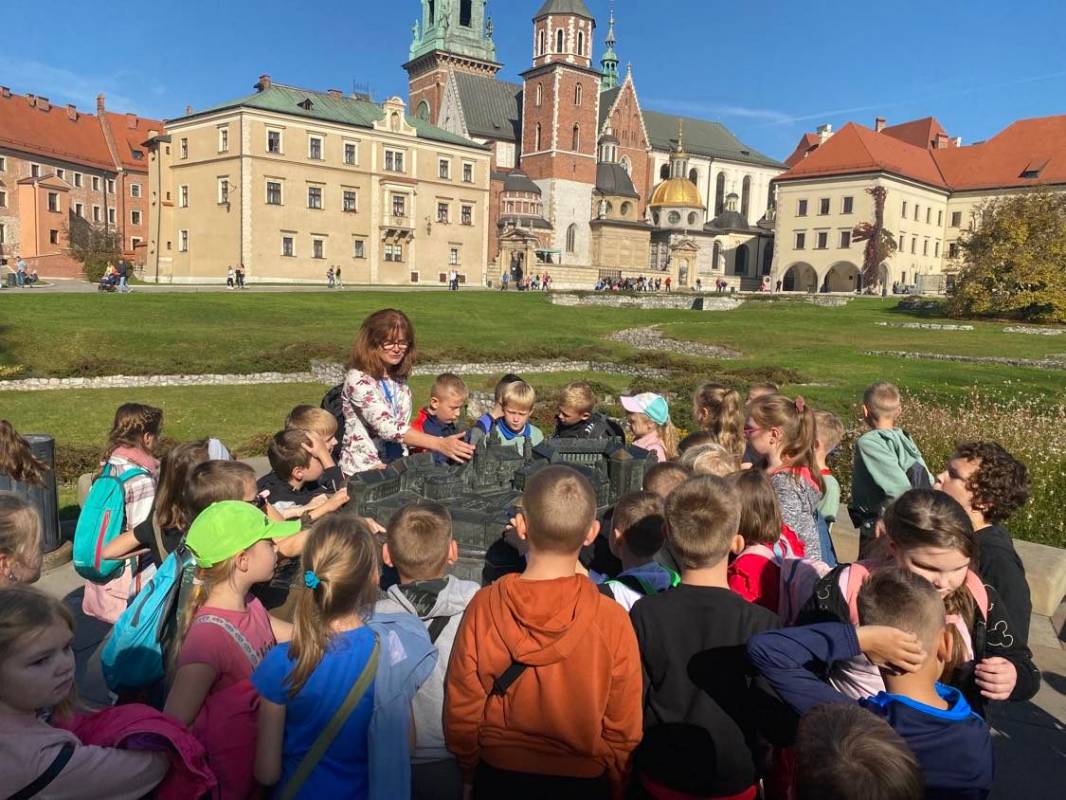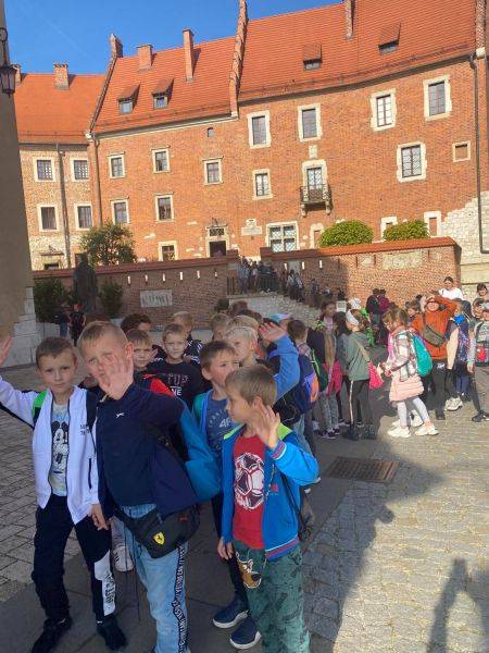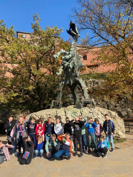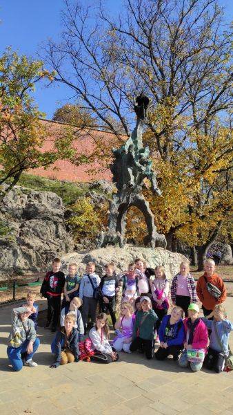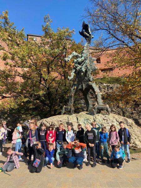 Autokar wyjechał z Gorzkowic o godz. 7.00. Dzieci były bardzo podekscytowane i radosne. Po przyjeździe do Krakowa, przywitała nas piękna i słoneczna pogoda, która towarzyszyła nam do samego końca. Wraz z przewodnikiem rozpoczęliśmy zwiedzanie Historycznego Zespołu Miasta. Niezapomniane wrażenie wywarł na uczniach widok Krakowa z wieży Dzwonu Króla Zygmunta, podobnie jak groby Królów Polskich i wielkich Polaków znajdujące się w Katedrze na Wawelu oraz dziedziniec i posąg Smoka Wawelskiego.