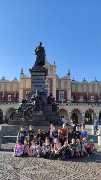 Z Wawelu udaliśmy się na przygotowany dla nas obiad w restauracji pod Smoczą Jamą. Po smacznym posiłku i odpoczynku wyruszyliśmy w doskonałym nastroju na dalsze zwiedzanie pięknymi i zabytkowymi ulicami Krakowa. W dalszej części wycieczki podziwialiśmy Rynek, Sukiennice, Pomnik Adama Mickiewicza, Kościół Mariacki. Dzieci miały okazję wysłuchać hejnału, po zakończeniu którego z radością pomachały hejnaliście. Wokół rynku mogły podziwiać również przejeżdżające piękne dorożki.