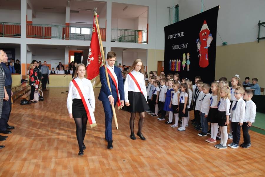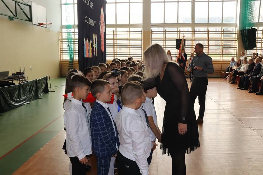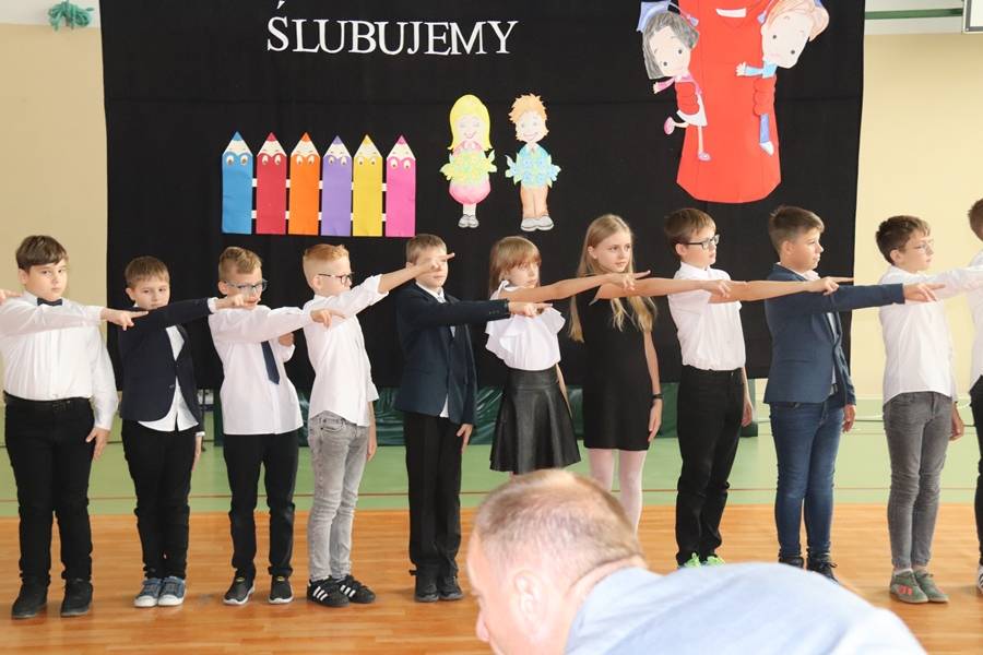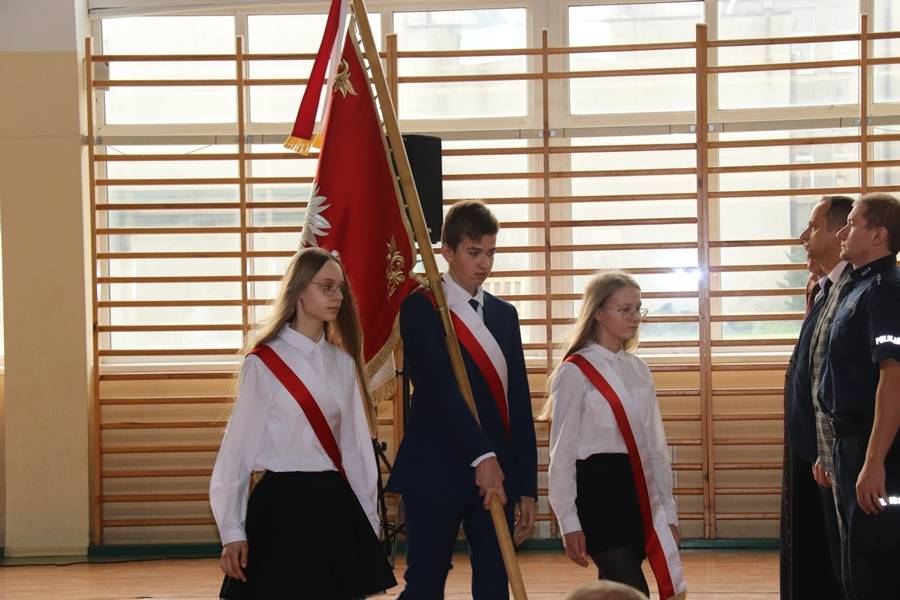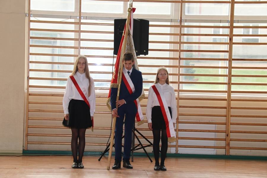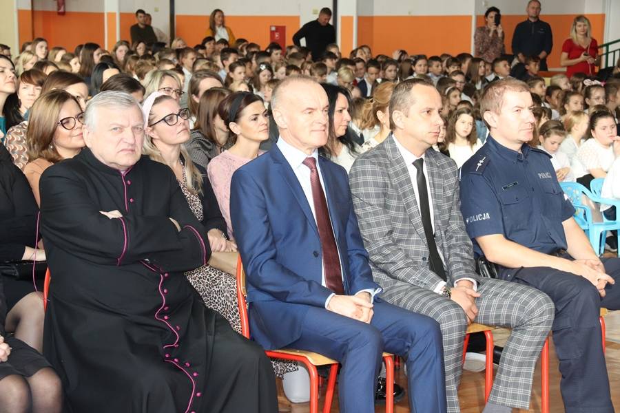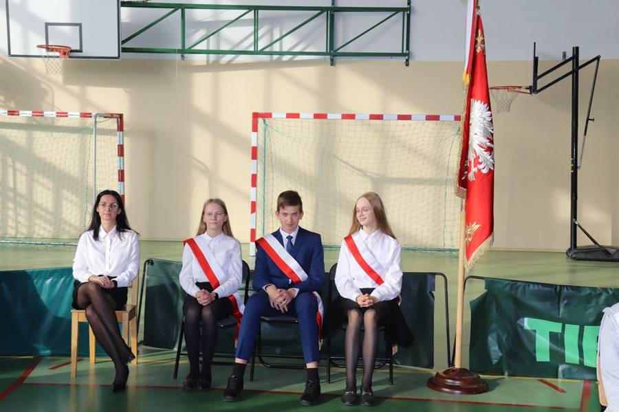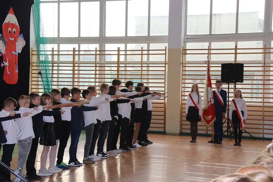 Kolejnym punktem uroczystości było zaprzysiężenie Samorządu Uczniowskiego. Gospodarze wszystkich klas w osobach: klasa VIII a - Bartosz Kiełbik, klasa VIII b - Igor Famulski klasa VIII c - Filip Szopa, klasa VIII d - Wiktoria Wędzonka, klasa VII a - Olivier Ryszka, klasa VI a - Bartosz Foksowicz, klasa VI b - Konrad Cichosz, klasa VI c - Filip Matuszczyk, klasa V a - Maciej Sikora, klasa V b - Alan Włóka, klasa IV a - Amelia Gwóźdź, klasa IV b - Piotr Łęgowiak, klasa IV c - Tymon Wlaźlak, klasa III a - Oskar Koryciński, klasa III b - Jakub Ziemba, klasa III c - Antoni Stasiak, klasa II a - Hanna Karlińska, klasa II b - Maja Krajewska, klasa II c - Oskar Sobieszek, klasa II d - Martyna Woźniak, klasa Ia - Aleksander Cichoń, klasa I b - Patryk Kordyzon, klasa I c - Pola Janiec złożyli uroczyste ślubowanie obiecując sumiennie wypełniać wszystkie obowiązki, jakie nakłada na nich szkoła, godnie reprezentować szkołę swoimi osiągnięciami