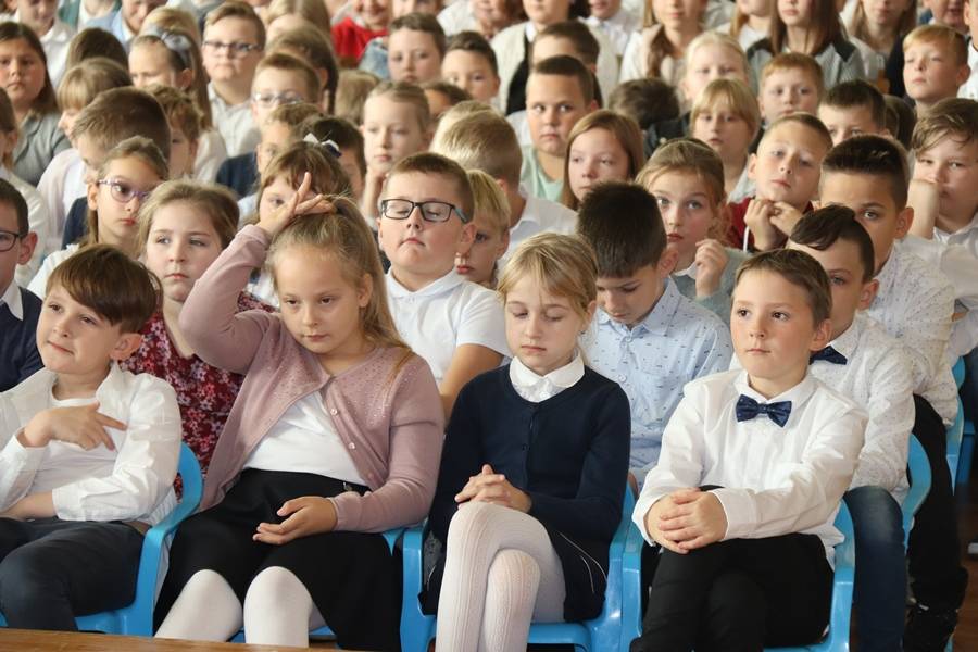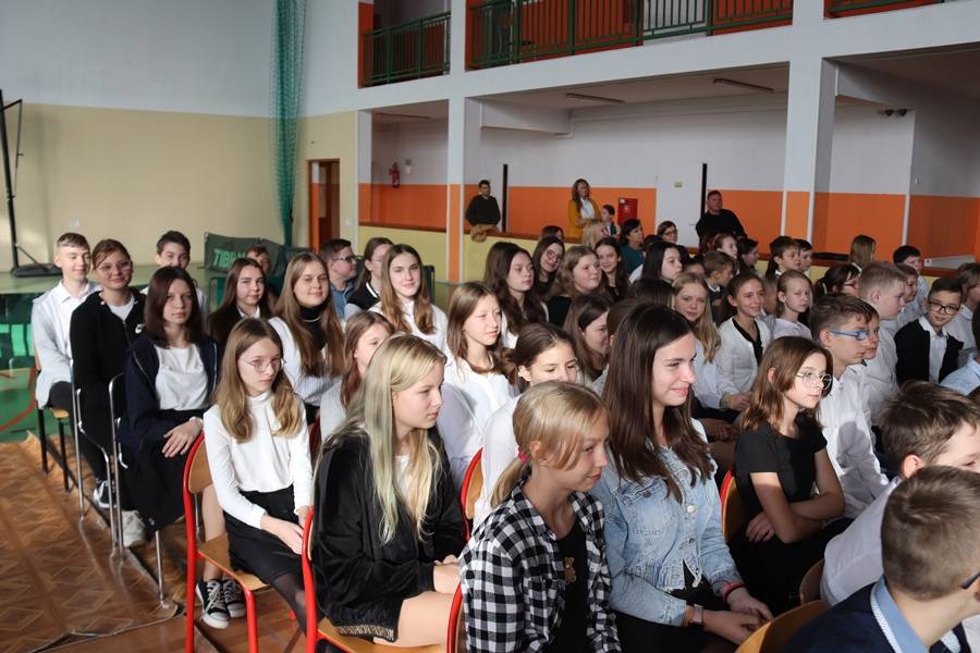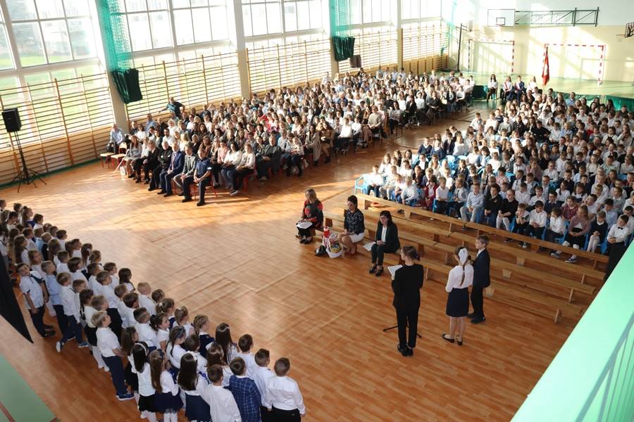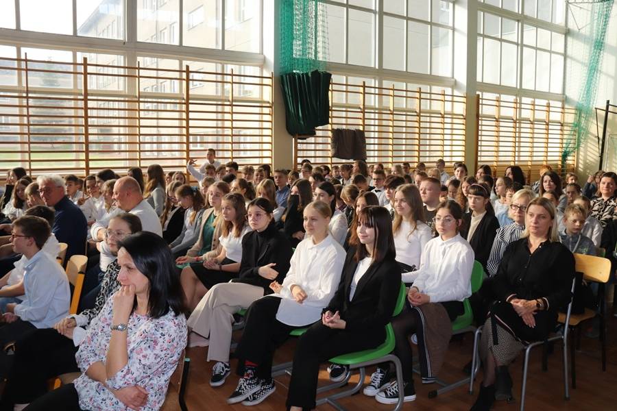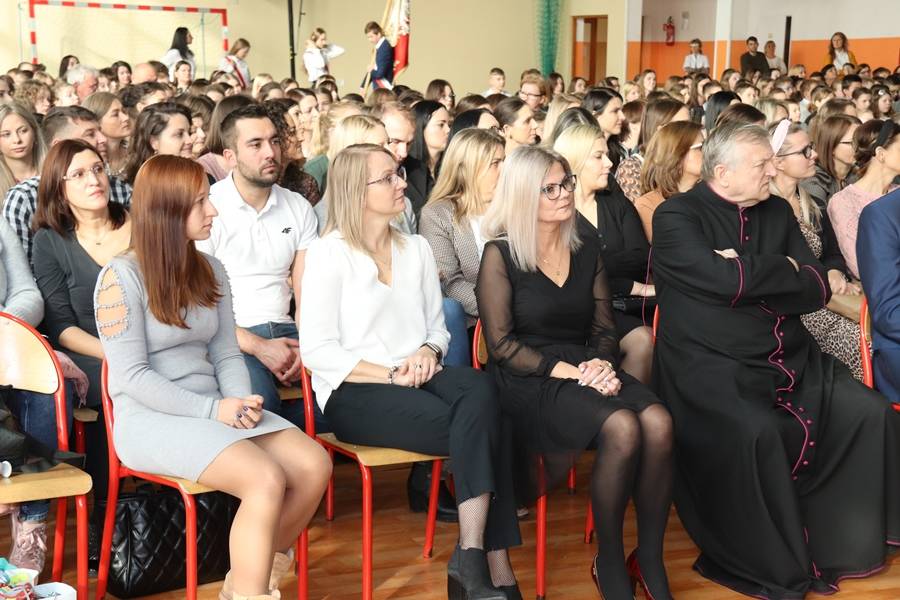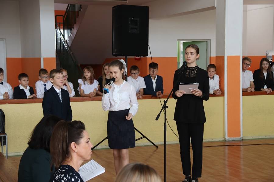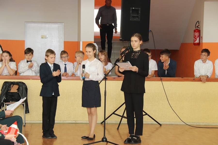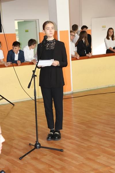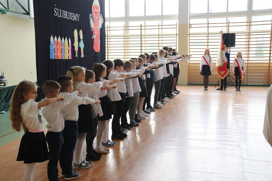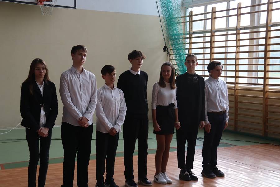 Kolejnym punktem uroczystości było zaprzysiężenie Samorządu Uczniowskiego. Gospodarze wszystkich klas w osobach: klasa VIII a - Bartosz Kiełbik, klasa VIII b - Igor Famulski klasa VIII c - Filip Szopa, klasa VIII d - Wiktoria Wędzonka, klasa VII a - Olivier Ryszka, klasa VI a - Bartosz Foksowicz, klasa VI b - Konrad Cichosz, klasa VI c - Filip Matuszczyk, klasa V a - Maciej Sikora, klasa V b - Alan Włóka, klasa IV a - Amelia Gwóźdź, klasa IV b - Piotr Łęgowiak, klasa IV c - Tymon Wlaźlak, klasa III a - Oskar Koryciński, klasa III b - Jakub Ziemba, klasa III c - Antoni Stasiak, klasa II a - Hanna Karlińska, klasa II b - Maja Krajewska, klasa II c - Oskar Sobieszek, klasa II d - Martyna Woźniak, klasa Ia - Aleksander Cichoń, klasa I b - Patryk Kordyzon, klasa I c - Pola Janiec złożyli uroczyste ślubowanie obiecując sumiennie wypełniać wszystkie obowiązki, jakie nakłada na nich szkoła, godnie reprezentować szkołę swoimi osiągnięciami