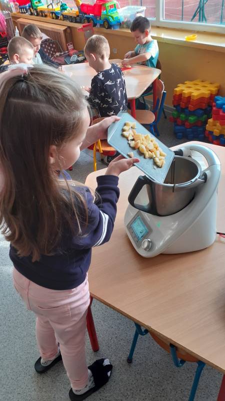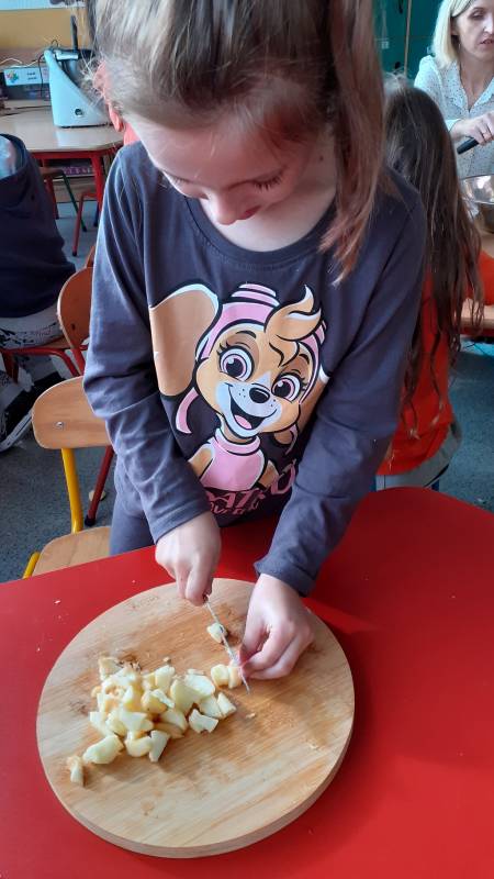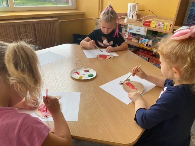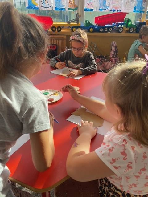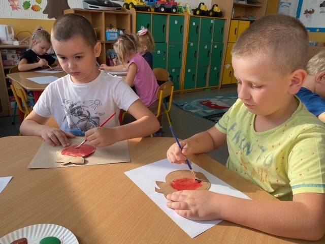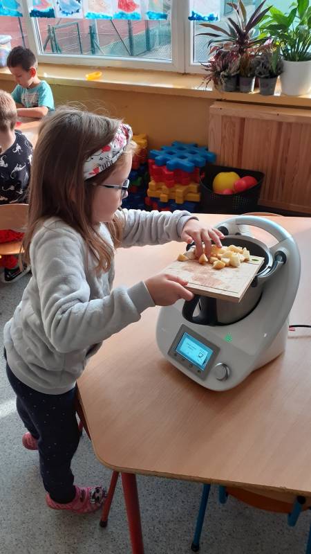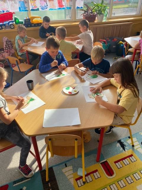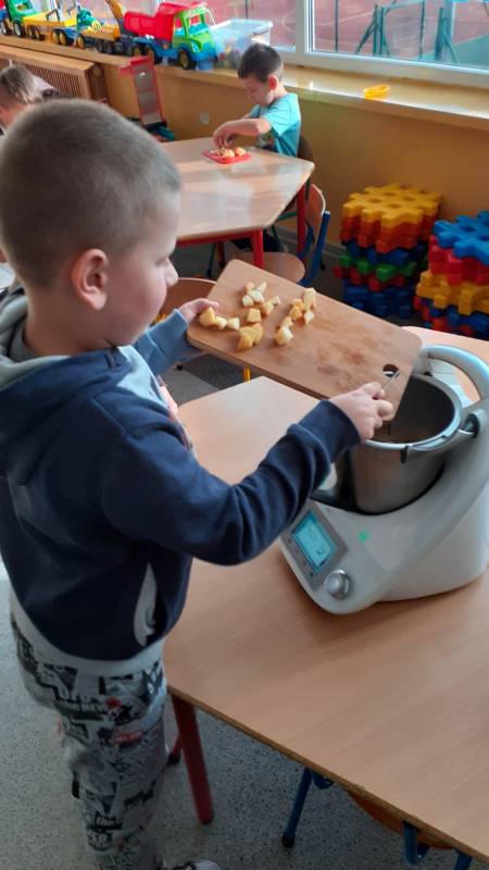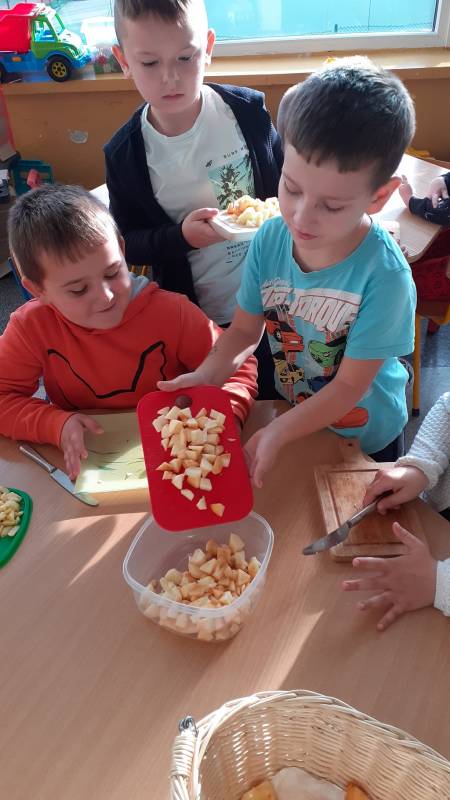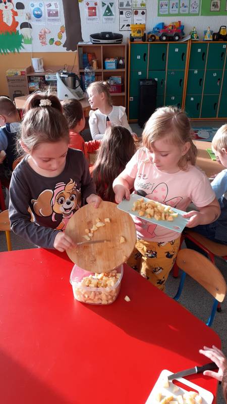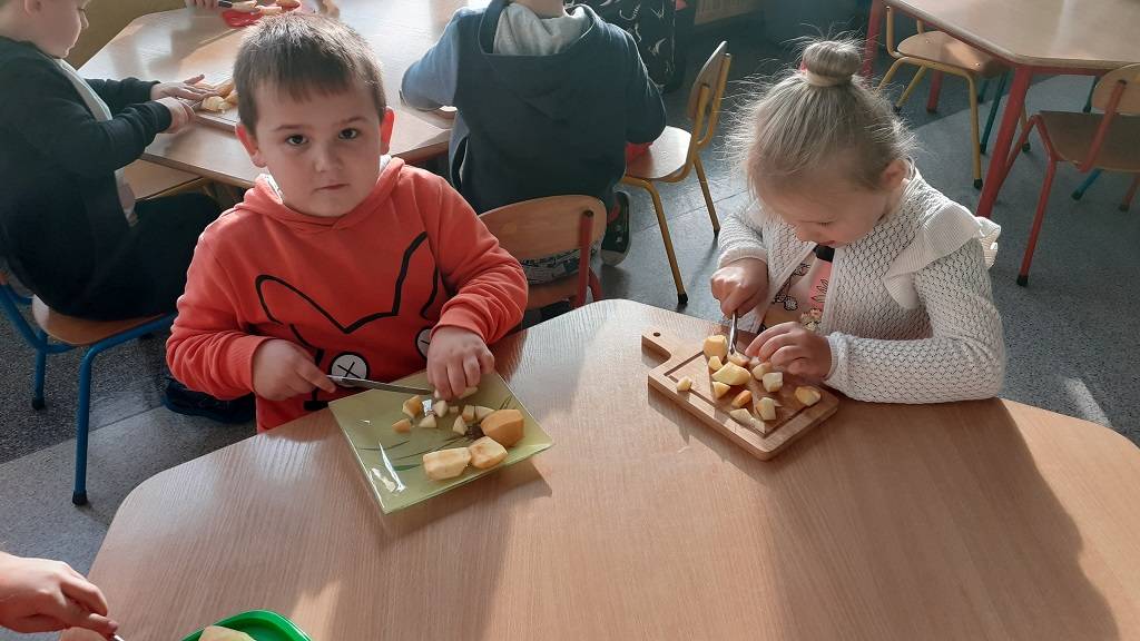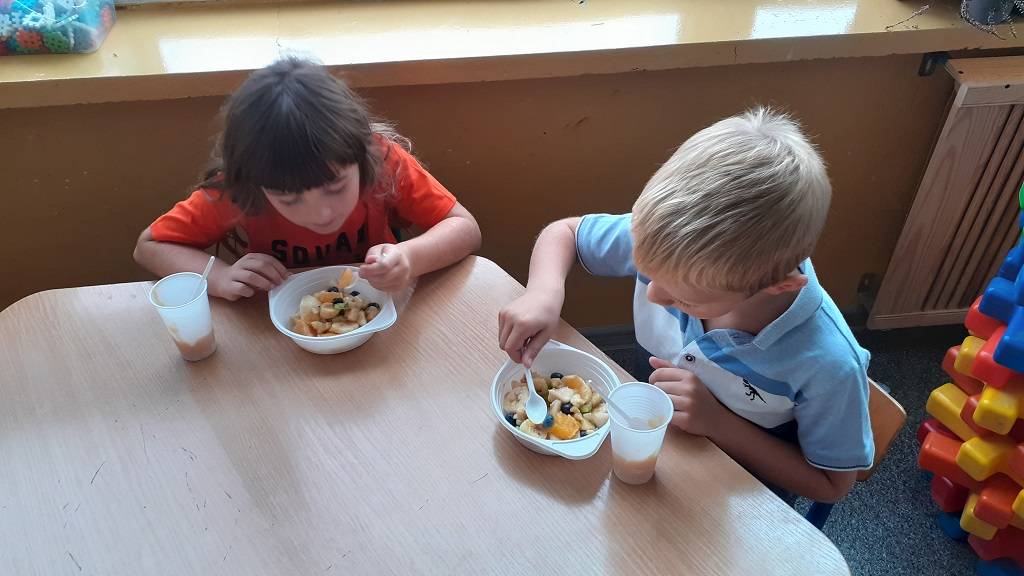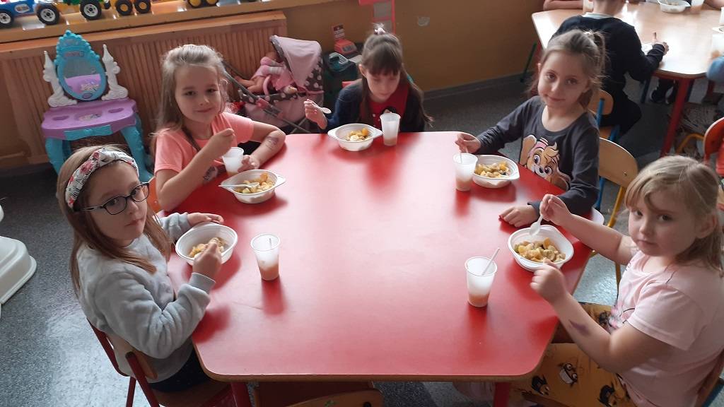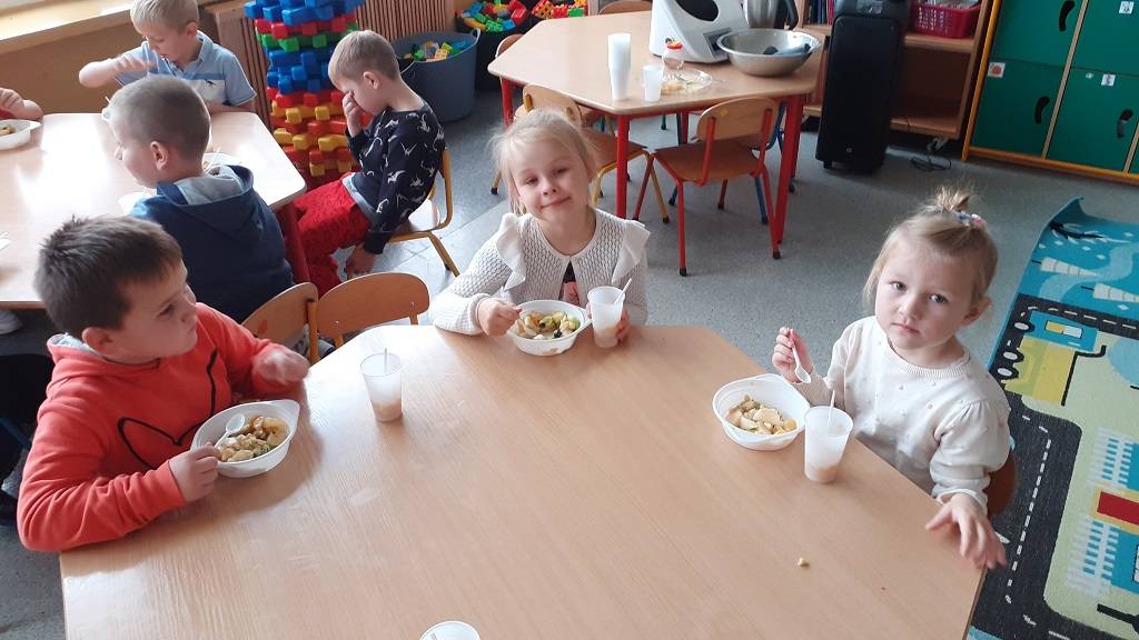 Z wielkim apetytem dzieci degustowały własnoręcznie przygotowaną sałatkę i mus owocowy. Była to prawdziwa bomba witaminowa, którą dzieci zjadły ze smakiem. Wykonaliśmy również pracę plastyczną przedstawiającą dowolne owoce. Braliśmy również udział w „owocowym konkursie”, odgadując, o jakim owocu opowiadają zagadki. Rozpoznawaliśmy też owoc i warzywa po kształtach i smakach – bawiliśmy się przy tym znakomicie i …smakowicie!