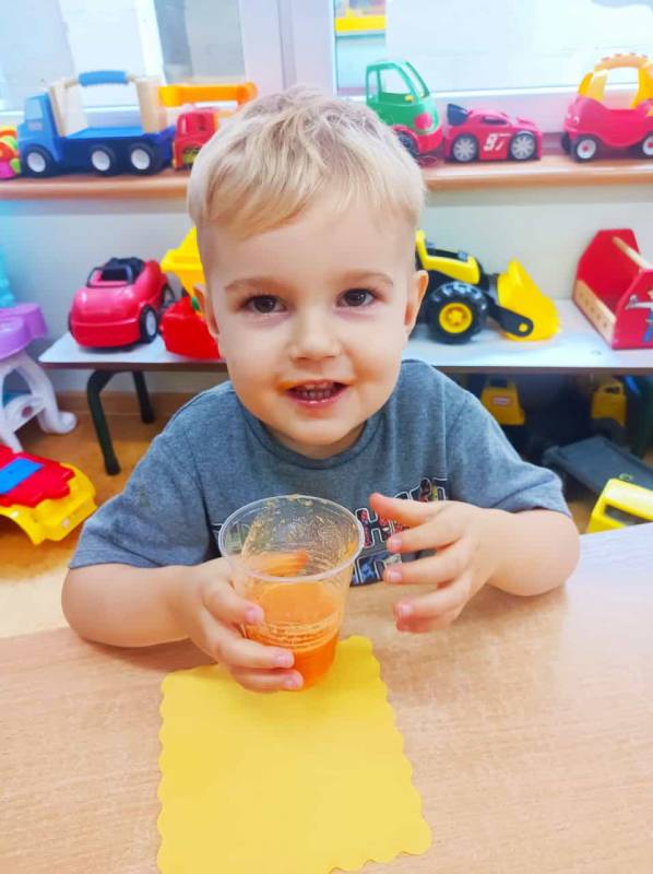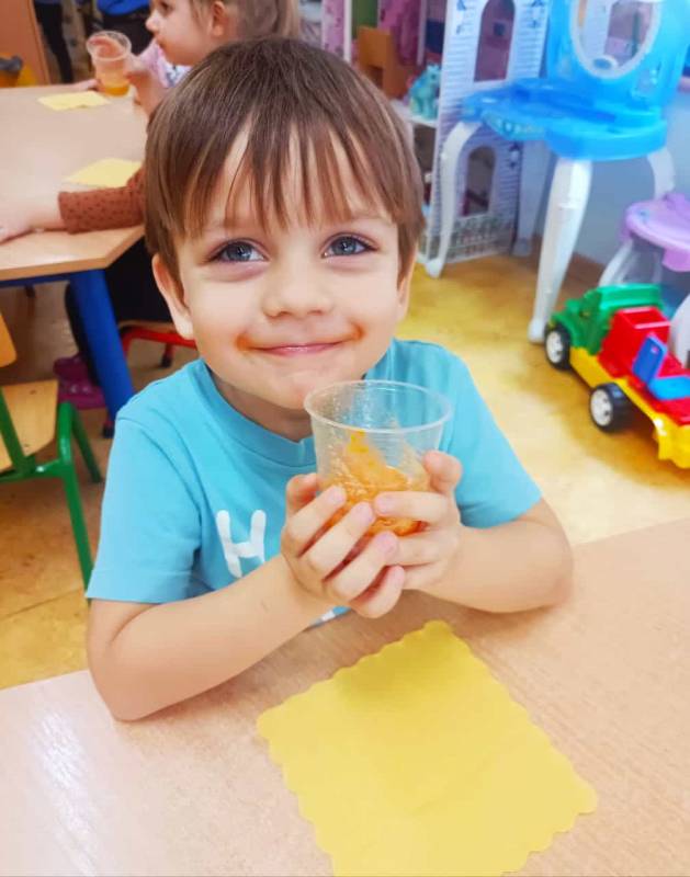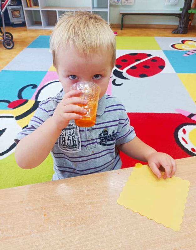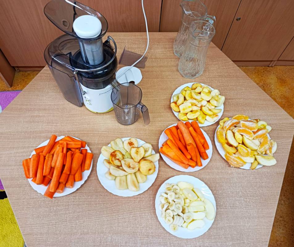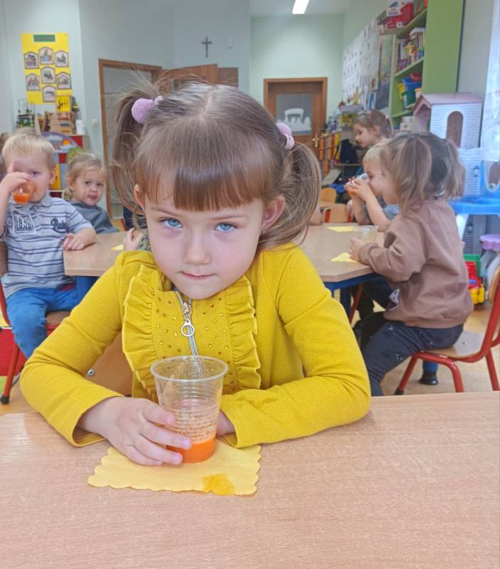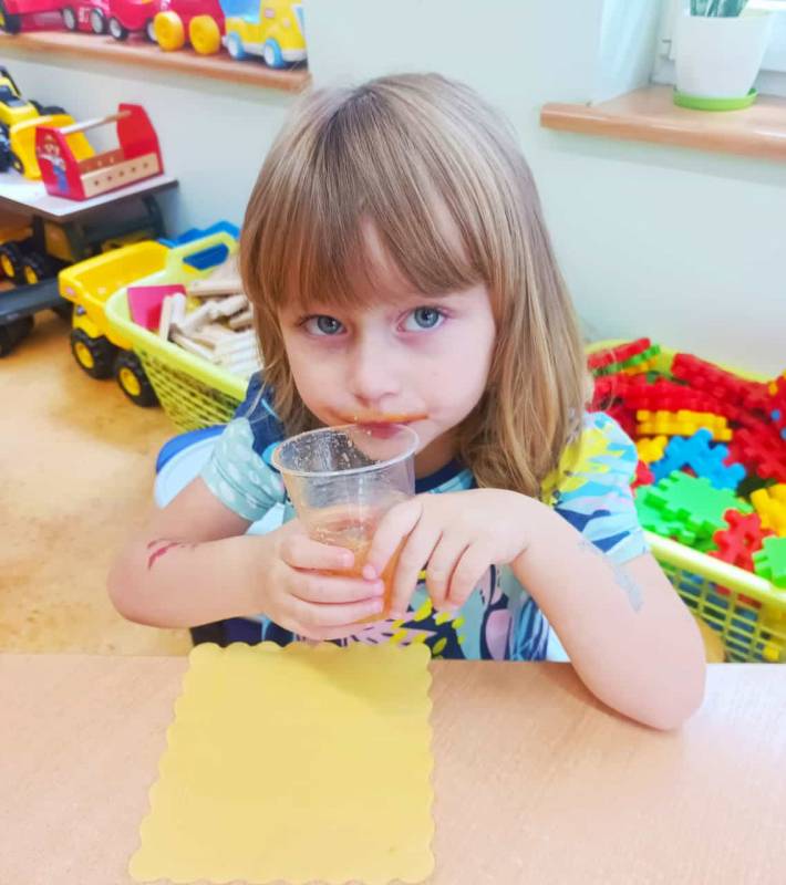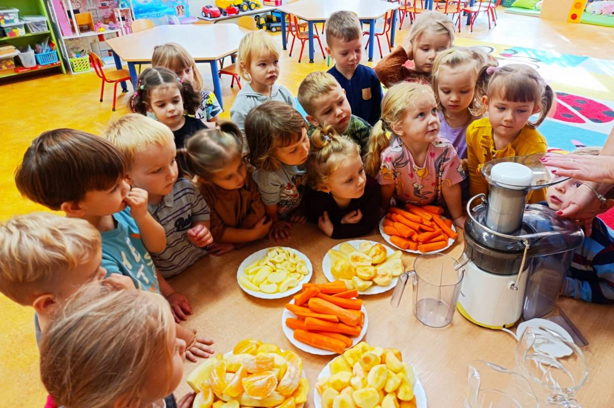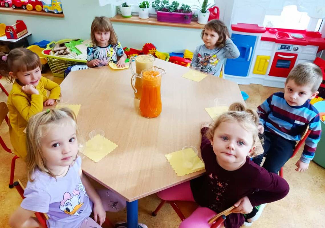 Dzieci pomagały w przygotowaniu soczku owocowo – warzywnego z przyniesionych przez rodziców owoców i warzyw. Było przy tym mnóstwo zabawy, a maluszki z apetytem wypiły świeży soczek, prosiły nawet o dokładki!