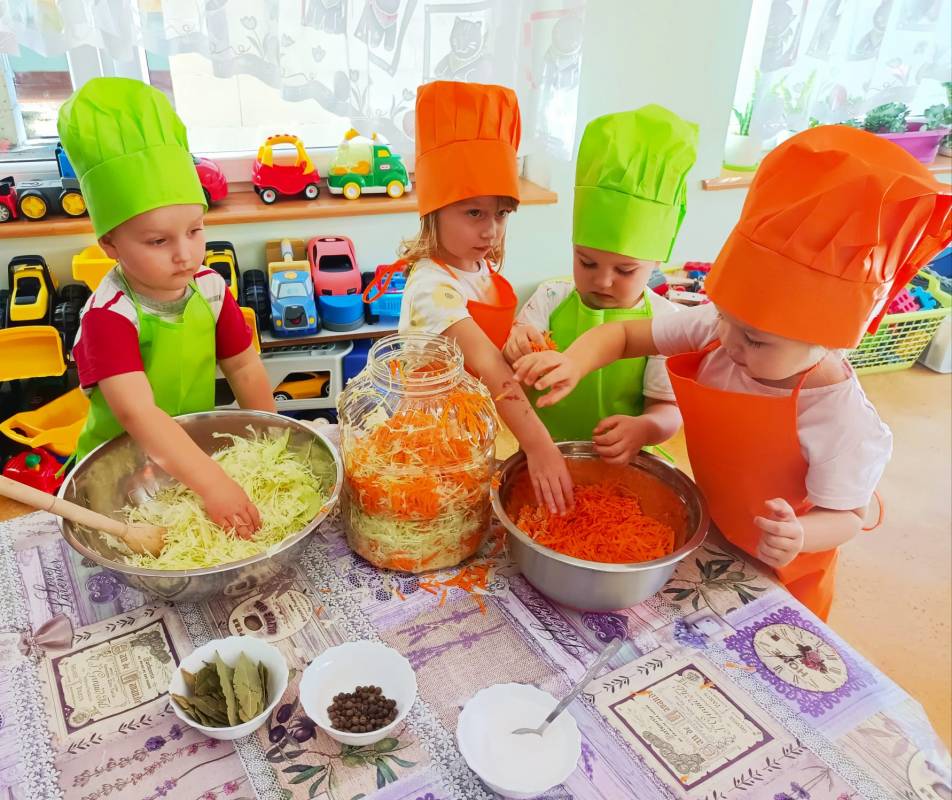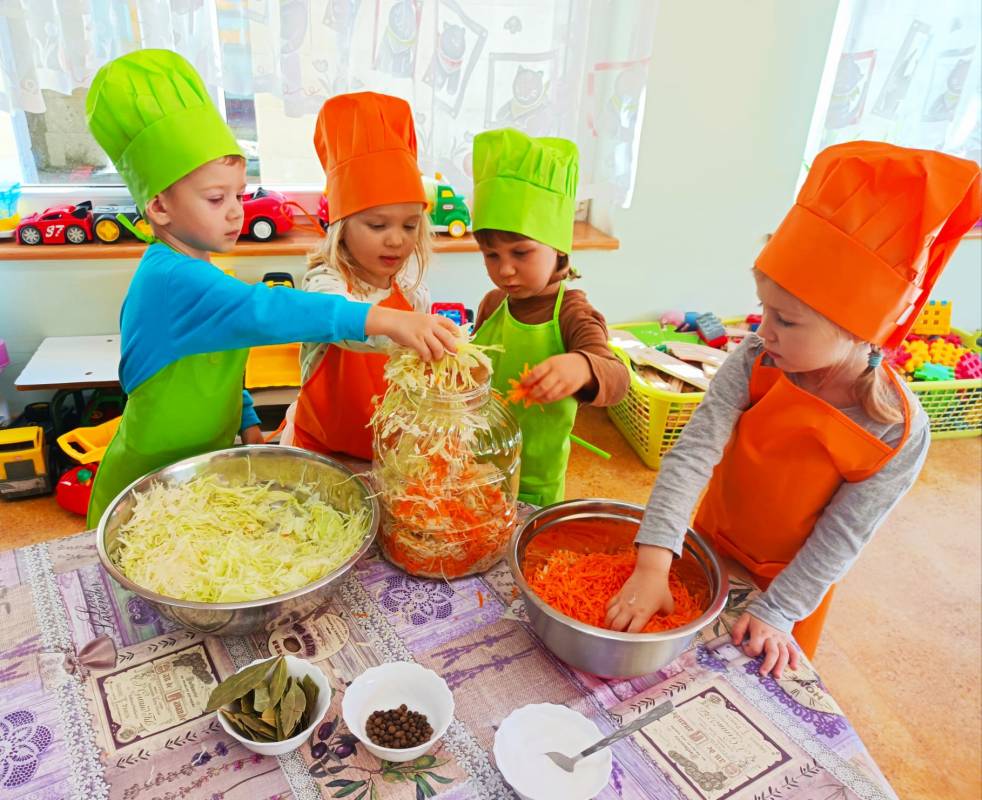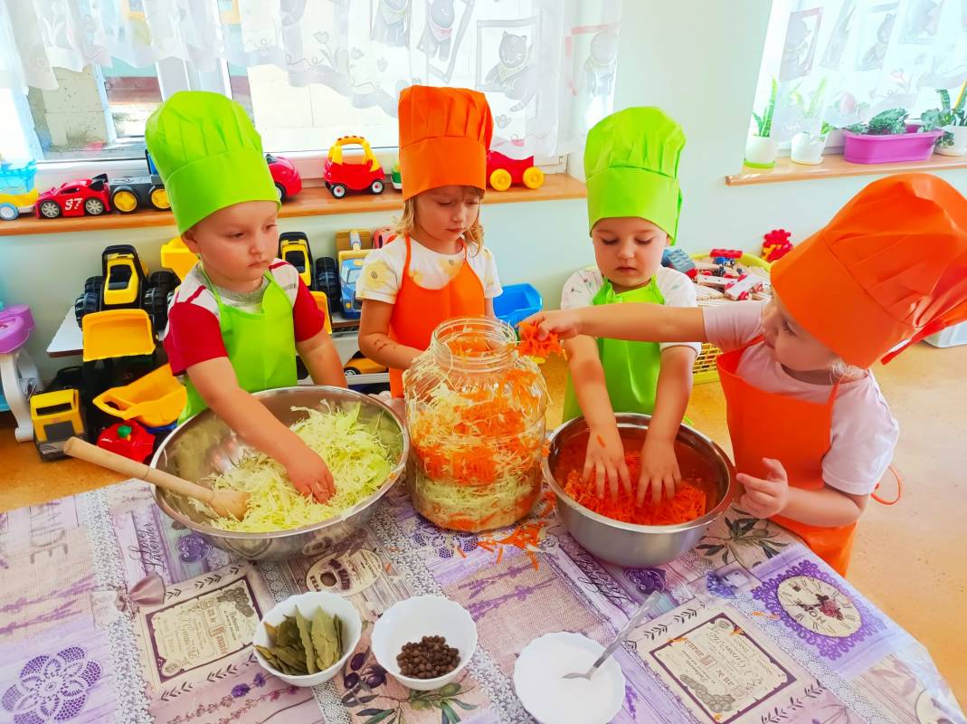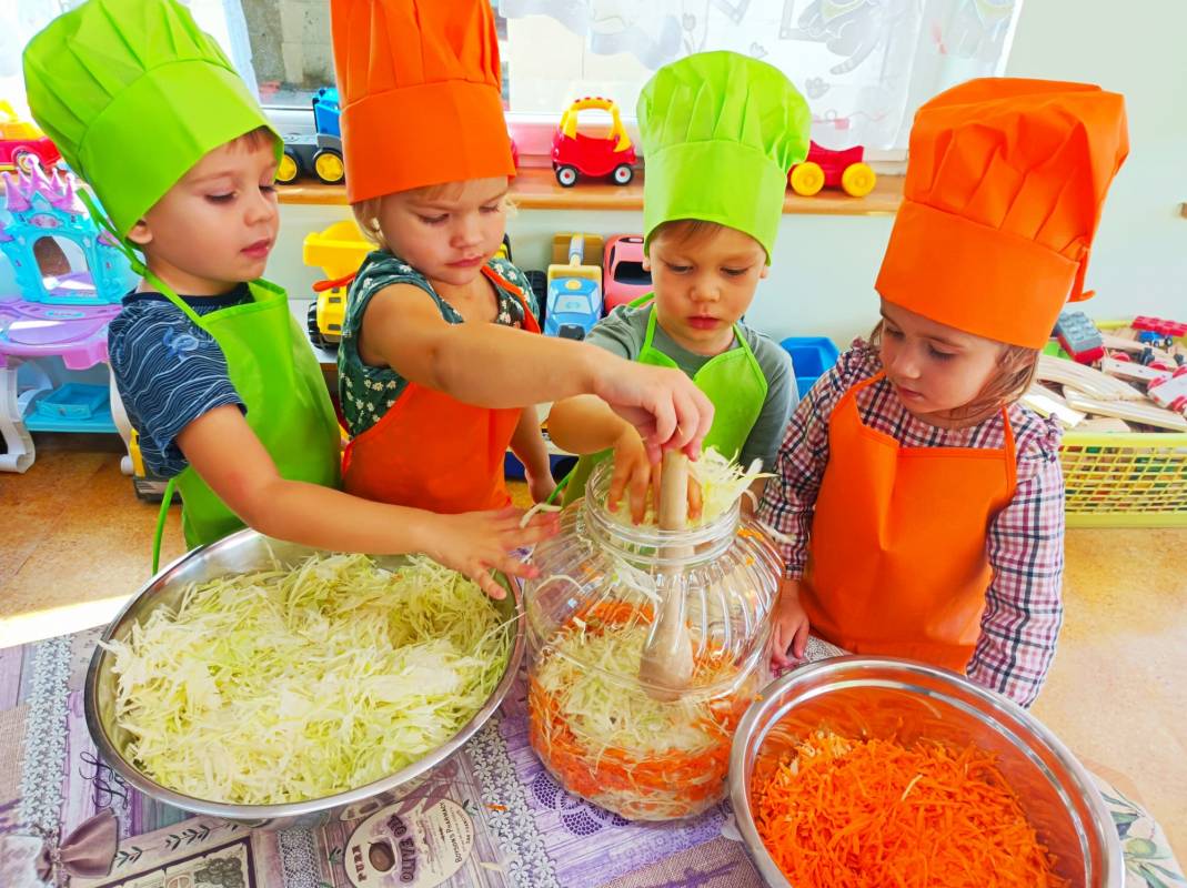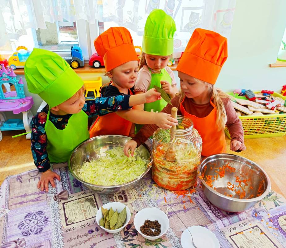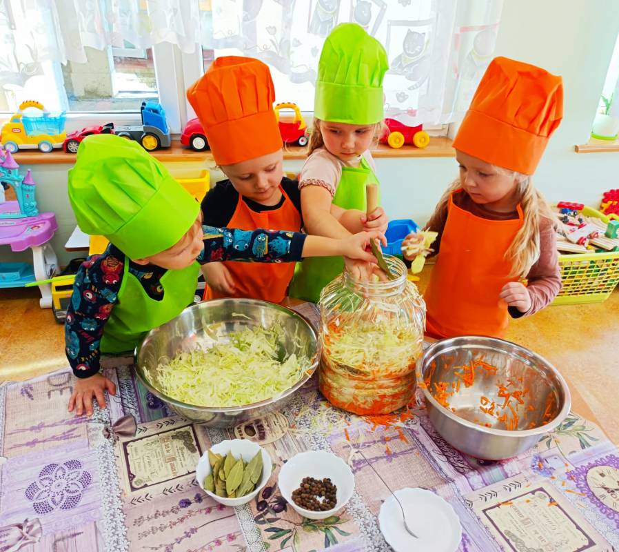 Kolejnym kulinarnym zajęciem było kiszenie kapusty. Poszatkowaną wcześniej przez panie kapustę maluszki wrzucały do przygotowanego w tym celu słoika, dodawały przyprawy i każdą warstwę posypywały solą. Dzieci wytrwale pracowały pod czujnym okiem swoich pań. Należy wspomnieć, że dzieciaki nie zapominały o jej dokładnym ugnieceniu w słoju tak, aż kapusta puściła sok.