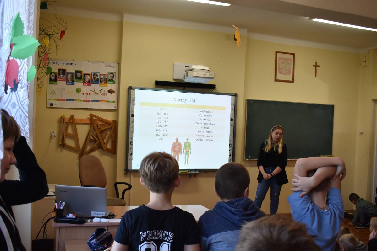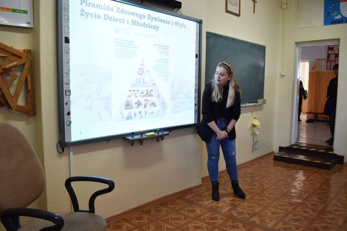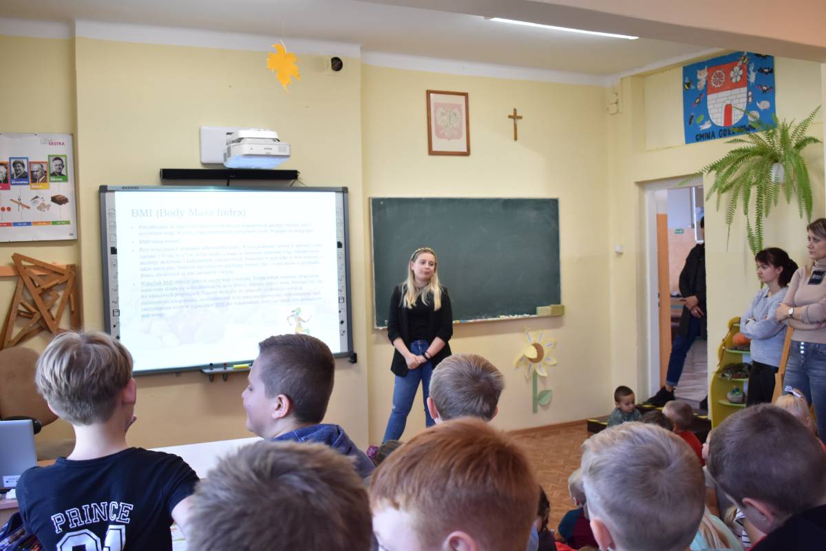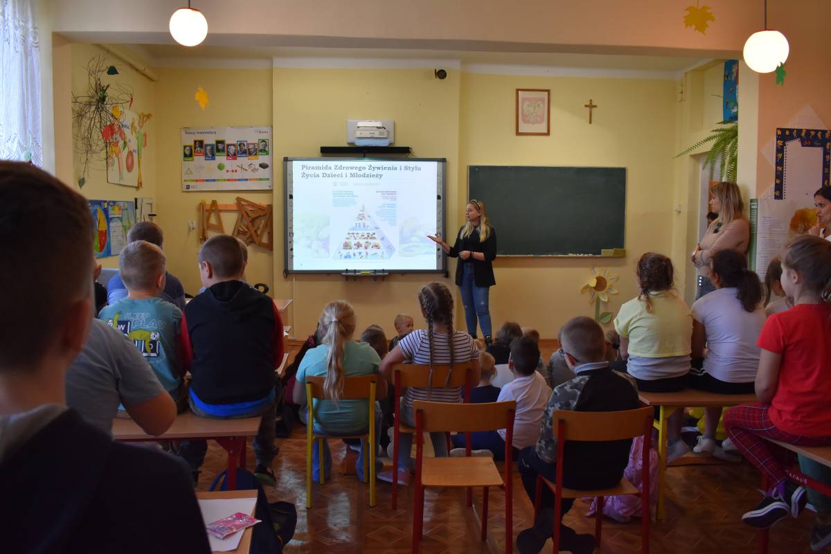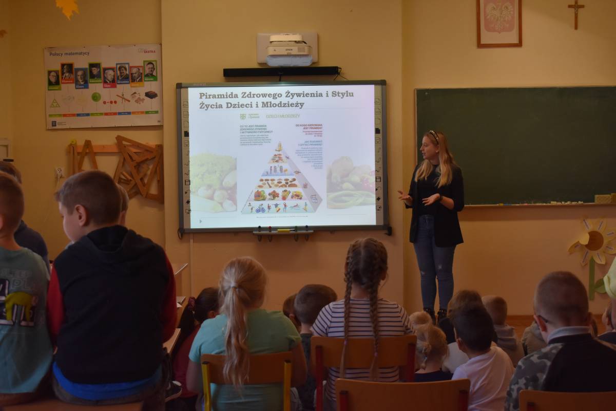 8 listopada 2022 roku w ramach projektu ,,(Nie) zwykła matematyka” gościliśmy w Szkole Podstawowej w Krzemieniewicach specjalistę w dziedzinie żywienia - panią dietetyk. Celem spotkania było zwrócenie uwagi na prawidłowe odżywianie, zdrowy styl życia, dietę dostosowaną dla dzieci w wieku szkolnym oraz zapobieganie uzależnieniom od słodyczy i niezdrowych napojów. Formą zajęć był interesujący wykład połączony z dyskusją na temat zasad prawidłowego odżywiania. Uczestnicy spotkania dowiedzieli się, jak ważną rolę w jadłospisie odgrywa dobrze skomponowane śniadanie, aby dostarczało niezbędnej energii na początek dnia oraz odpowiednich składników do prawidłowego rozwoju młodego organizmu. Dzieci uzyskały informacje, co powinny ze sobą zabierać do szkoły na drugie śniadanie oraz jakich produktów powinny unikać lub je ograniczać, by długo cieszyć się witalnością i dobrym samopoczuciem. Dietetyczka interesująco i przystępnie przekazała informacje, w jaki sposób zamieniać „złe" produkty na lepsze, małokaloryczne i zdrowe zamienniki. Uczniowie dowiedzieli się też, jak układać pełnowartościowy jadłospis na cały dzień, jak dużą wartość ma woda i ile należy jej wypijać. Specjalistka ds. żywienia zwróciła uwagę, jak ważną sprawą jest łączenie elementów zdrowego odżywiania z uprawianiem sportu. Dzieci dowiedziały się, co to są kalorie, jak je odczytywać z produktów i liczyć. Najmłodsi uczniowie naszej szkoły wykazali duże zainteresowanie i chętnie wypowiadali się na temat zdrowego stylu życia.