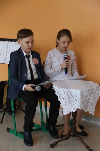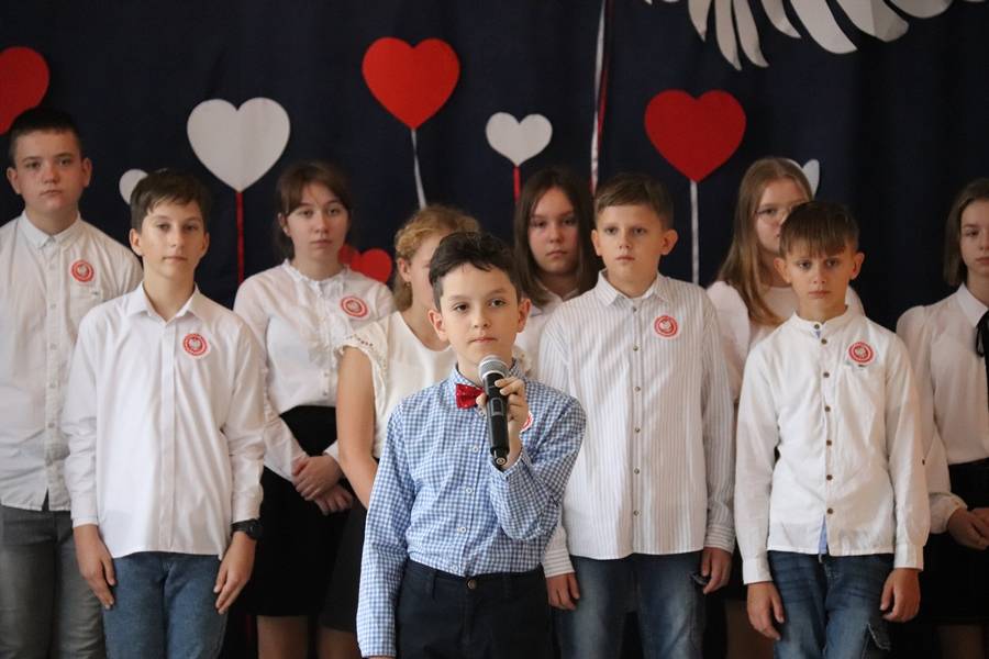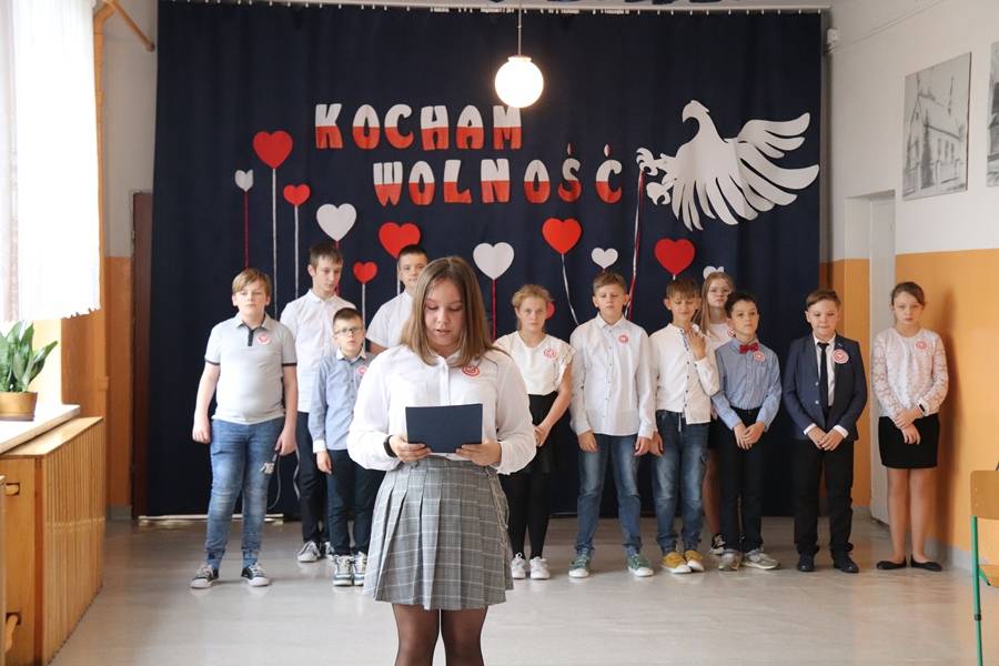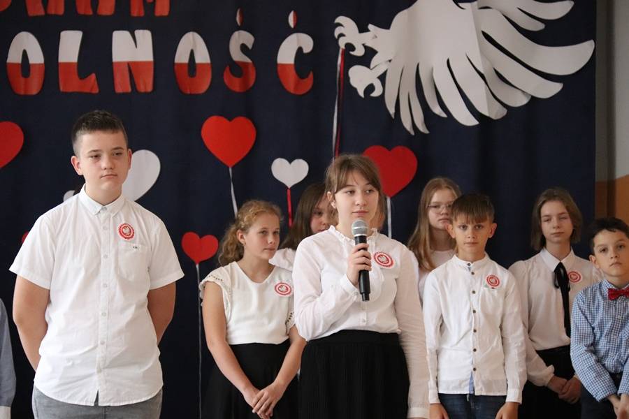 11 listopada to bardzo ważna data w historii naszego kraju. To święto upamiętniające odzyskanie niepodległości przez Polskę po 123 latach zaborów. Akademię rozpoczęliśmy od odśpiewania hymnu narodowego, realizując tym samym akcję MEN „Szkoła do hymnu”. Następnie staliśmy się widzami programu informacyjnego i wraz z prezenterami zajrzeliśmy do kart naszej historii. Padały znane nazwiska, daty, fakty historyczne. Reporterzy przenosili nas w różne miejsca i pokazywali, jak uroczyście i niebanalnie obchodzimy ten ważny dla każdego Polaka dzień. Mieliśmy okazję zajrzeć do szkoły czy amfiteatru, aby posłuchać recytacji pięknych wierszy i piosenek patriotycznych. Uatrakcyjnieniem przedstawienia był taniec z biało – czerwoną flagą, a także występ ucznia grającego na akordeonie. Całości dopełniała wymowna scenografia w polskich barwach narodowych.
