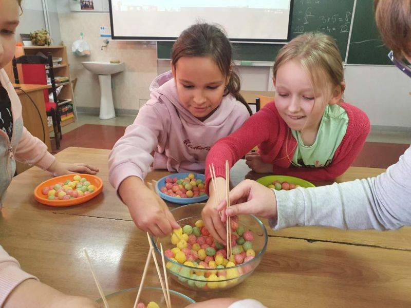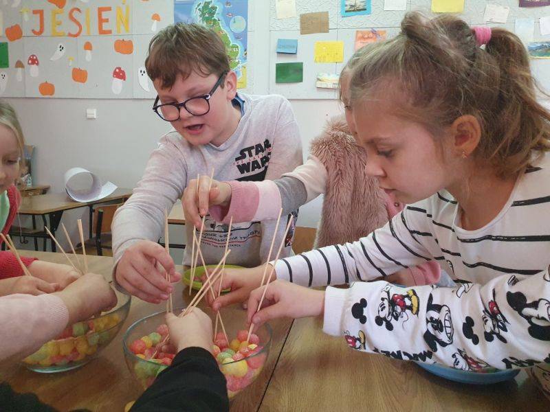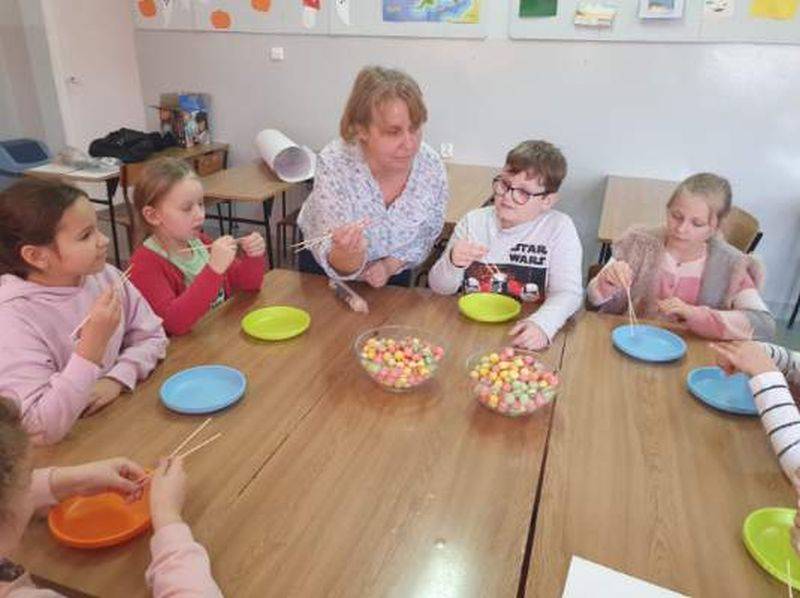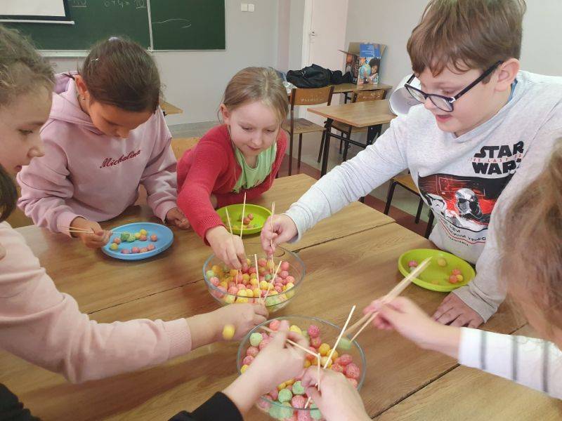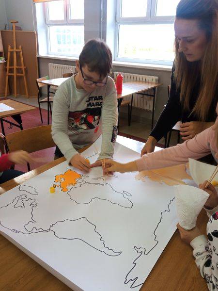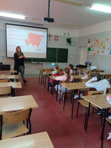 9 XI 2022 r. w naszej szkole odbyły się kolejne zajęcia innowacyjne pt. „Poznajemy kultury kontynentów”. Dzisiejsze zajęcia miały na celu poszerzenie wiedzy o krajach azjatyckich. Wspólnie odkrywaliśmy najbardziej zaludniony kontynent, czyli Azję. Zapoznaliśmy się z geografią, przyrodą, kulturą, po trosze też z historią tej egzotycznej części świata. Realizacja treści zakładała wszechstronną aktywność dzieci. Uczniowie podejmowali różnorakie działania w trakcie zajęć , m. in. wykazali się ogromną cierpliwością i zwinnością przenosząc kukurydziane kulki pałeczkami oraz zdolnościami plastycznymi, malując inicjały swojego imienia zgodnie ze znakami alfabetu japońskiego. Przyklejone zostały także kontury kontynentu Azji na specjalnie przygotowanej mapie świata. Z pomocą globusa interaktywnego poznawaliśmy: kraje, świat zwierząt, powierzchnie, liczby ludności, waluty, język, terytoria, wysokości oraz inne ciekawostki. Dzieci miały przy tym mnóstwo zabawy połączonej z nauką. Przed nami do odkrycia jeszcze wiele innych kontynentów…