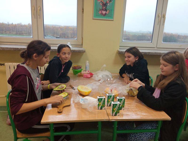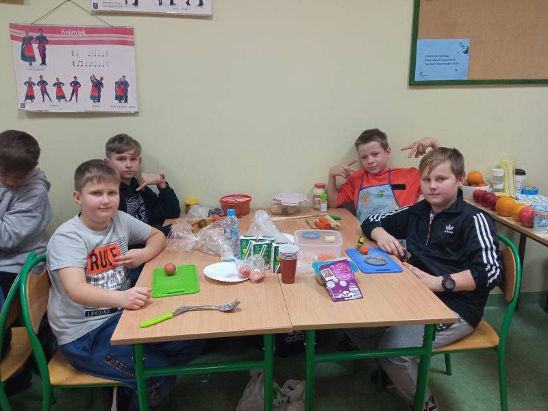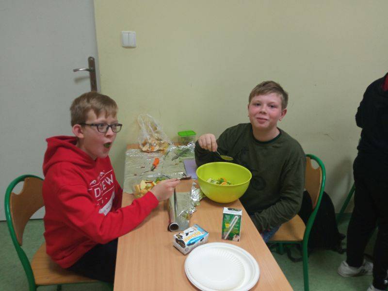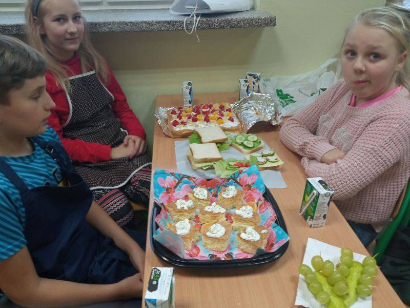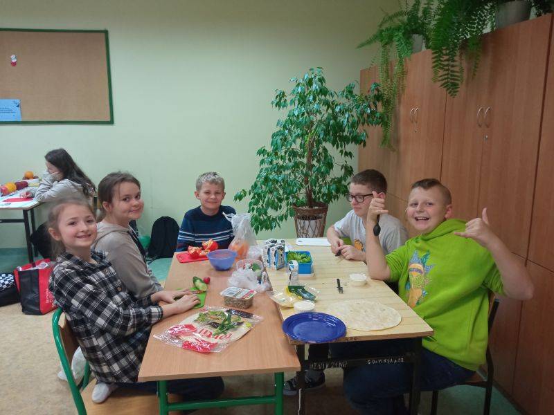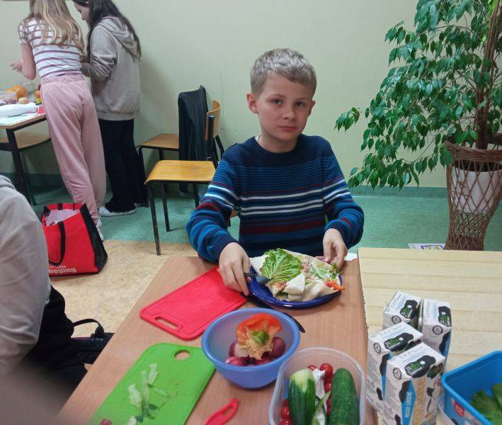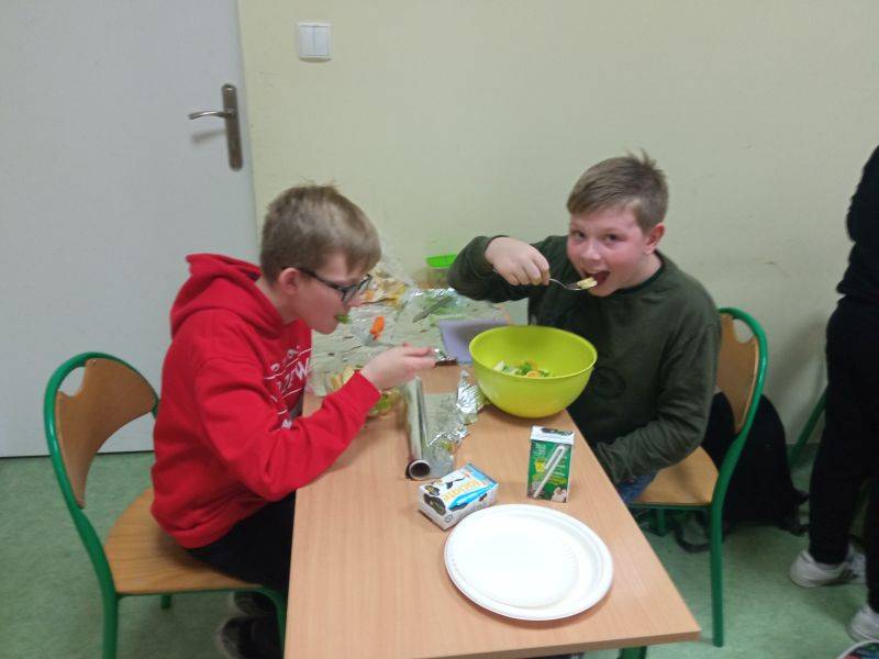Następnie uczniowie wzięli udział w projekcji filmu edukacyjnego prowadzonego przez kucharza Pana Grzegorza Łapanowskiego. Korzystając ze zdobytej wiedzy uczniowie klasy 5b w ramach warsztatów kulinarnych przygotowali zdrowe przekąski, sałatki i desery.