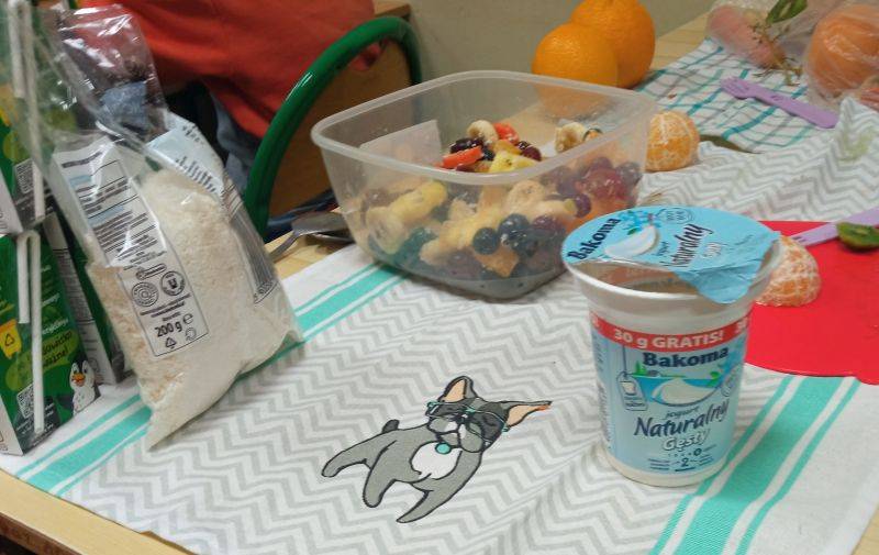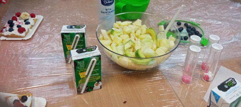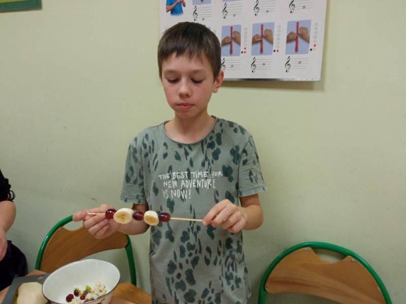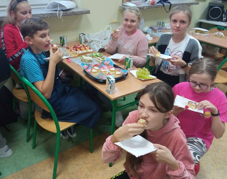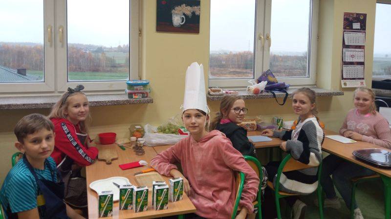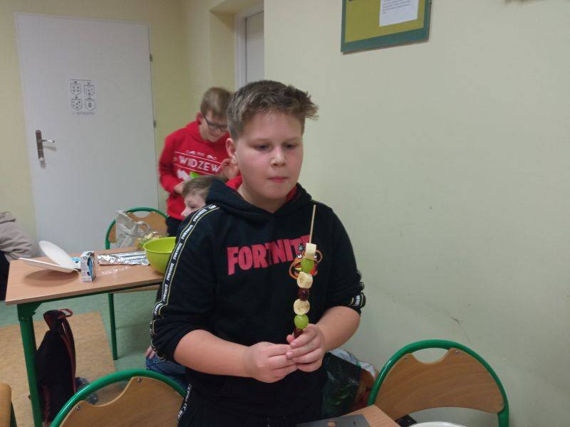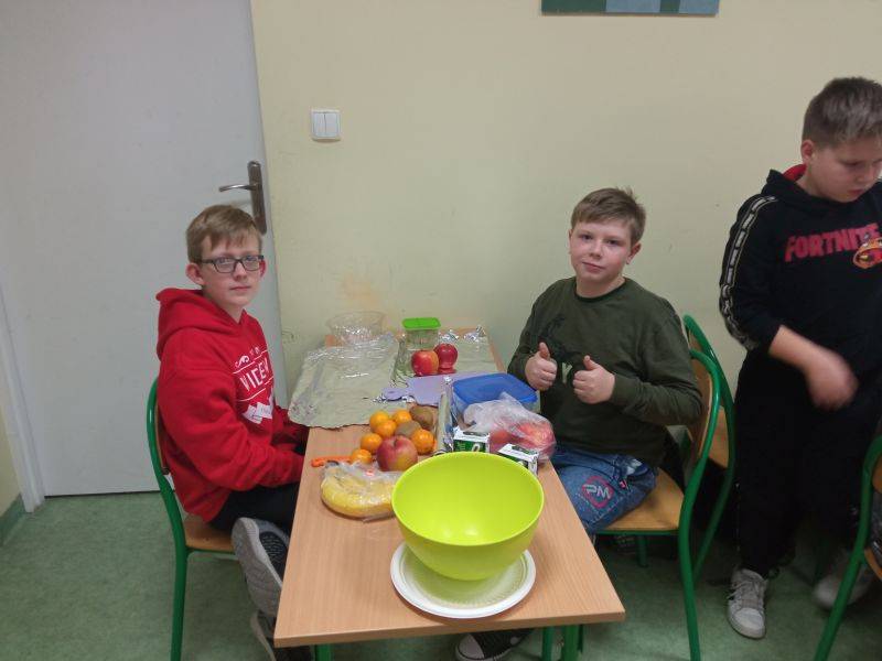 Następnie uczniowie wzięli udział w projekcji filmu edukacyjnego prowadzonego przez kucharza Pana Grzegorza Łapanowskiego. Korzystając ze zdobytej wiedzy uczniowie klasy 5b w ramach warsztatów kulinarnych przygotowali zdrowe przekąski, sałatki i desery.