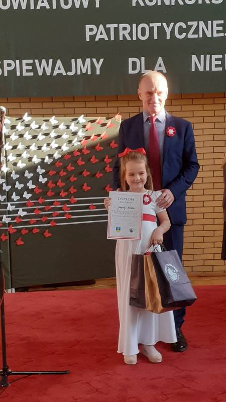 W dniu 20 listopada 2022r odbyła się II edycja Powiatowego Konkursu Piosenki Patriotycznej „Śpiewajmy dla Niepodległej”, organizowana przez Starostwo Powiatowe w Piotrkowie Trybunalskim przy współudziale Gminy Łęki Szlacheckie oraz Szkoły Podstawowej im. Marii Konopnickiej w Łękach Szlacheckich. Uczestnikami konkursu byli artyści amatorzy w wieku przedszkolnym i szkolnym z terenu Powiatu Piotrkowskiego. Celem konkursu było wspieranie osób uzdolnionych wokalnie, propagowanie kultury muzycznej wśród dzieci i młodzieży, promocja twórczości dziecięcej, promocja młodych wykonawców, rozwijanie talentów estradowych. Konkurs został przeprowadzony wg.czterech kategorii wiekowych. Przedszkole Samorządowe w Gorzkowicach reprezentowała Jagoda Nowak, która otrzymała wyróżnienie w I kat.wiekowej – 3-6 lat. Jagodzie bardzo gratulujemy i życzymy dalszych sukcesów !!!