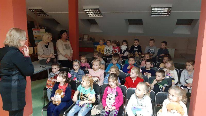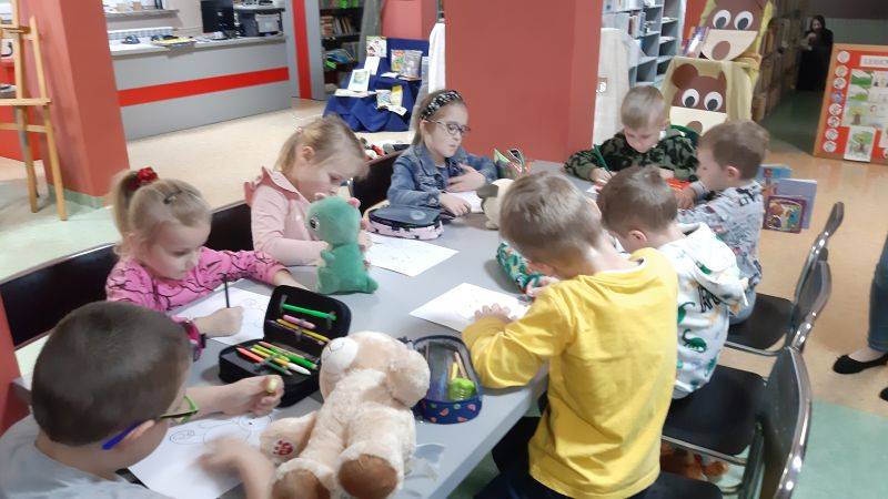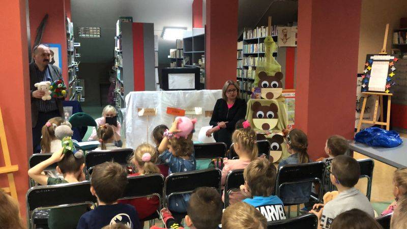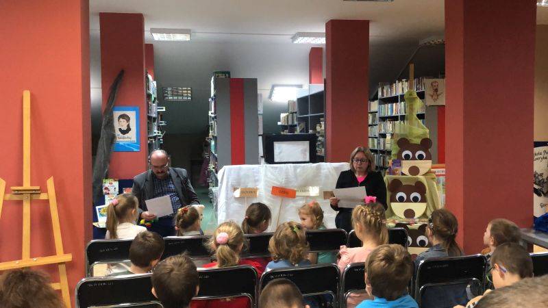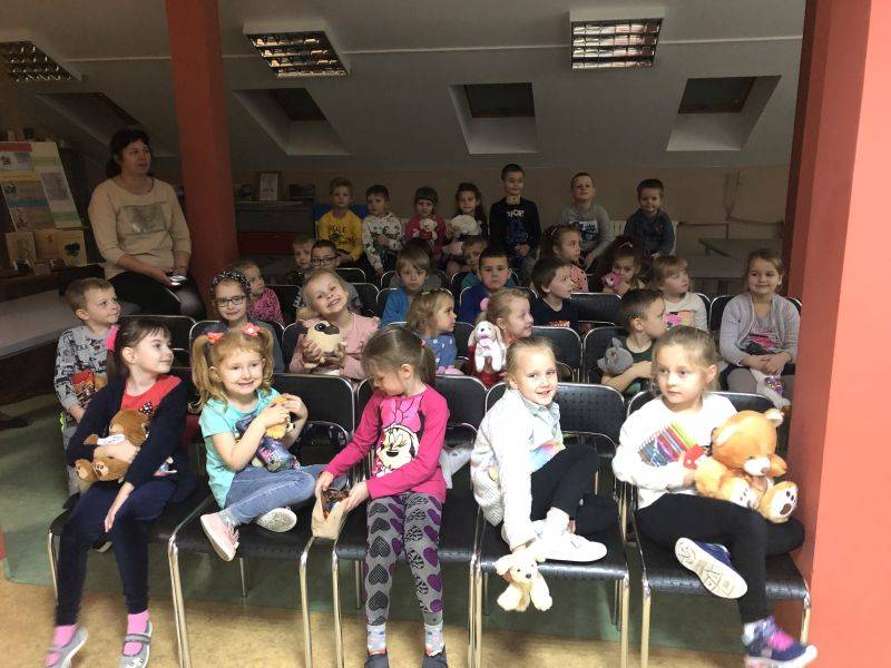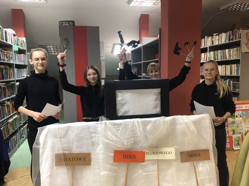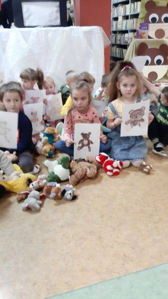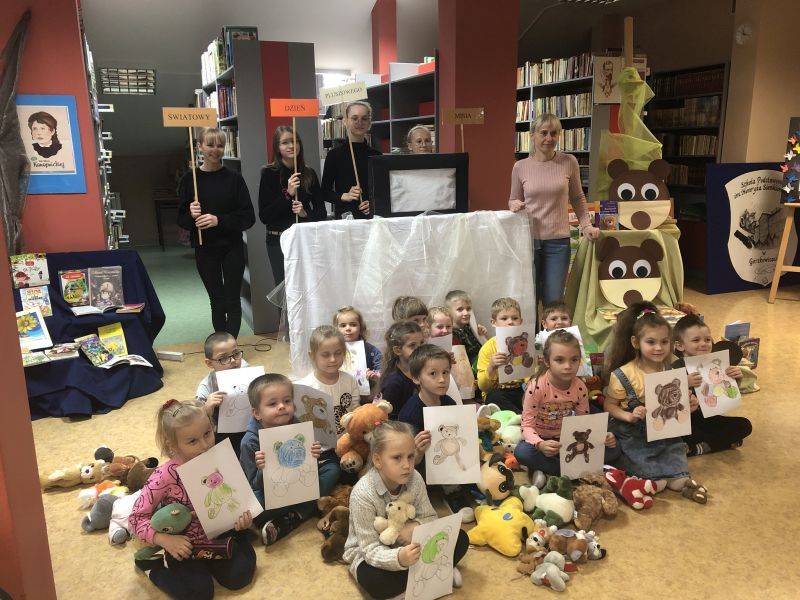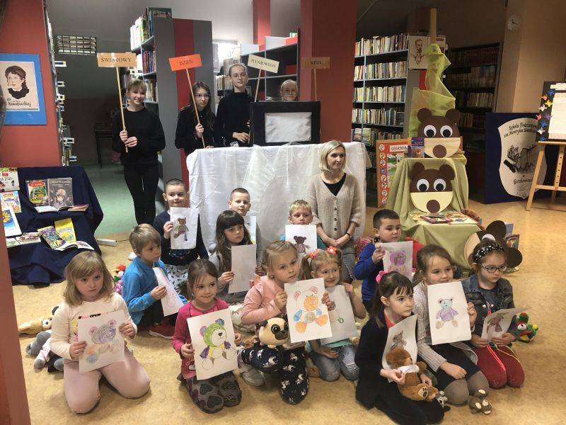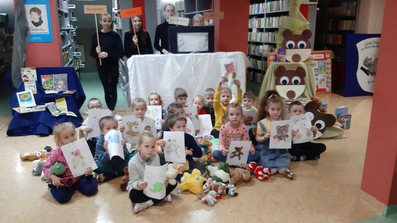 Z okazji Światowego Dnia Pluszowego Misia dzieci z grupy „Muchomorki” i grupy „Żabki” uczestniczyły we wspólnej zabawie w bibliotece szkolnej. Przedszkolaki poznały historię powstania pierwszego pluszowego misia, którą pokazaliśmy za pomocą teatrzyku cieni, rozpoznawały sławne misie, które są bohaterami filmowymi i literackimi. Z zapałem uczestniczyły w przygotowanych zabawach i konkursach, rozwiązywały zagadki. W czasie uroczystości obejrzały wystawę książek oraz pluszowych misiów. Po wysłuchaniu opowiadania „Stary, zielony miś” obiecały, że zawsze będą dbać i troszczyć się o swoje pluszaki i przytulać je.