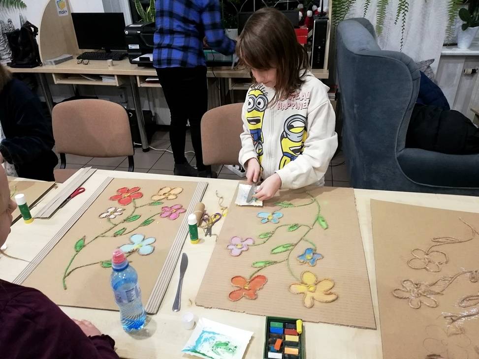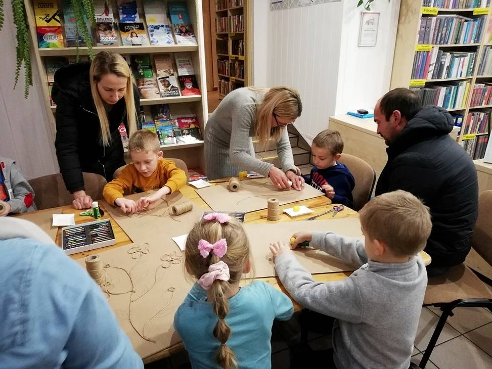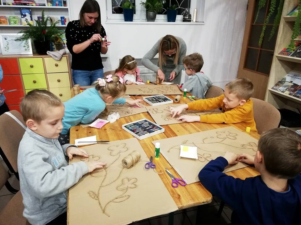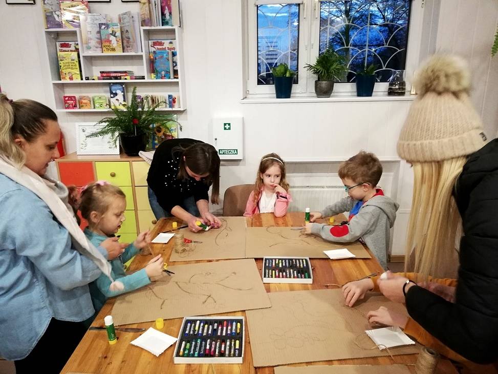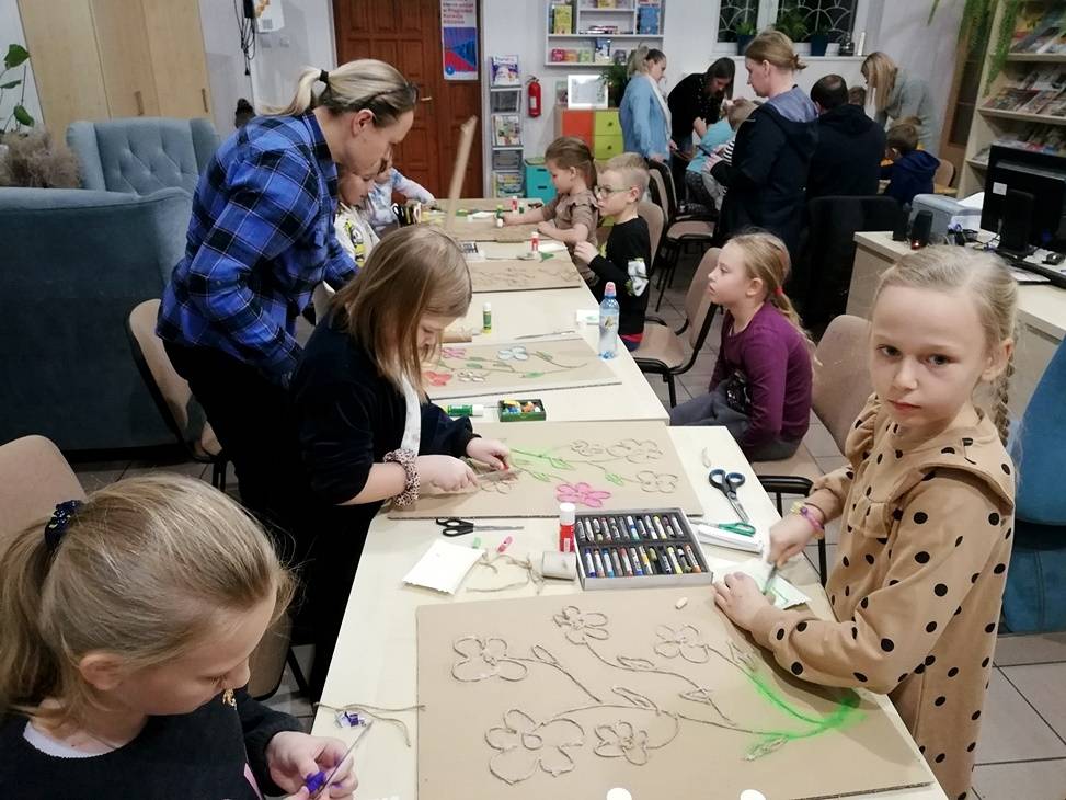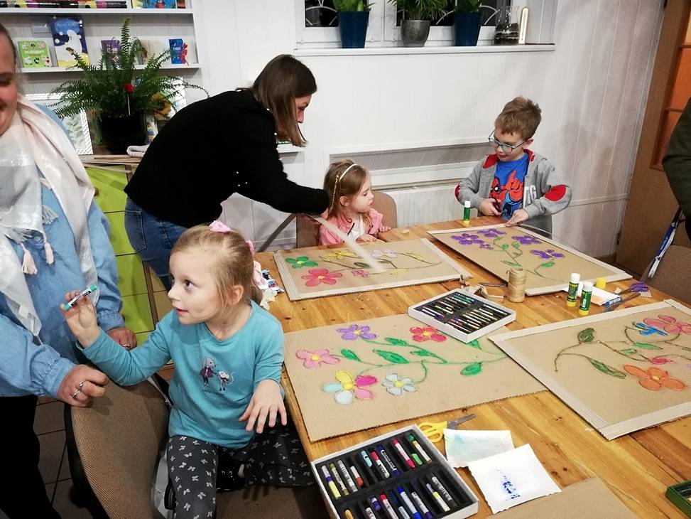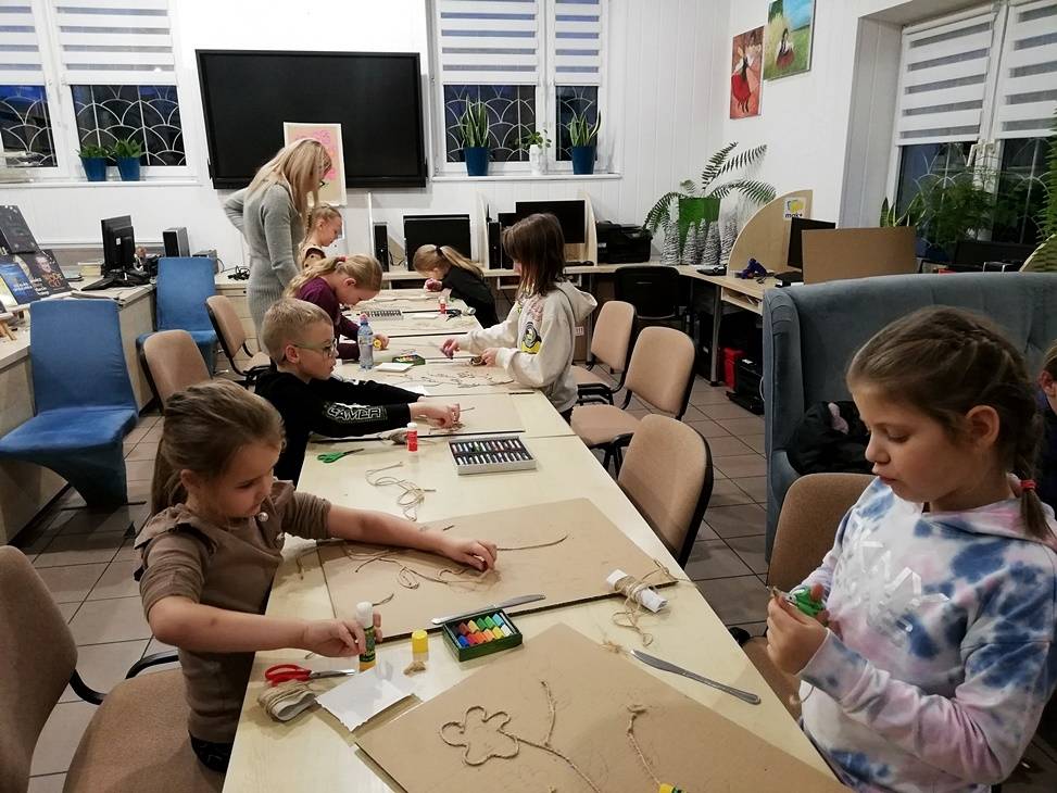 We wtorek czytelnia biblioteki w Gorzkowicach po raz kolejny zamieniła się w pracownię plastyczną, w której swoje prace tworzą dzieci, wspierane przez rodziców i bibliotekarzy. Tym razem do wykonania obrazów wykorzystaliśmy karton, sznurek i pastele. Klejenie sznurka i wypełnianie pól skruszonymi pastelami wymagało od uczestników warsztatów dużej precyzji i staranności. Całości dopełniła rama z tektury falistej. Kolorowe obrazy są odzwierciedleniem pasji i talentu dzieci. Na kolejne, mikołajkowe warsztaty zapraszamy już 6 grudnia, o godz.16.00.