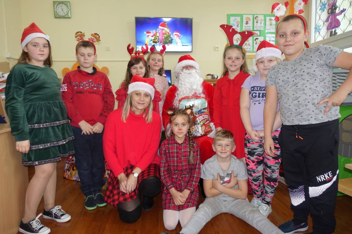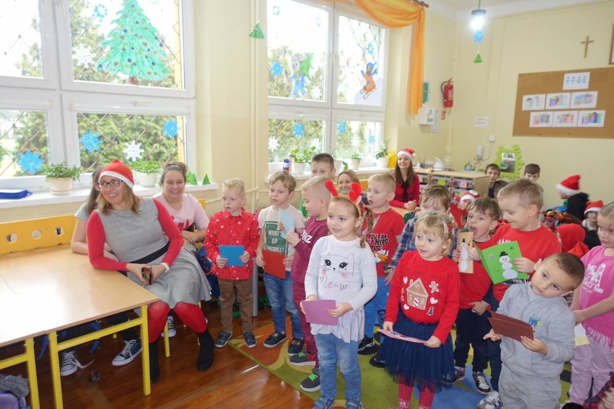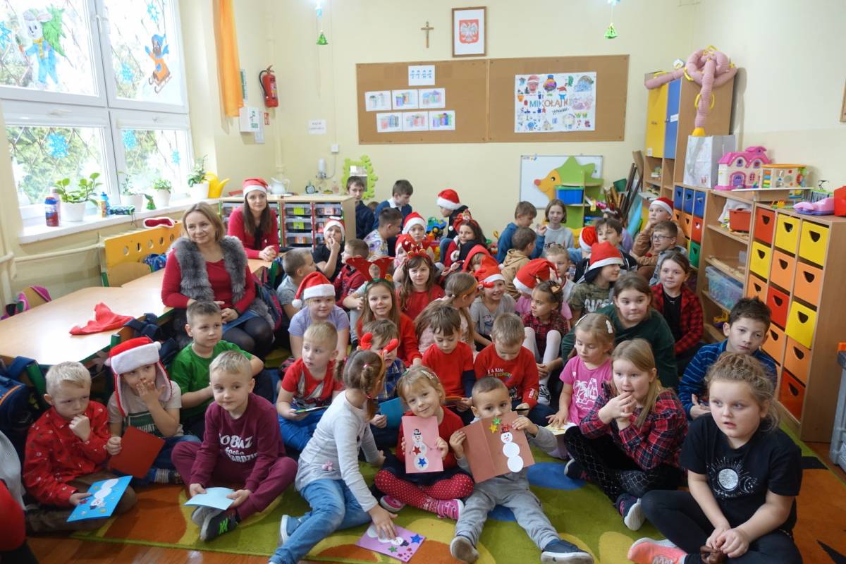 z niecierpliwością czekały na gościa. Już od samego rana przedszkolaki nasłuchiwały dźwięku dzwonka Św. Mikołaja. Pomimo braku białego puchu we wczesnych godzinach rannych przybył do dzieci Św. Mikołajw asyście swoich pomocników . Gdy tylko gość wszedł do sali, na buziach przedszkolaków i pozostałych uczniów pojawiły się uśmiechy i radość. Wcześniej maluchy nauczyły się wierszyka, który ochoczo zaprezentowały oraz przekazały na ręce gościa własnoręcznie wykonane kartki świąteczne. Na koniec Mikołaj obdarował wszystkich prezentami przygotowanymi przy pomocy Rady Rodziców. Po wykonaniu wspólnego zdjęcia dzieci podziękowały i pożegnały Mikołaja. Spotkanie minęło w bardzo miłej atmosferze.