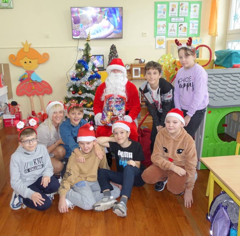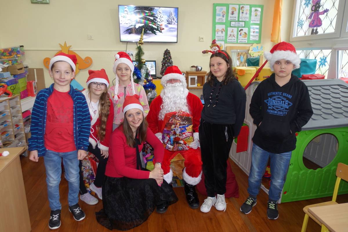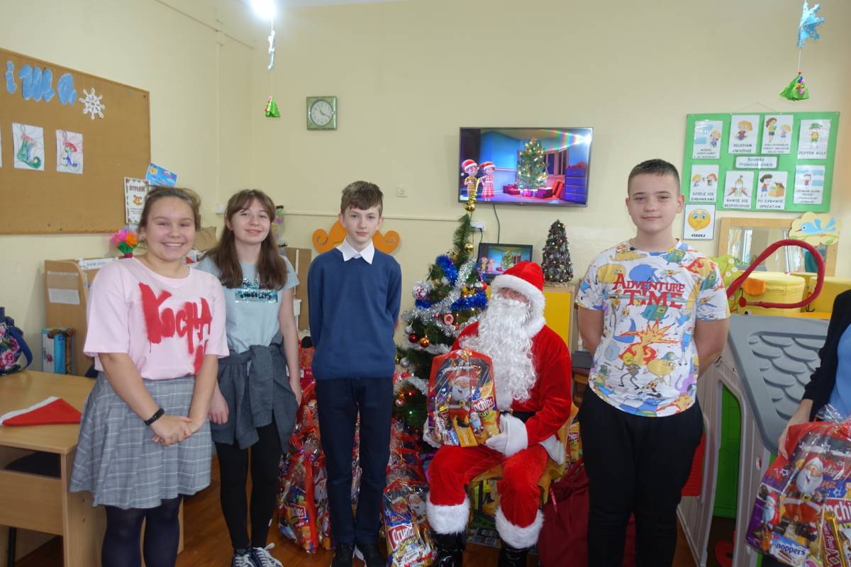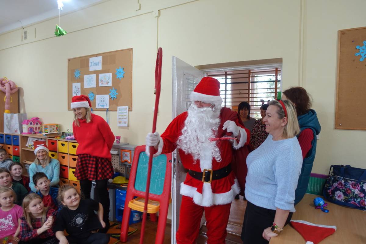 z niecierpliwością czekały na gościa. Już od samego rana przedszkolaki nasłuchiwały dźwięku dzwonka Św. Mikołaja. Pomimo braku białego puchu we wczesnych godzinach rannych przybył do dzieci Św. Mikołajw asyście swoich pomocników . Gdy tylko gość wszedł do sali, na buziach przedszkolaków i pozostałych uczniów pojawiły się uśmiechy i radość. Wcześniej maluchy nauczyły się wierszyka, który ochoczo zaprezentowały oraz przekazały na ręce gościa własnoręcznie wykonane kartki świąteczne. Na koniec Mikołaj obdarował wszystkich prezentami przygotowanymi przy pomocy Rady Rodziców. Po wykonaniu wspólnego zdjęcia dzieci podziękowały i pożegnały Mikołaja. Spotkanie minęło w bardzo miłej atmosferze.