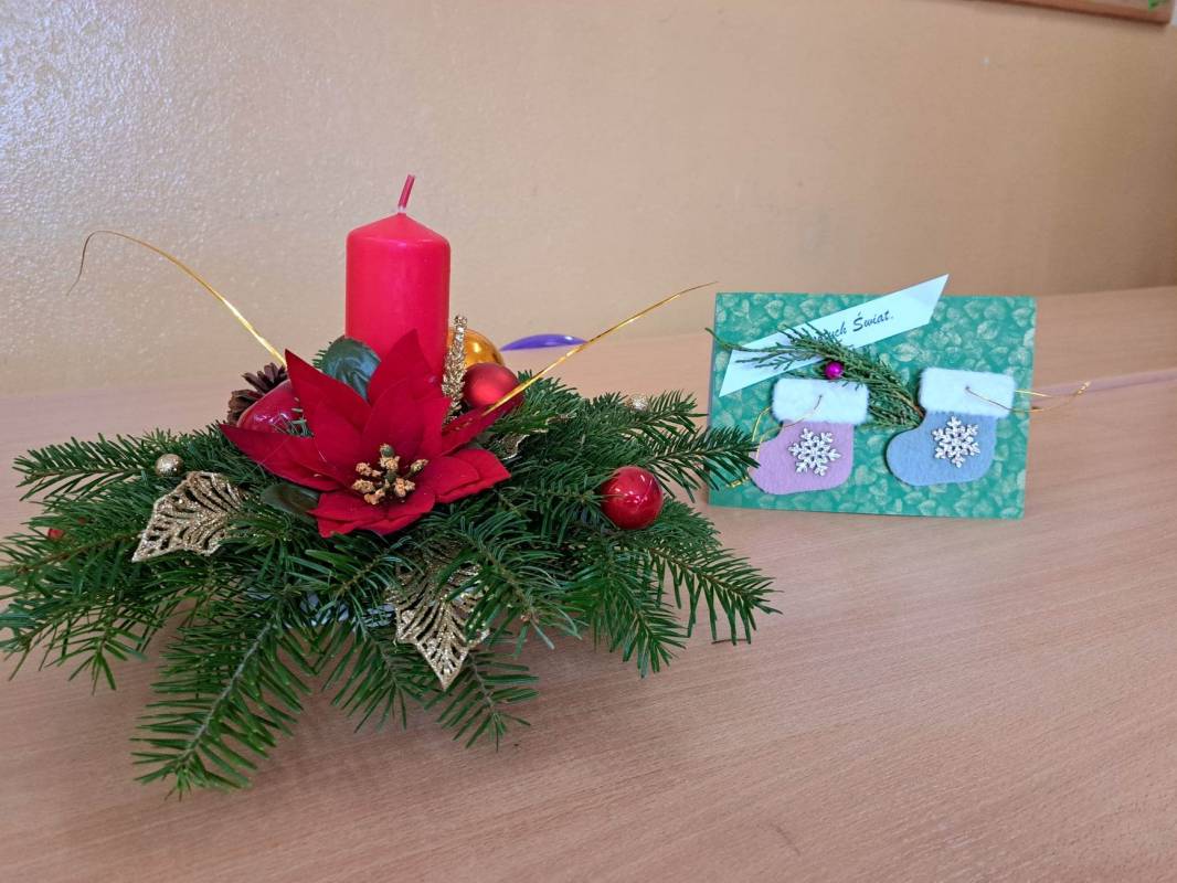 Uczniowie wykonali kartkę, śliczny stroik świąteczny oraz przekazali Dyrekcji, Pracownikom i Pensjonariuszom życzenia z okazji zbliżających się Świąt Bożego Narodzenia.