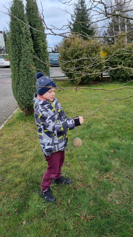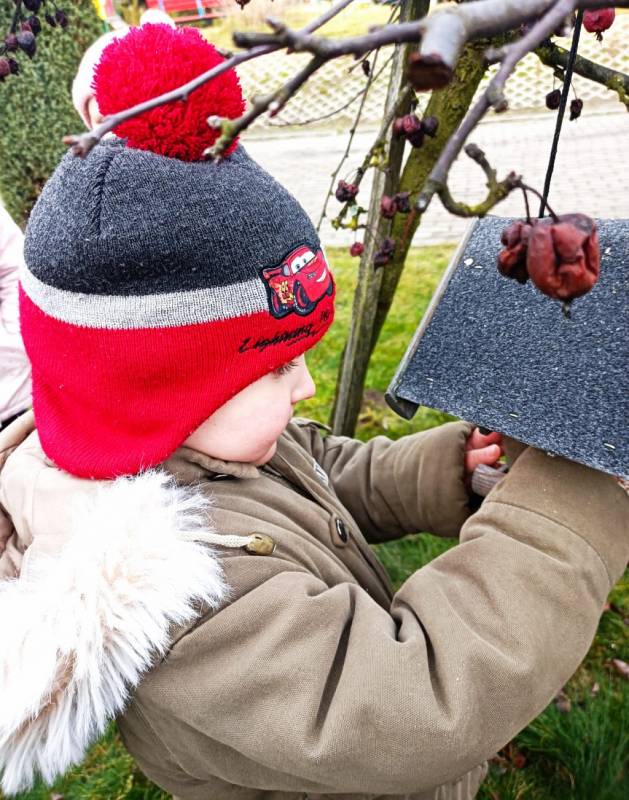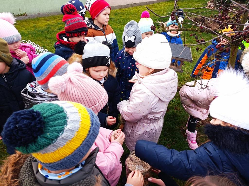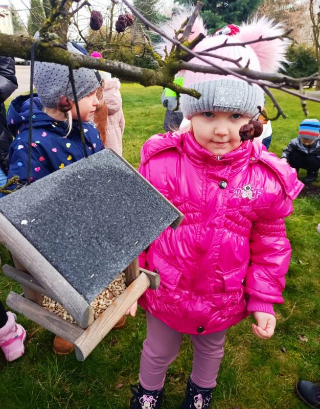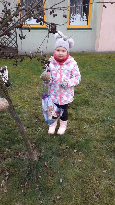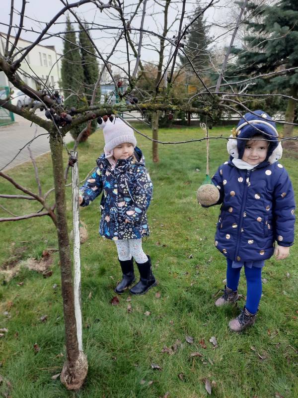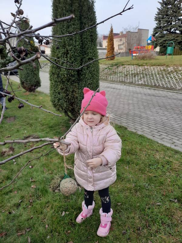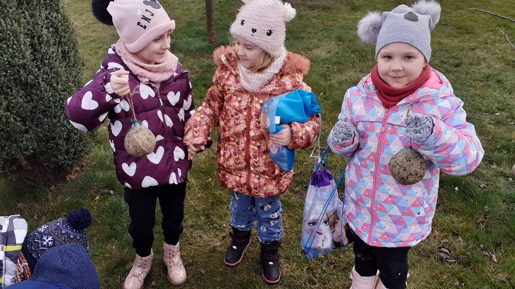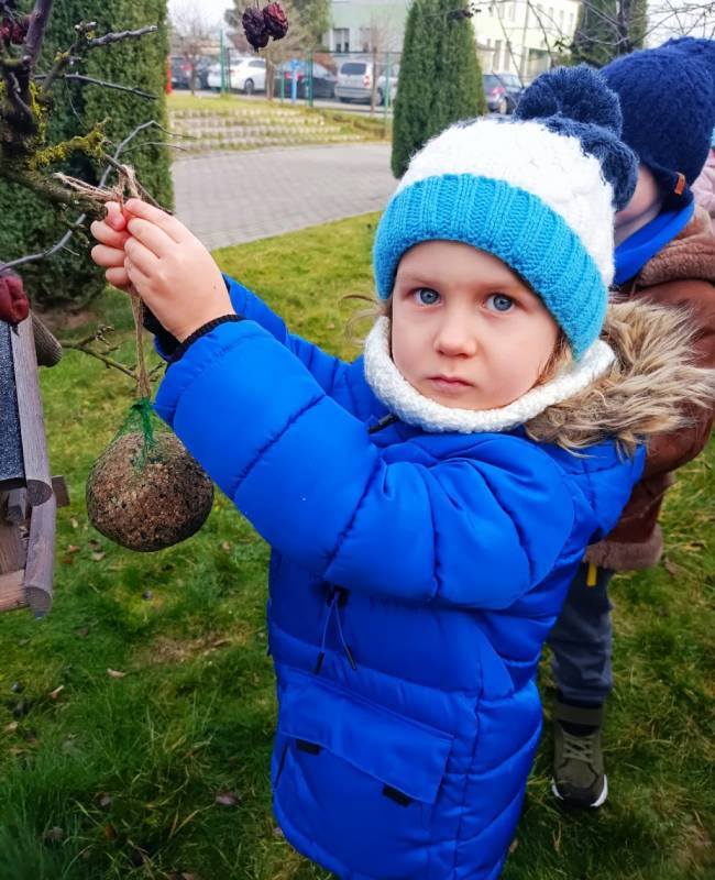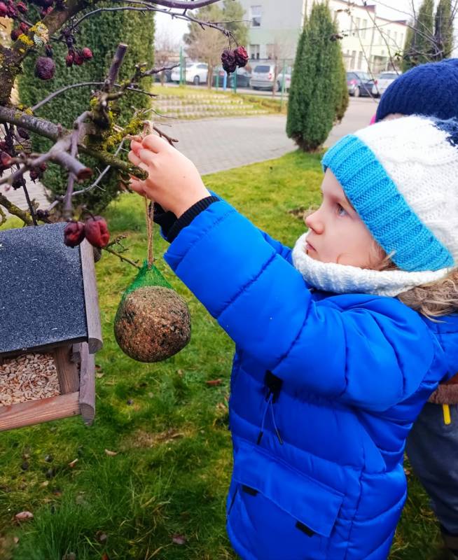 Dokarmianie ptaków zimą to ważne i odpowiedzialne zajęcie. Jeżeli zdecydujemy się na dokarmianie, musimy robić to bardzo regularnie. Gdy ptaki zapamiętają nasze miejsce, staną się stałymi domownikami naszego ogrodu. To z kolei będzie dla nas wielką korzyścią. Gdy przyjdzie lato ptaki odwdzięczą się likwidowaniem szkodników np. owadów, które są ich wielkim przysmakiem. Dodatkowo obserwowanie ptaszków w karmniku przynosi wielką radość zarówno tym najmłodszym jak i starszym. Dzieci z naszego przedszkola również postanowiły zadbać o to, aby ptaszki miały co jeść. Dlatego też w naszym ogrodzie przedszkolnym pojawił się bardzo popularny przysmak ptaków o nazwie „pyzy”. Są to gotowe mieszanki tłuszczowo-nasienne w formie kul, można je kupić w większości sklepów zoologicznych. Jednak takie mieszanki bez problemu przygotujemy samodzielnie w domu. By wykonać ten przysmak potrzebujemy kostkę smalcu oraz garść nasion i ziaren. Smalec roztapiamy i łączymy z resztą składników. Gdy nasz smalec ostygnie, można włożyć go do pojemnika i wywiesić niedaleko domu.