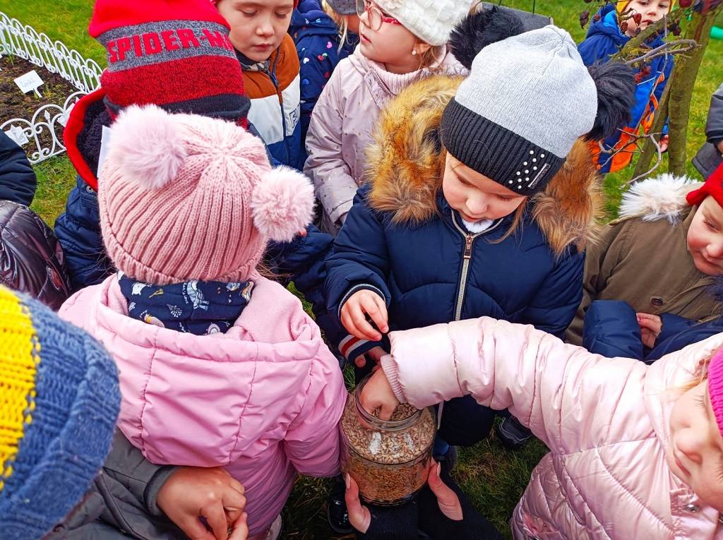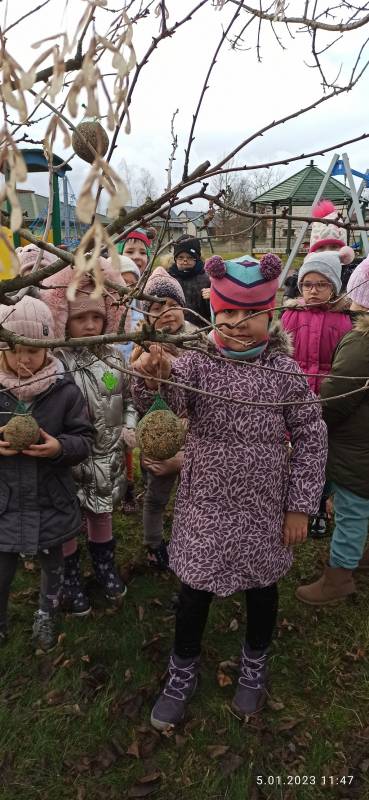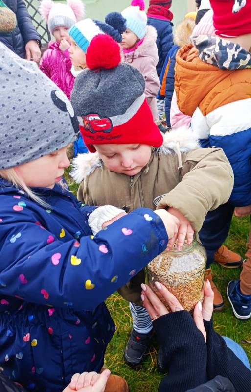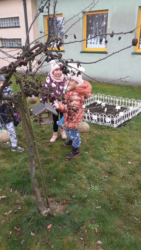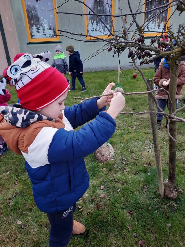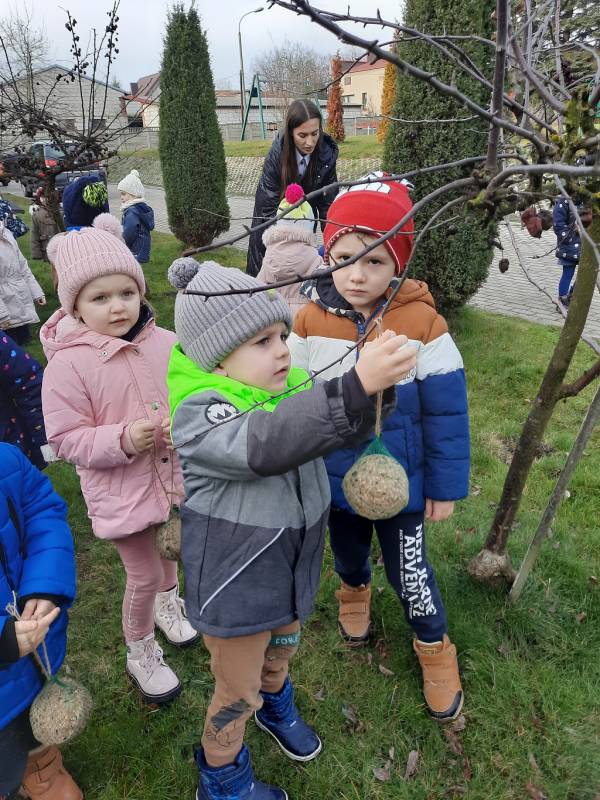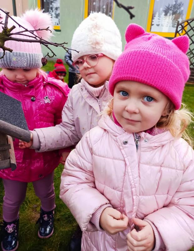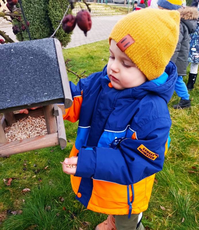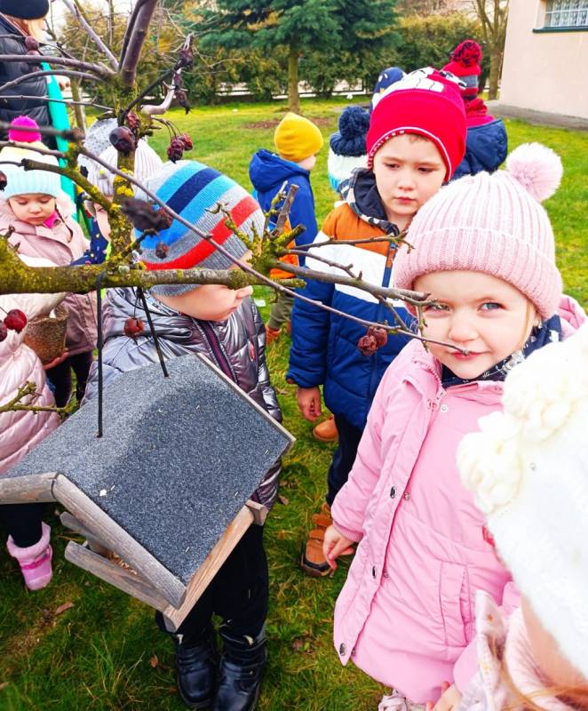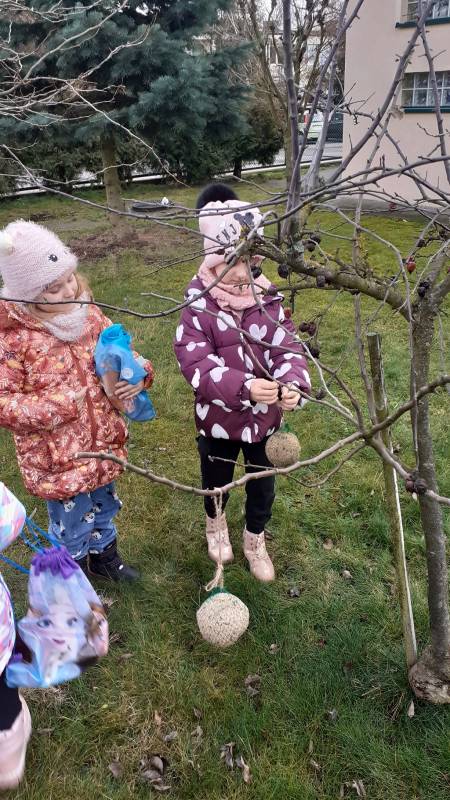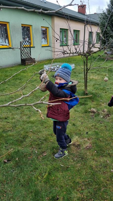 Dokarmianie ptaków zimą to ważne i odpowiedzialne zajęcie. Jeżeli zdecydujemy się na dokarmianie, musimy robić to bardzo regularnie. Gdy ptaki zapamiętają nasze miejsce, staną się stałymi domownikami naszego ogrodu. To z kolei będzie dla nas wielką korzyścią. Gdy przyjdzie lato ptaki odwdzięczą się likwidowaniem szkodników np. owadów, które są ich wielkim przysmakiem. Dodatkowo obserwowanie ptaszków w karmniku przynosi wielką radość zarówno tym najmłodszym jak i starszym. Dzieci z naszego przedszkola również postanowiły zadbać o to, aby ptaszki miały co jeść. Dlatego też w naszym ogrodzie przedszkolnym pojawił się bardzo popularny przysmak ptaków o nazwie „pyzy”. Są to gotowe mieszanki tłuszczowo-nasienne w formie kul, można je kupić w większości sklepów zoologicznych. Jednak takie mieszanki bez problemu przygotujemy samodzielnie w domu. By wykonać ten przysmak potrzebujemy kostkę smalcu oraz garść nasion i ziaren. Smalec roztapiamy i łączymy z resztą składników. Gdy nasz smalec ostygnie, można włożyć go do pojemnika i wywiesić niedaleko domu.