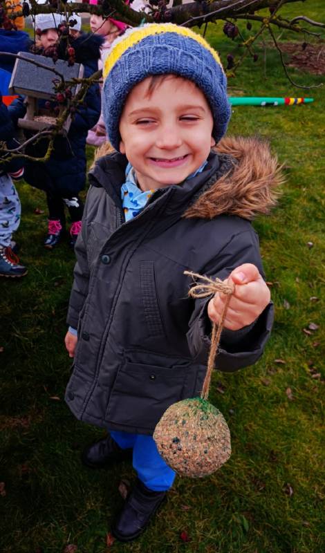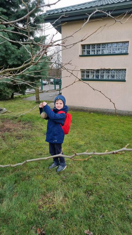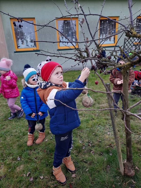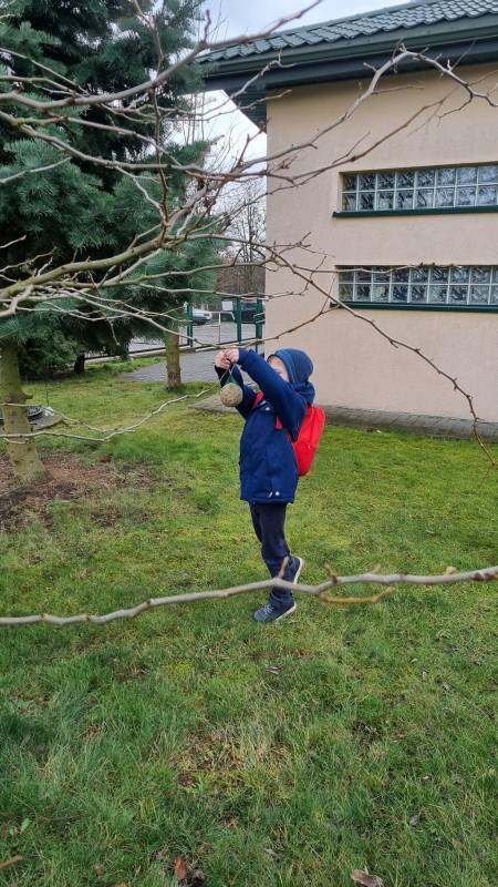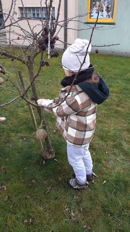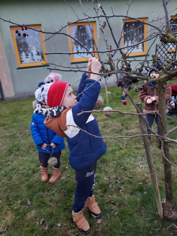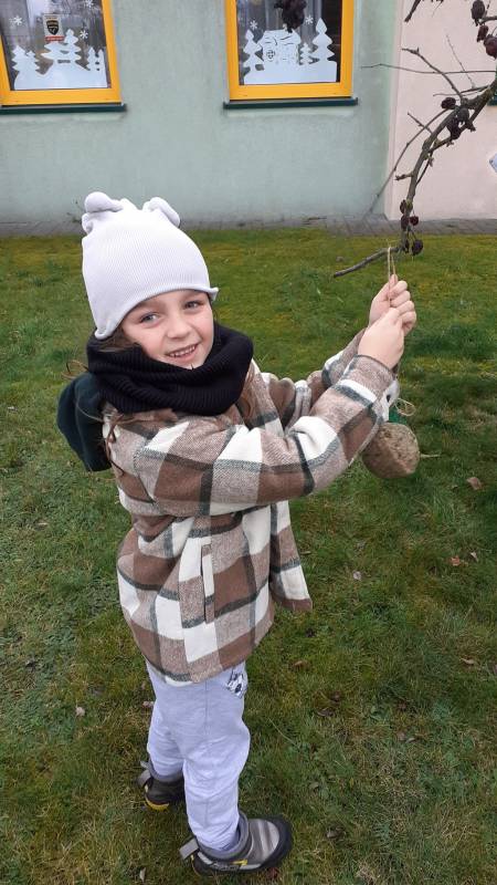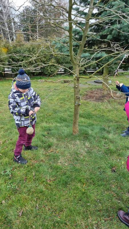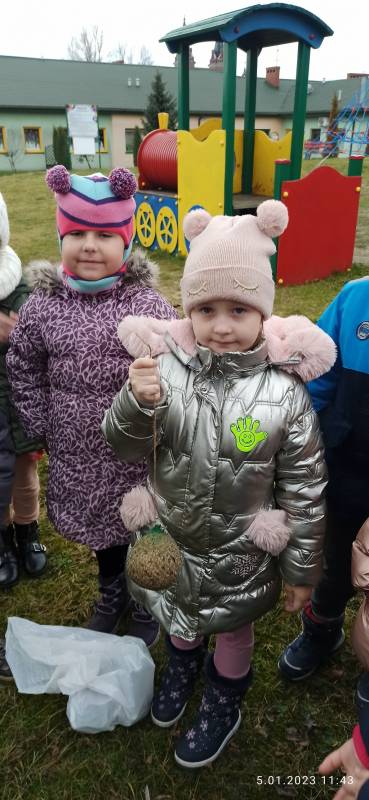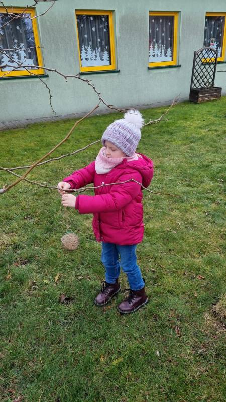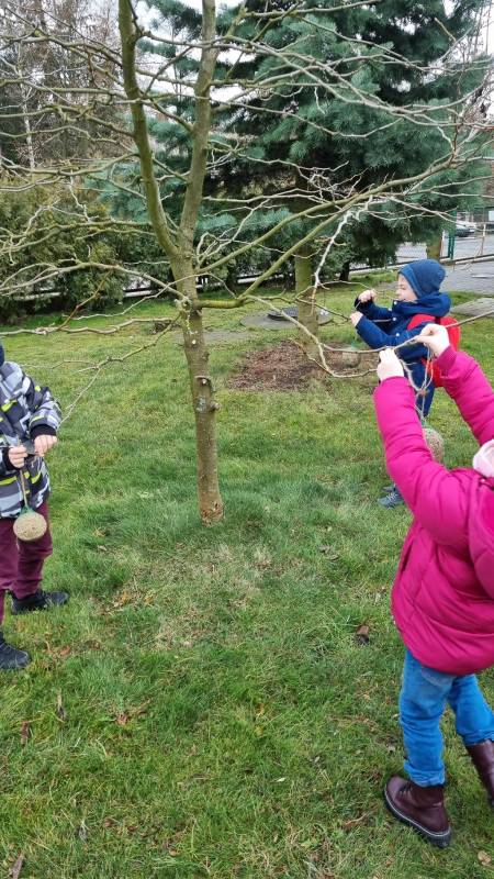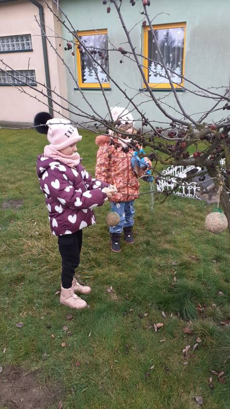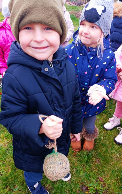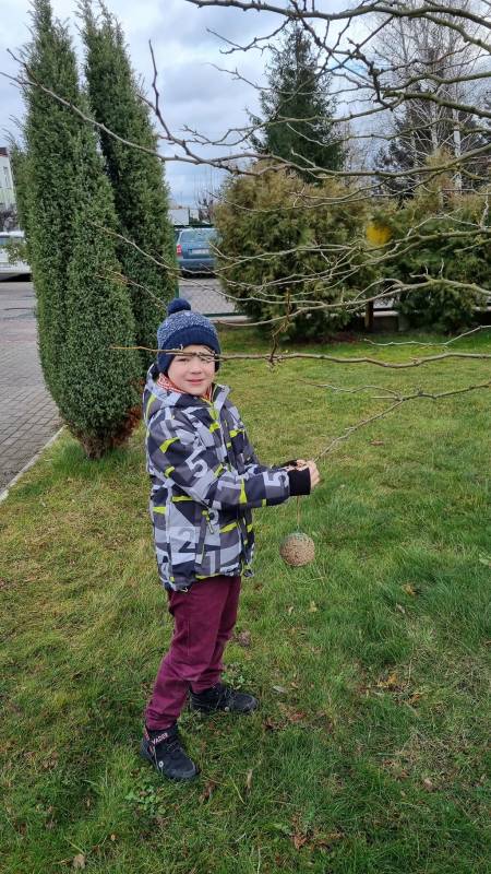 Dokarmianie ptaków zimą to ważne i odpowiedzialne zajęcie. Jeżeli zdecydujemy się na dokarmianie, musimy robić to bardzo regularnie. Gdy ptaki zapamiętają nasze miejsce, staną się stałymi domownikami naszego ogrodu. To z kolei będzie dla nas wielką korzyścią. Gdy przyjdzie lato ptaki odwdzięczą się likwidowaniem szkodników np. owadów, które są ich wielkim przysmakiem. Dodatkowo obserwowanie ptaszków w karmniku przynosi wielką radość zarówno tym najmłodszym jak i starszym. Dzieci z naszego przedszkola również postanowiły zadbać o to, aby ptaszki miały co jeść. Dlatego też w naszym ogrodzie przedszkolnym pojawił się bardzo popularny przysmak ptaków o nazwie „pyzy”. Są to gotowe mieszanki tłuszczowo-nasienne w formie kul, można je kupić w większości sklepów zoologicznych. Jednak takie mieszanki bez problemu przygotujemy samodzielnie w domu. By wykonać ten przysmak potrzebujemy kostkę smalcu oraz garść nasion i ziaren. Smalec roztapiamy i łączymy z resztą składników. Gdy nasz smalec ostygnie, można włożyć go do pojemnika i wywiesić niedaleko domu.