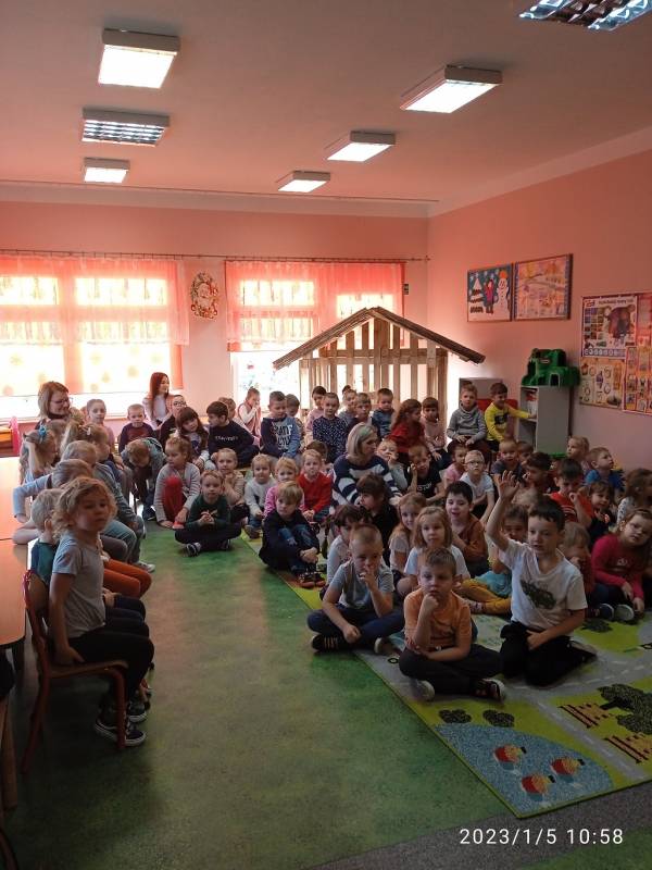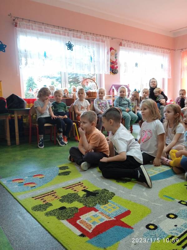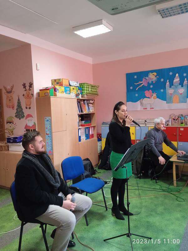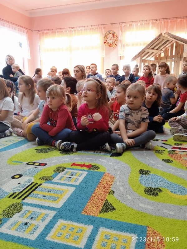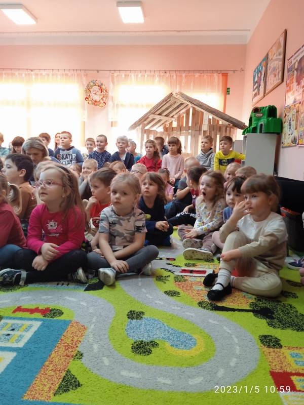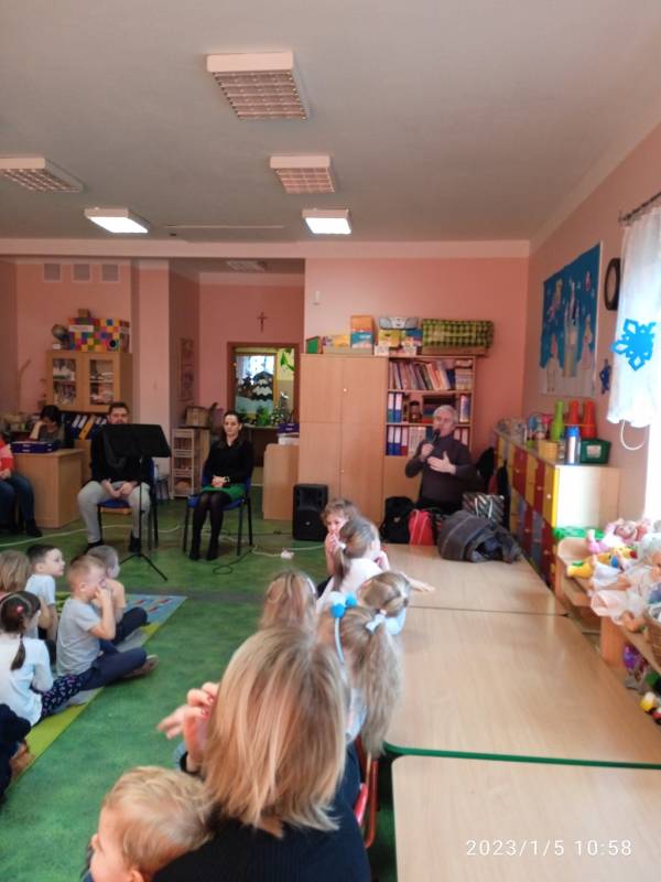 5.01.2023r. w Przedszkolu Samorządowym odbyła się filharmonia, Dzieci uczestniczyły w audycji muzycznej pt. "Piosenki świąt" w wykonaniu panów Hanusza Kowalczyka, Wiktora Sobkowiaka i pani Aleksandry Hawro-Łyko. Artyści zostali przyjęci przez dzieci z dużym entuzjazmem.
