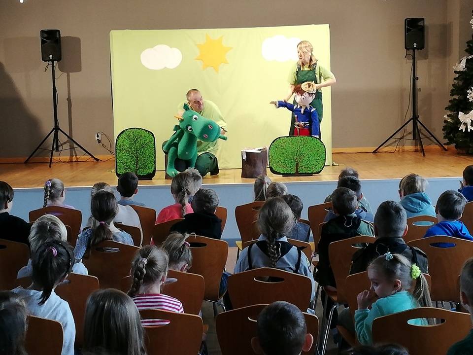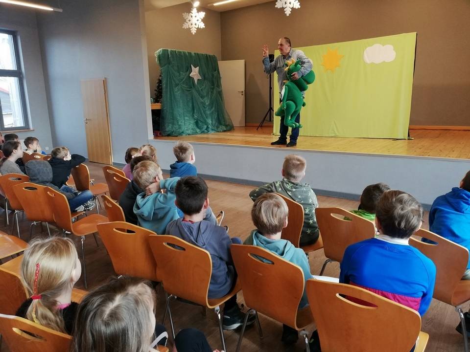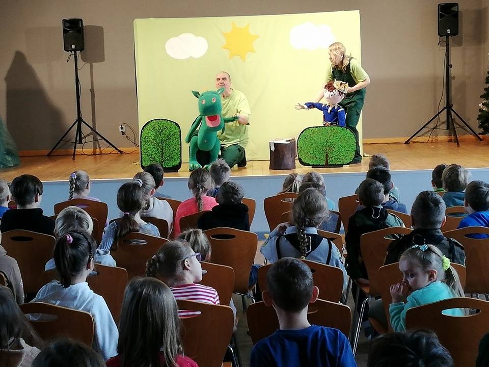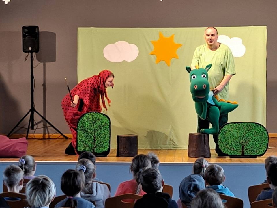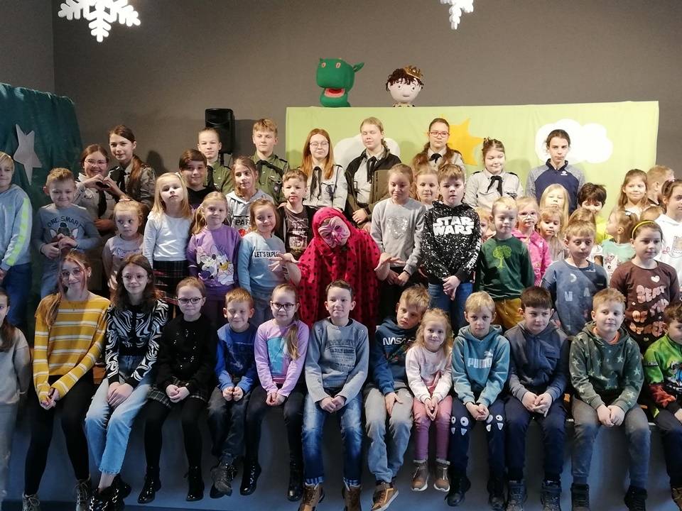 We wtorek, 17 stycznia 2023 roku dzieci biorące udział w bibliotecznych smoczych warsztatach odwiedzili aktorzy Teatru Promyk, którzy wystawili na scenie Domu Kultury sztukę pt. ,,Baśń o księciu Bolku i smoku Wartusiu”. Jest to historia przygód młodego księcia Bolka, pragnącego zasiąść na królewskim tronie. By osiągnąć cel, musi sprostać wielu wyzwaniom. W trakcie wędrówki spotyka dobrego i wesołego smoka Wartusia. Obaj zaprzyjaźniają się. Odtąd wędrują razem. Jak to jednak w bajkach bywa pojawia wiele nieprzewidzianych przeszkód. Szczęśliwe zakończenie było możliwe tylko przy pomocy widzów. Po spektaklu dzieci wzięły udział w warsztatach teatralnych. Poznały różne rodzaje lalek, które są wykorzystywane w przedstawieniach. Miały możliwość poruszania nimi, poznały zasady animacji, pracę aktora i organizację teatru.