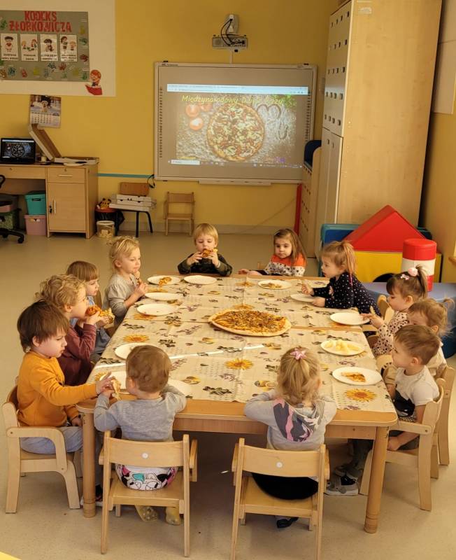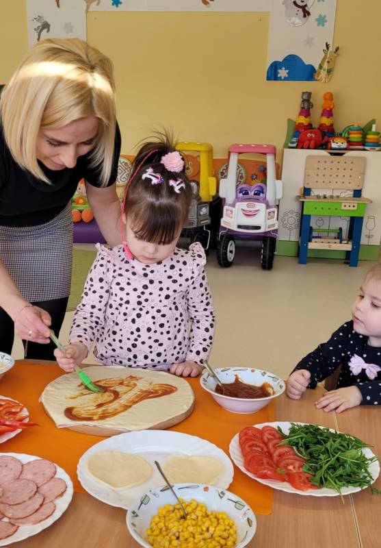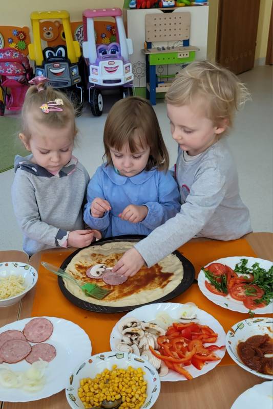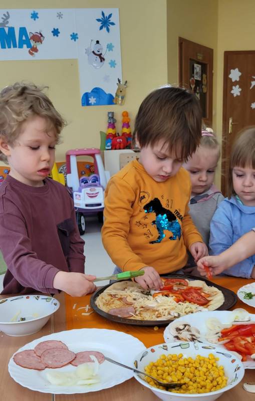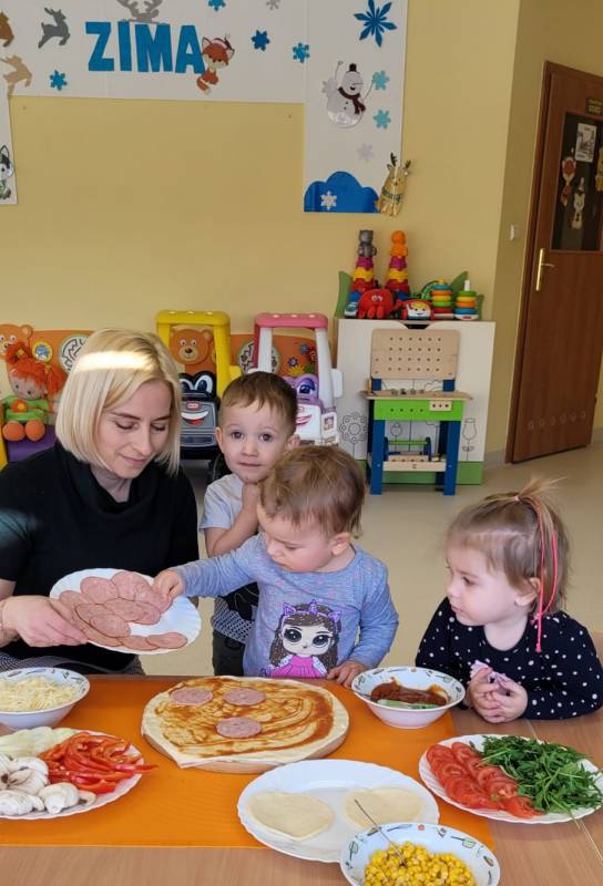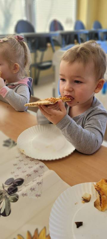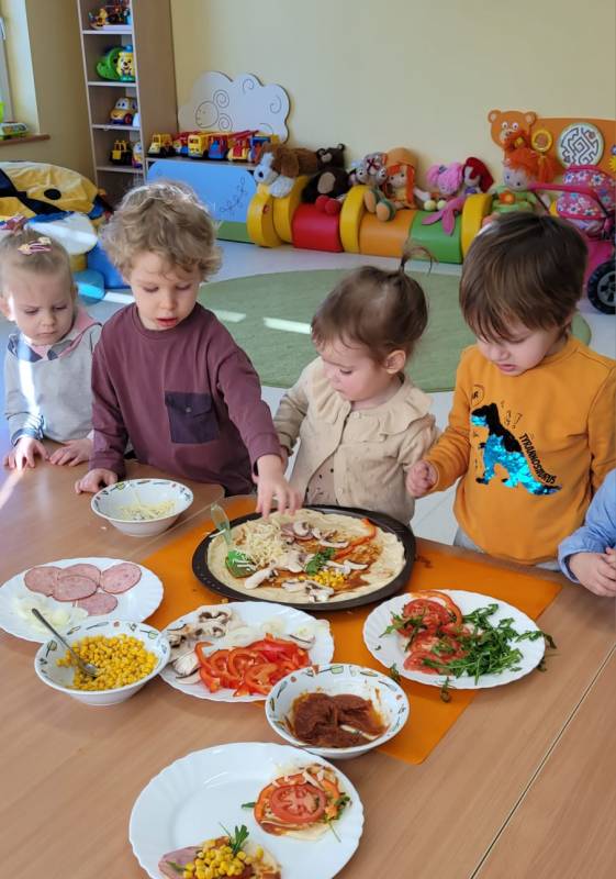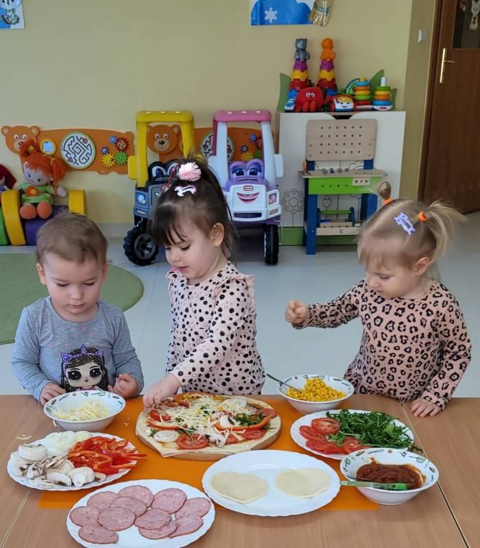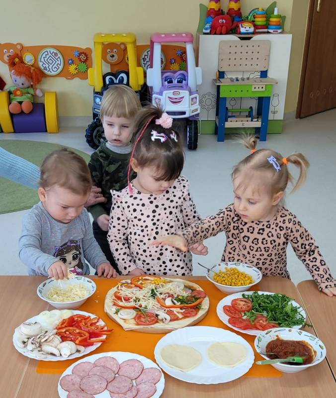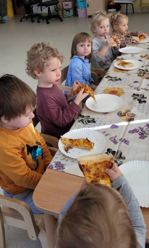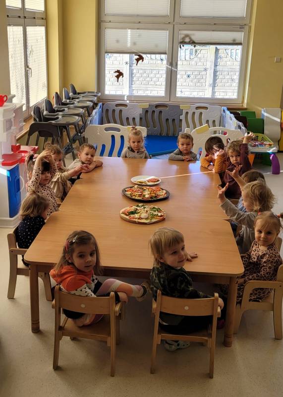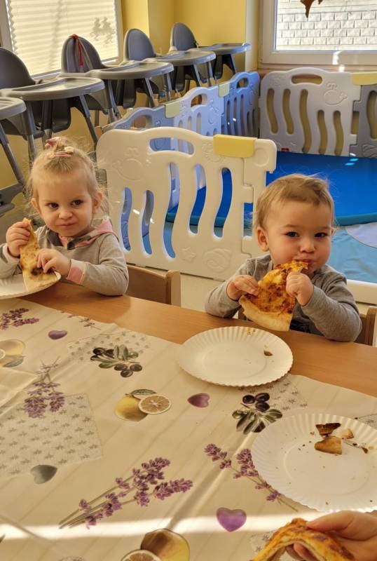 9 lutego obchodzimy Dzień Pizzy. Tego dnia sala naszego klubiku zamieniła się we włoską pizzerię. Maluszki wspólnie z ciociami bawiąc się w kucharzy przygotowały pizzę. Wielką frajdę dzieciom sprawiły już same przygotowania: smarowanie sosem pomidorowym ciasta, nakładanie ulubionych składników i posypywanie serem. Gdy wszystko było już gotowe, pizze powędrowały do kuchni, aby się upiec. Następnie dzieci z wielkim apetytem próbowały własnoręcznie przygotowanych pyszności. Cały dzień upłynął w miłej i radosnej atmosferze. Dzieci poznały historię pizzy, dowiedziały się z jakiego kraju pochodzi. To był niezwykle smakowity dzień! Zapraszamy do galerii na fotorelację.