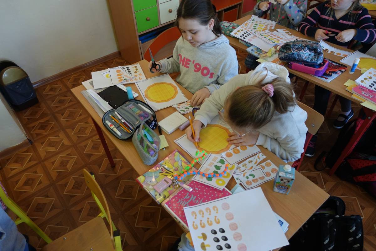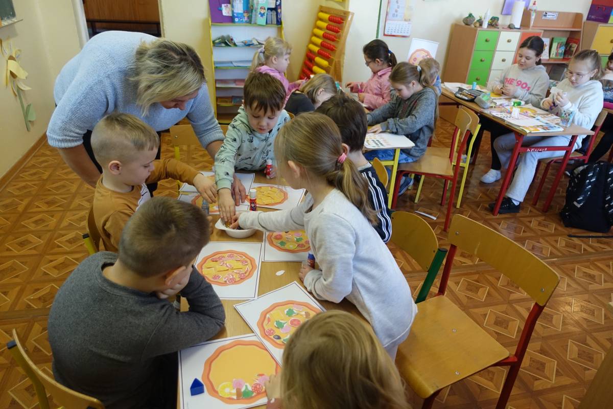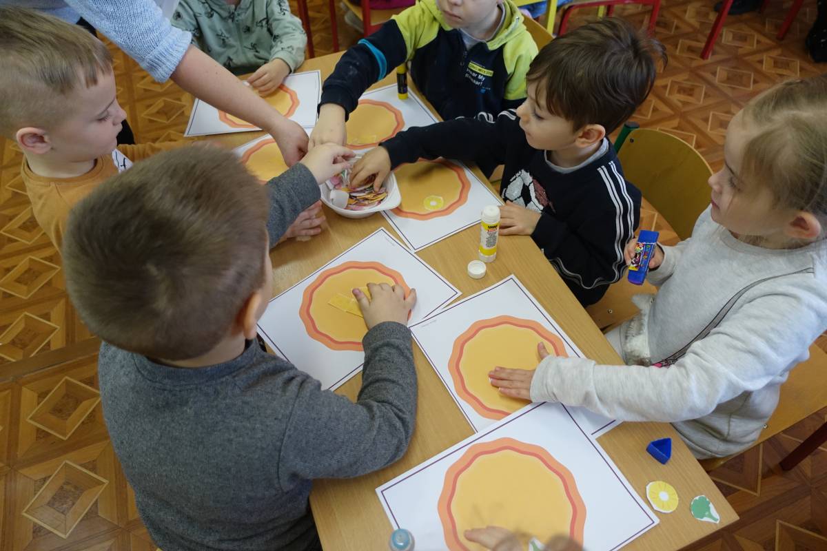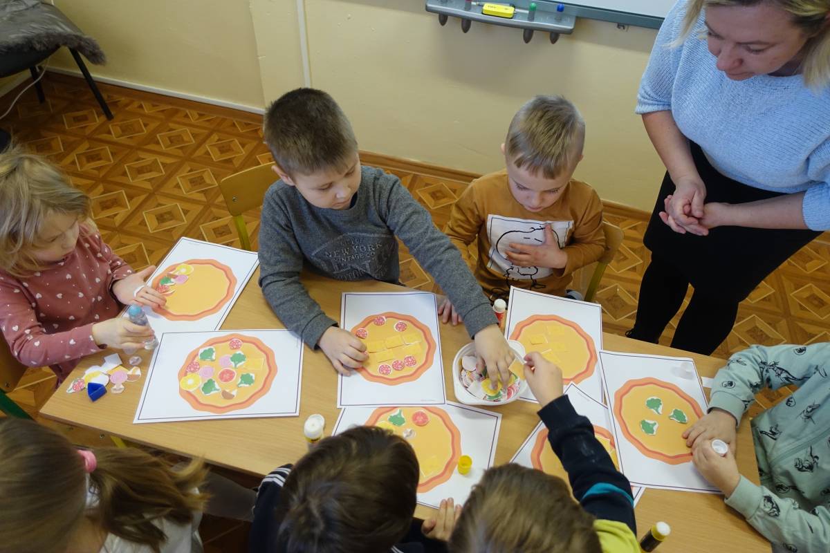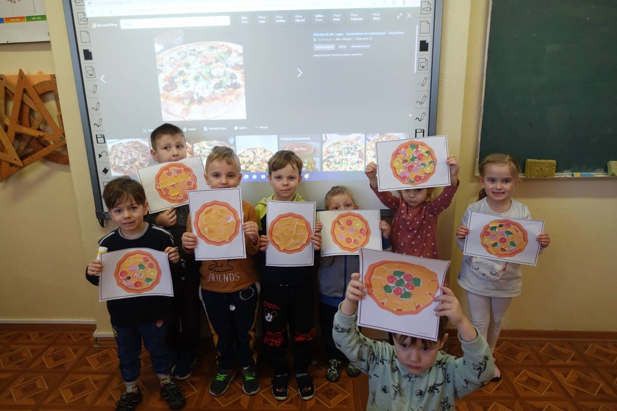 Młodsze dzieci stworzyły także kolorowe, smakowicie wyglądające placki, wykorzystując do tego różne techniki plastyczne. Pomimo, iż pizze były papierowe, bardzo rozbudzały wszystkie apetyty.