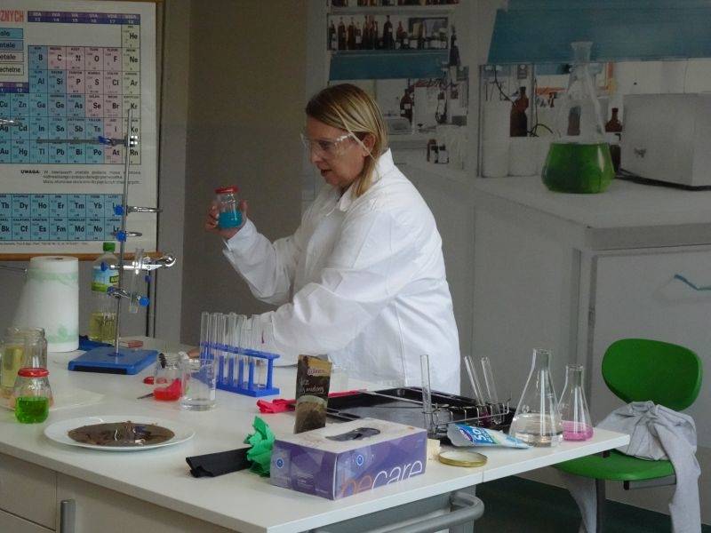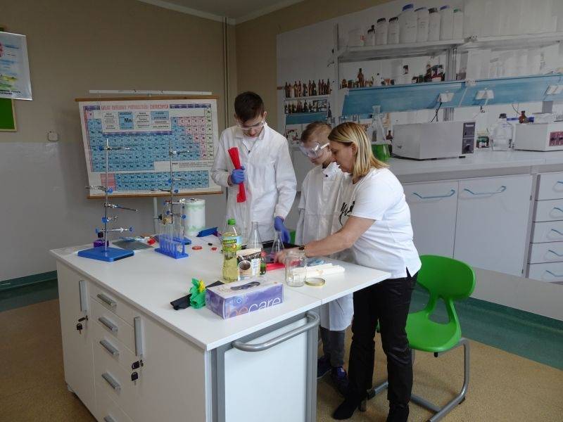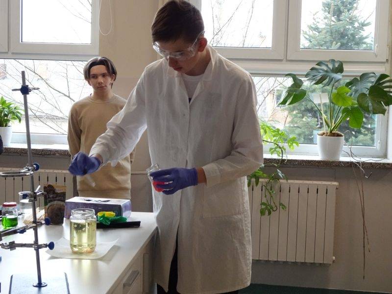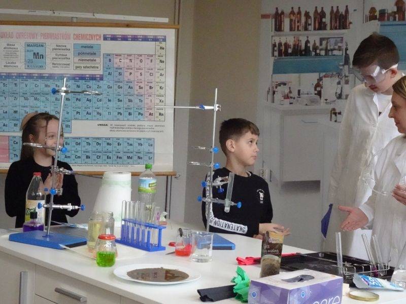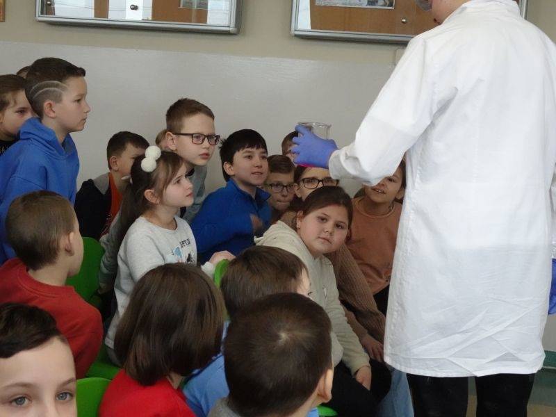 W dalszej części pokazali młodszym kolegom i koleżankom doświadczenia, które można wykonać bezpiecznie w domu, razem z rodzicami: kolorowe wulkany, lampę lawową. A także takie, które można wykonać tylko w pracowni chemicznej i to pod opieką nauczyciela: reakcję sodu z wodą, magnezu z kwasem chlorowodorowym czy otrzymywania galaretowego wodorotlenku miedzi(II).