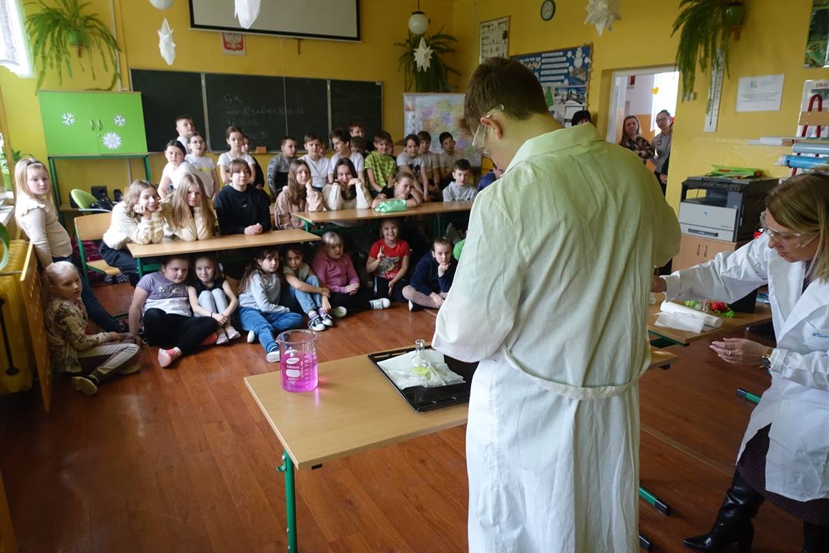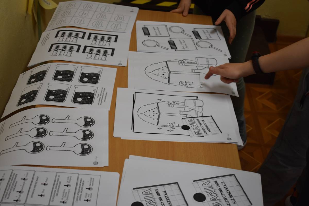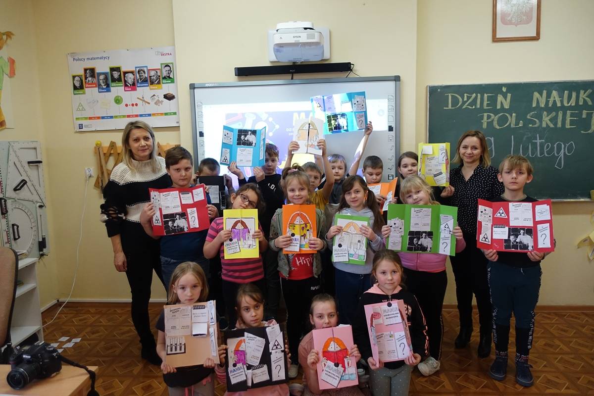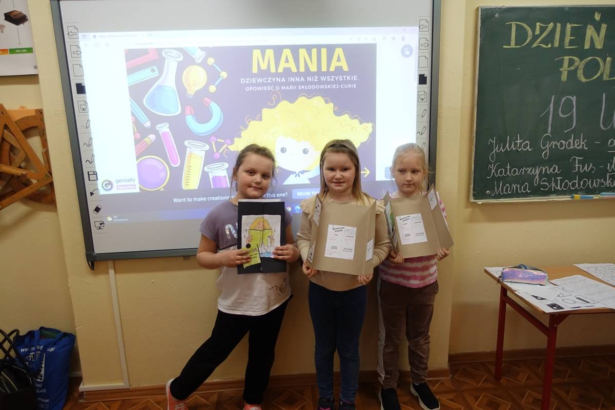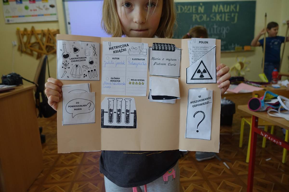 Pani Agnieszka Ziemba przygotowała dla uczniów wiele ciekawych doświadczeń i eksperymentów, które miały na celu zachęcić młodzież do poznania świata nauki. Następnie uczniowie klas I-III, po wysłuchaniu audiobooku ,,Mania, dziewczynka inna niż wszystkie”, rozwiązywali zagadki, rebusy i odpowiadali na pytania związane z lekturą. Kolejną częścią obchodów było stworzenie przez młodszych uczniów lapbooka, dotyczącego życia wybitnej polskiej uczonej- Marii Skłodowskiej – Curie. Na koniec uczniowie klas IV- VIII wykorzystując narzędzia TIK, rywalizowały ze sobą rozwiązując quiz o wybitnych polskich wynalazcach.