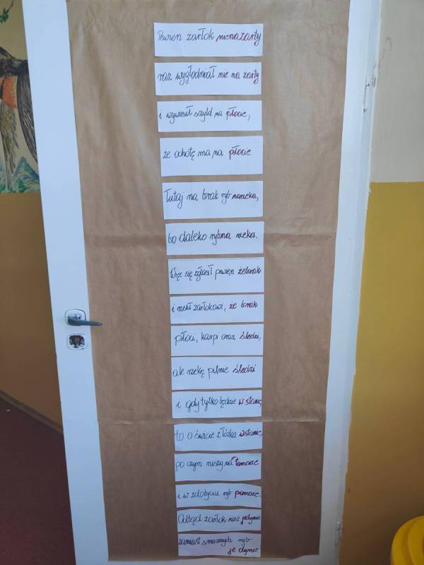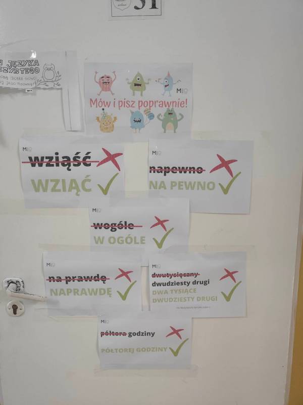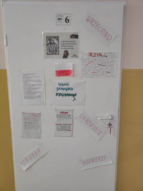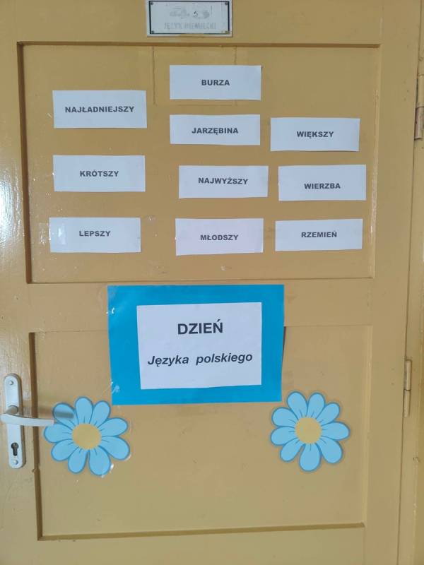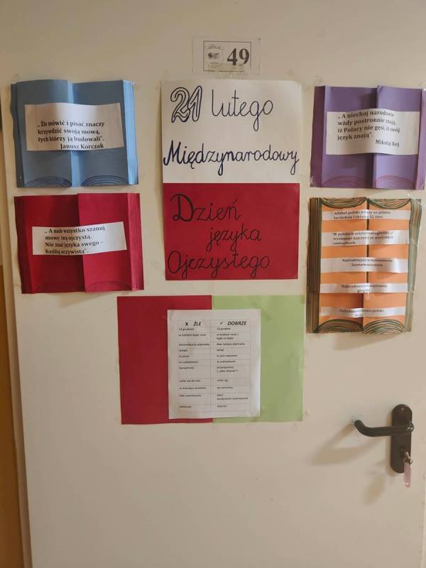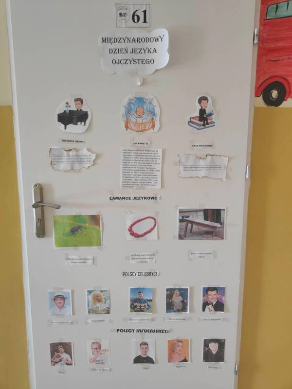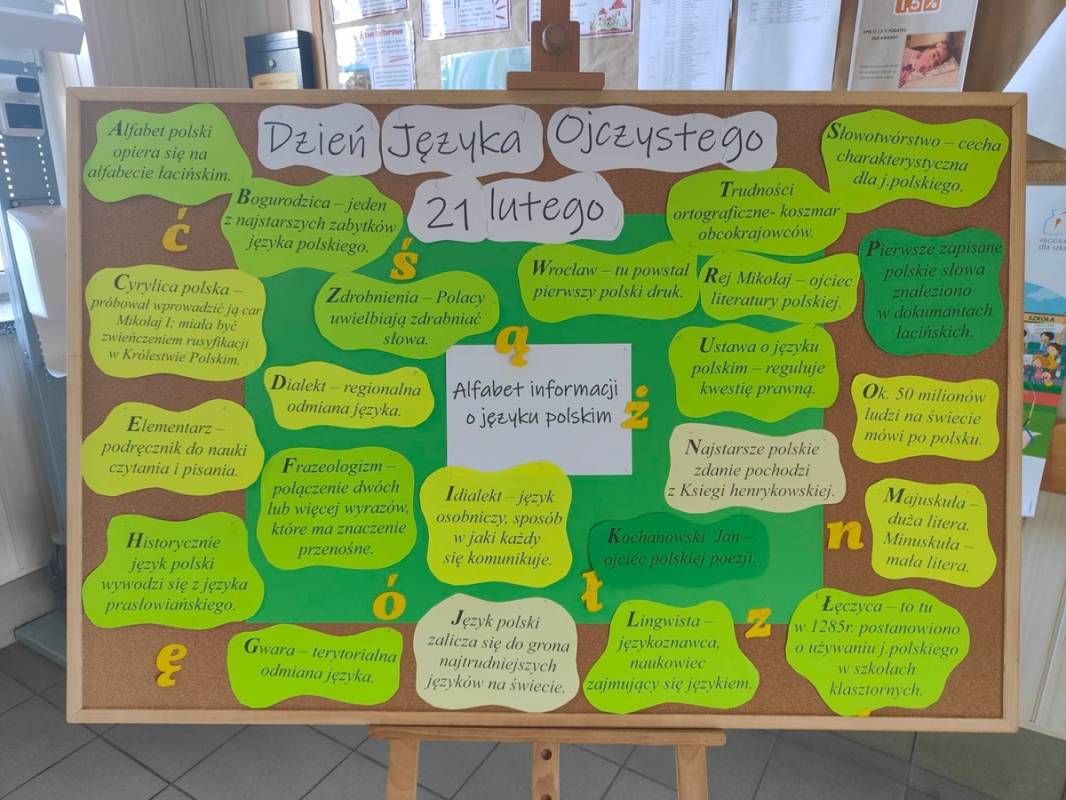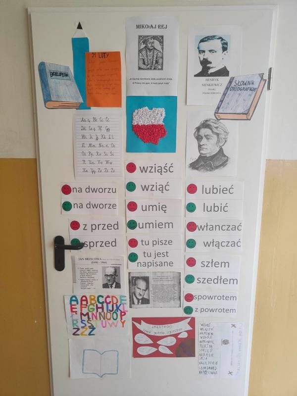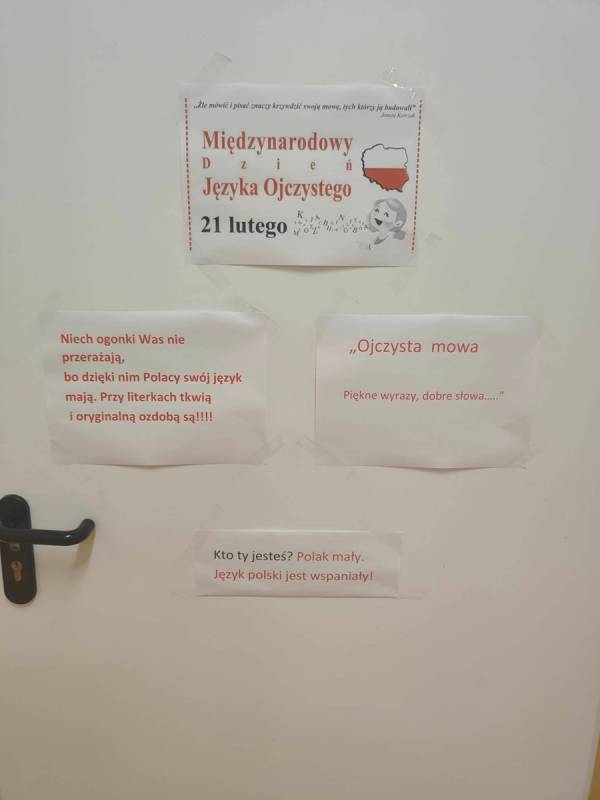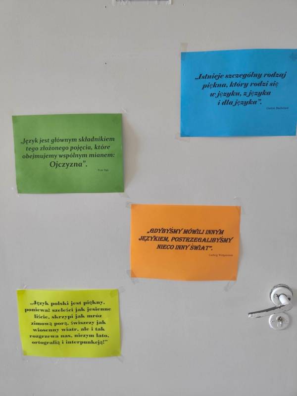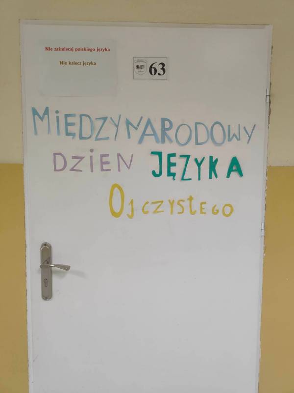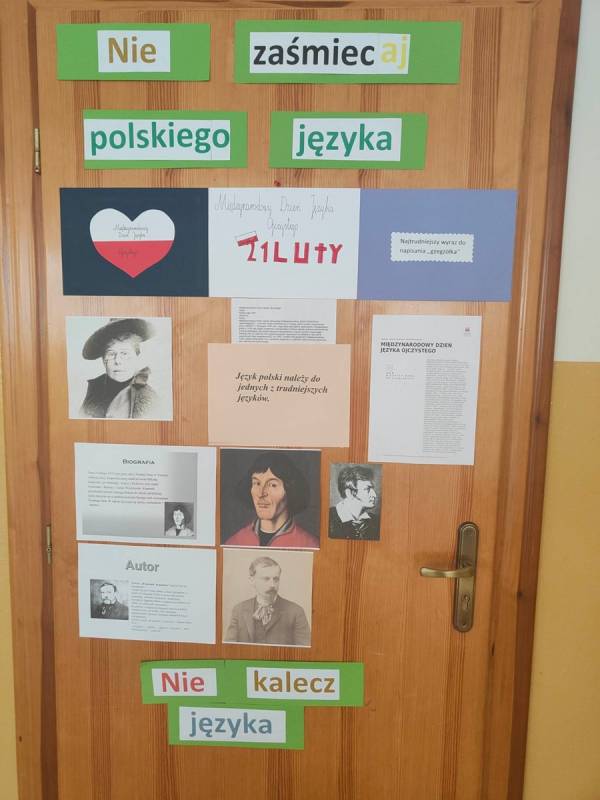 21 lutego w naszej szkole był dniem na udzielenie sobie samemu odpowiedzi na powyższe pytania. Nauczyciele poloniści omówili współczesne zagrożenia dla języka polskiego, zostały także przygotowane gazetki, które miały skłonić uczniów do zastanowienia się, czy nie zubożają naszego bogatego języka. Również drzwi wszystkich sal lekcyjnych zostały udekorowane hasłami, wyrazami z trudnościami ortograficznymi, różnymi ciekawostkami, które miały przypominać, jak ważny jest nasz język ojczysty. Na szkolnych korytarzach pojawiły się „Karteczki – dobre słowo”, które przypominały o poprawnej wymowie i pisowni wyrazów, które mogą sprawić problemy niejednemu Polakowi.