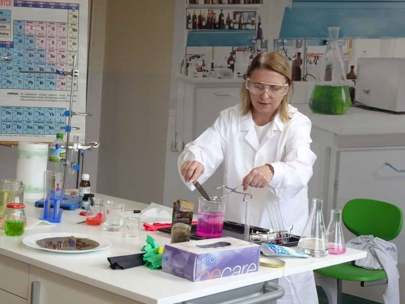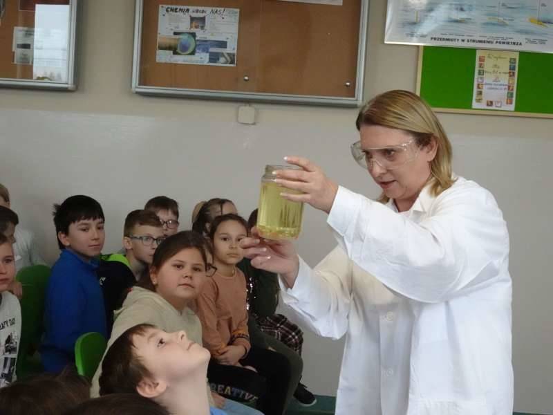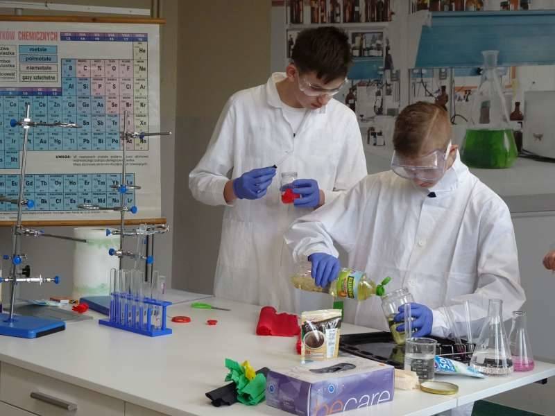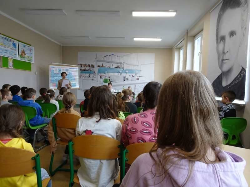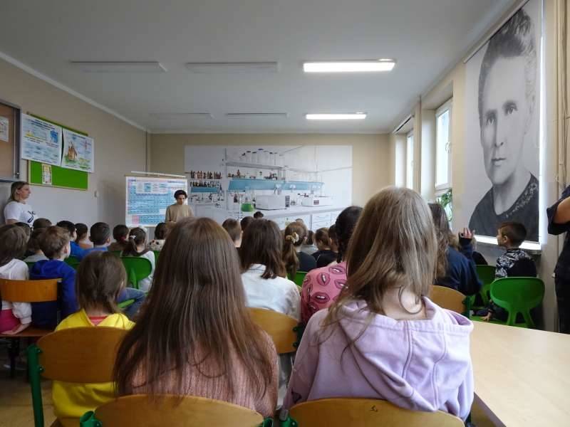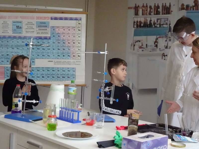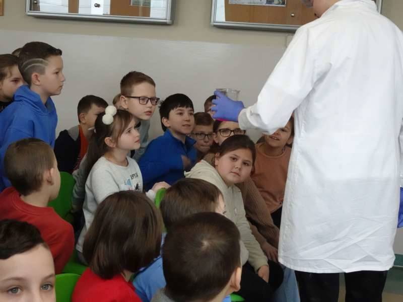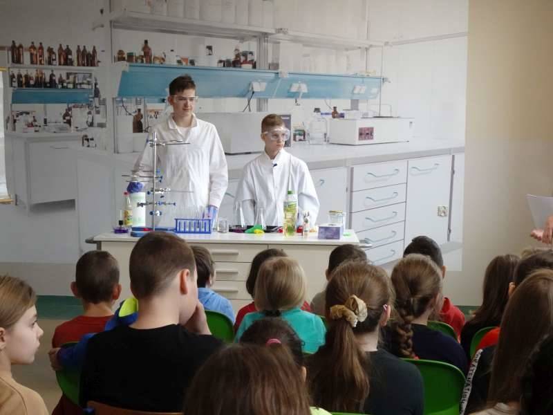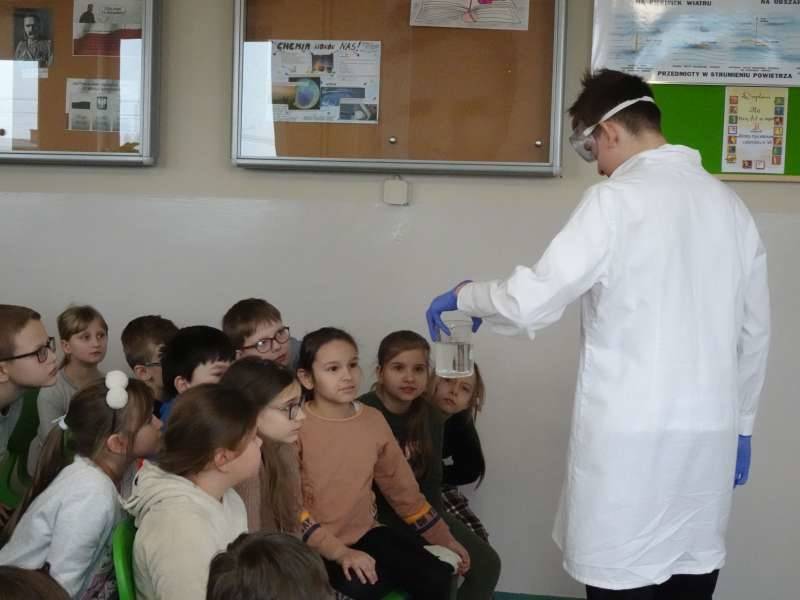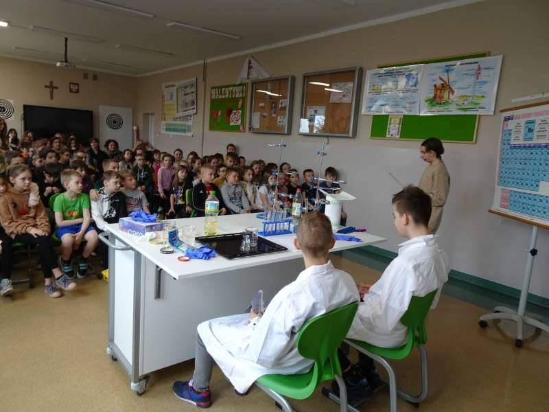 Uczniowie oglądali doświadczenia przygotowane przez starszych kolegów ze Szkolnego Koła Zainteresowań Chemią wraz z opiekunką p. Agnieszką Ziembą. A były to m.in. reakcja sodu z wodą, magnezu z kwasem chlorowodorowym, otrzymywanie galaretowego wodorotlenku miedzi(II). Duże wrażenie wywarły kolorowe wulkany i lampa lawowa. Oglądali prezentację multimedialną dotyczącą znakomitych polskich uczonych, która była wyświetlana na korytarzu szkolnym i prezentowana przez ucznia klasy 5a Michała Krystka. Podziwiali roboty przygotowane przez kolegów i koleżanki z klasy 3b. Obserwowali wiele eksperymentów i doświadczeń związanych ze światem fizyki opracowanych i przedstawionych przez uczniów klasy 8c pod okiem p. Aleksandry Pawelec.