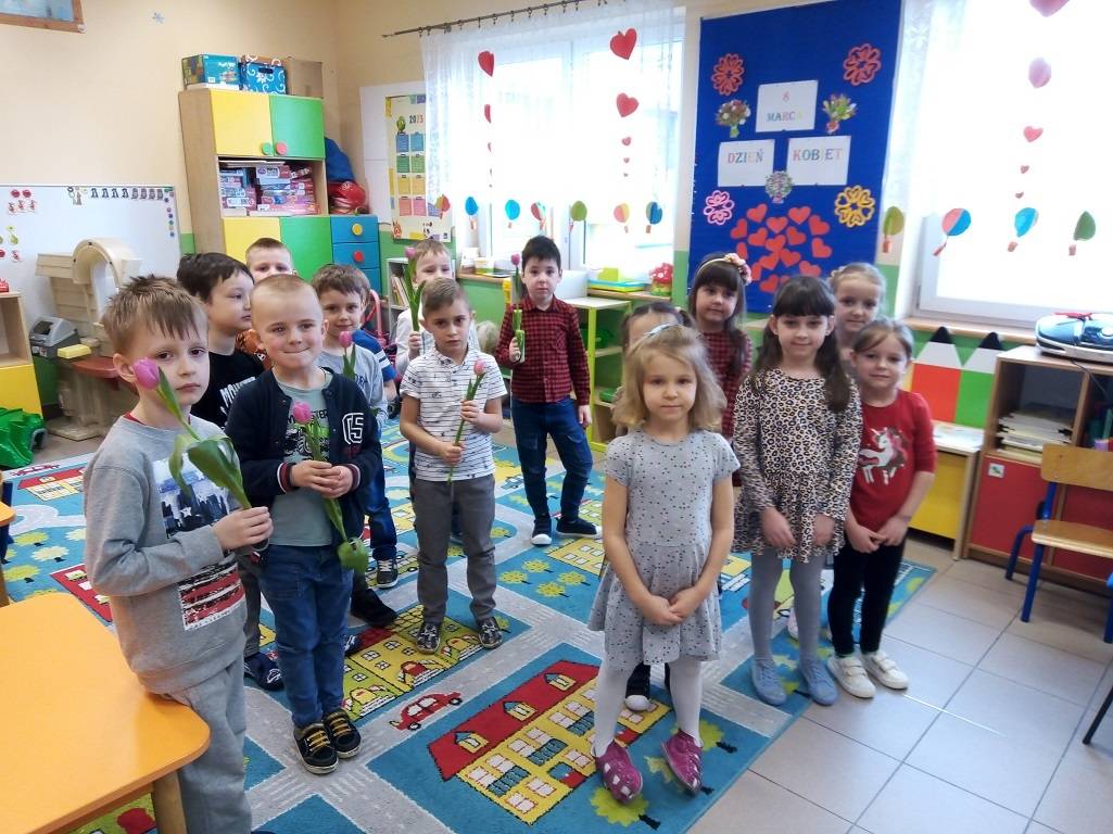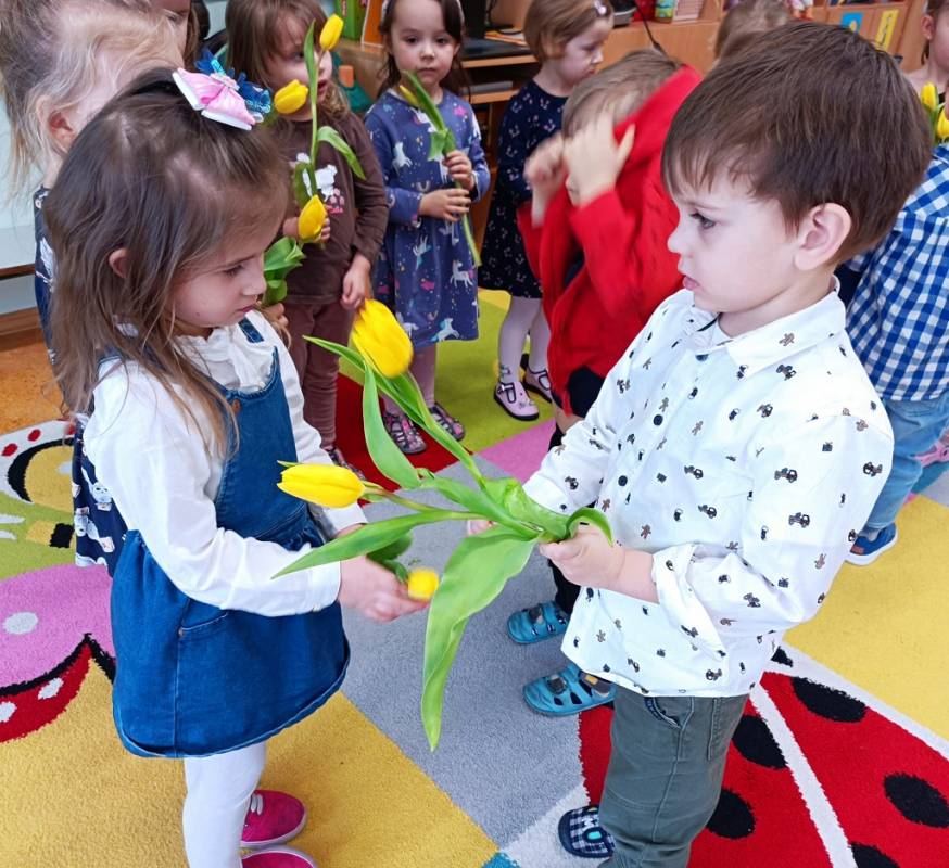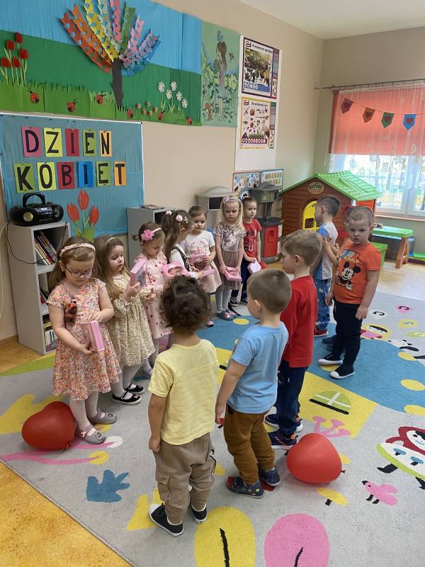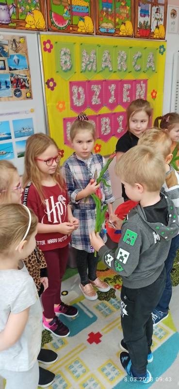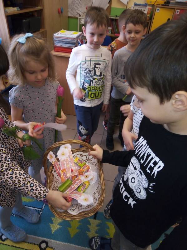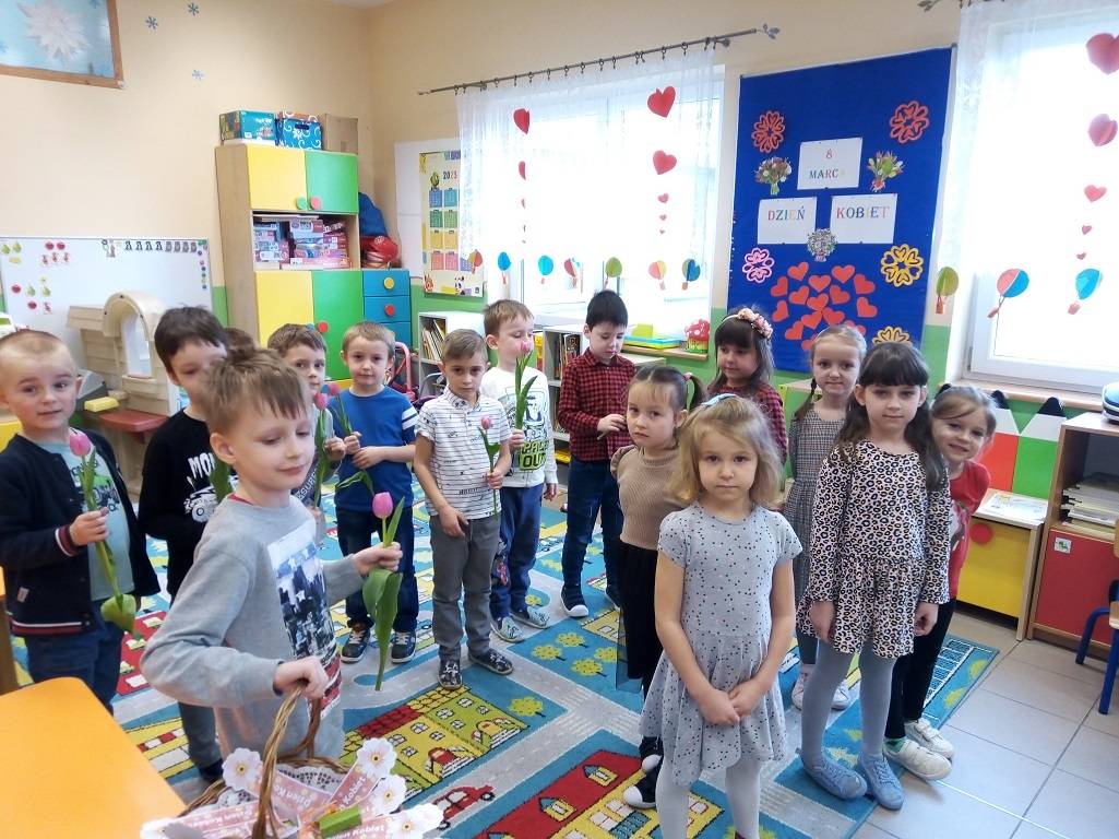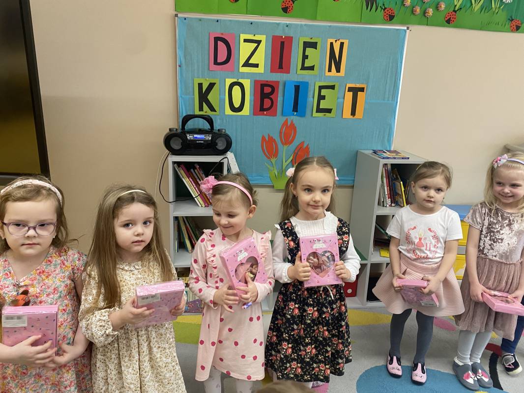 8 marca to wyjątkowy dzień w roku. Wtedy swoje święto obchodzą wszystkie kobiety, zarówno te duże, jak i te małe. W tym szczególnym czasie wszyscy chłopcy w każdej grupie składali życzenia dziewczynkom i swoim paniom. Nie obyło się bez drobnych upominków i słodkiego poczęstunku. Tego dnia panowała radosna atmosfera każda dziewczynka czuła się wyjątkowo. Chłopcy byli przemili, uprzejmi i sympatyczni.