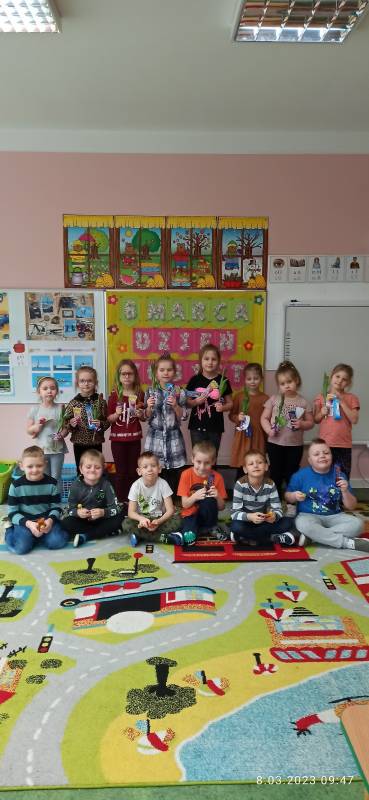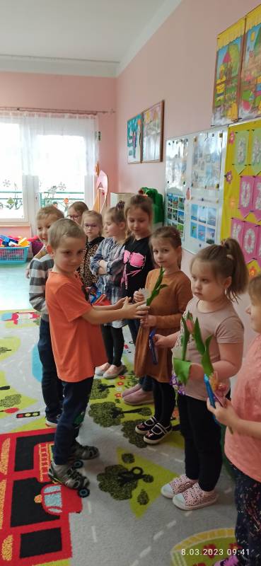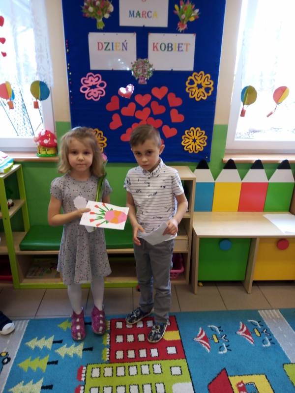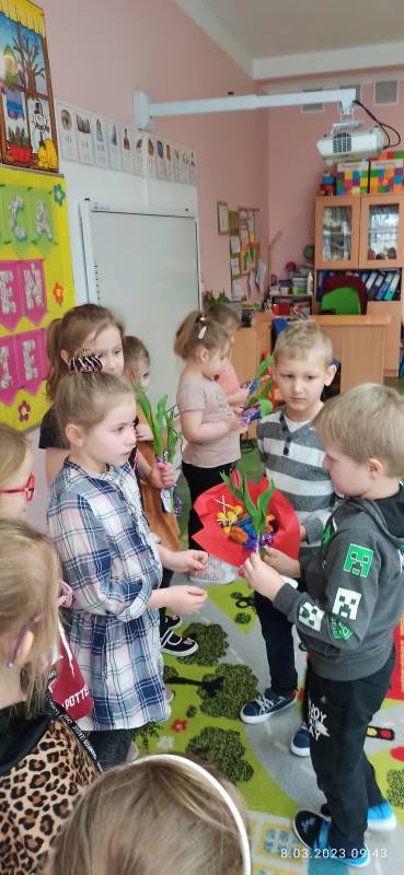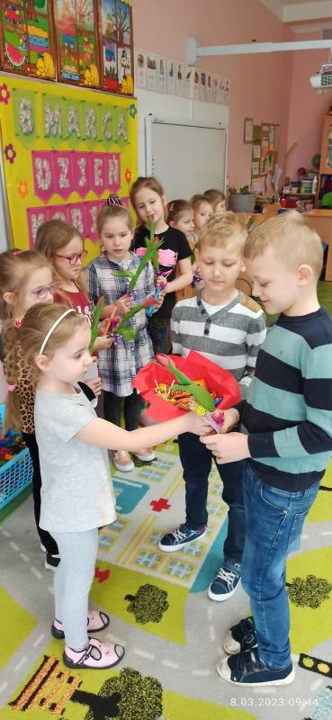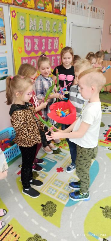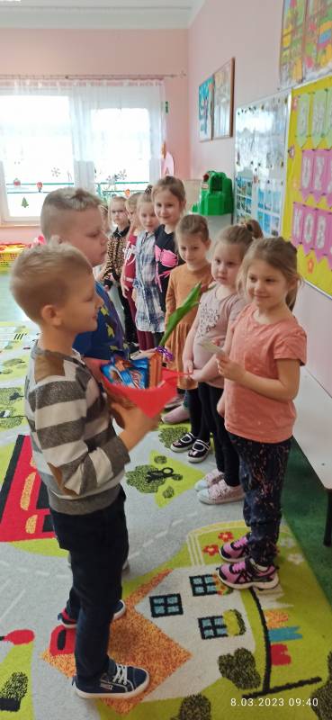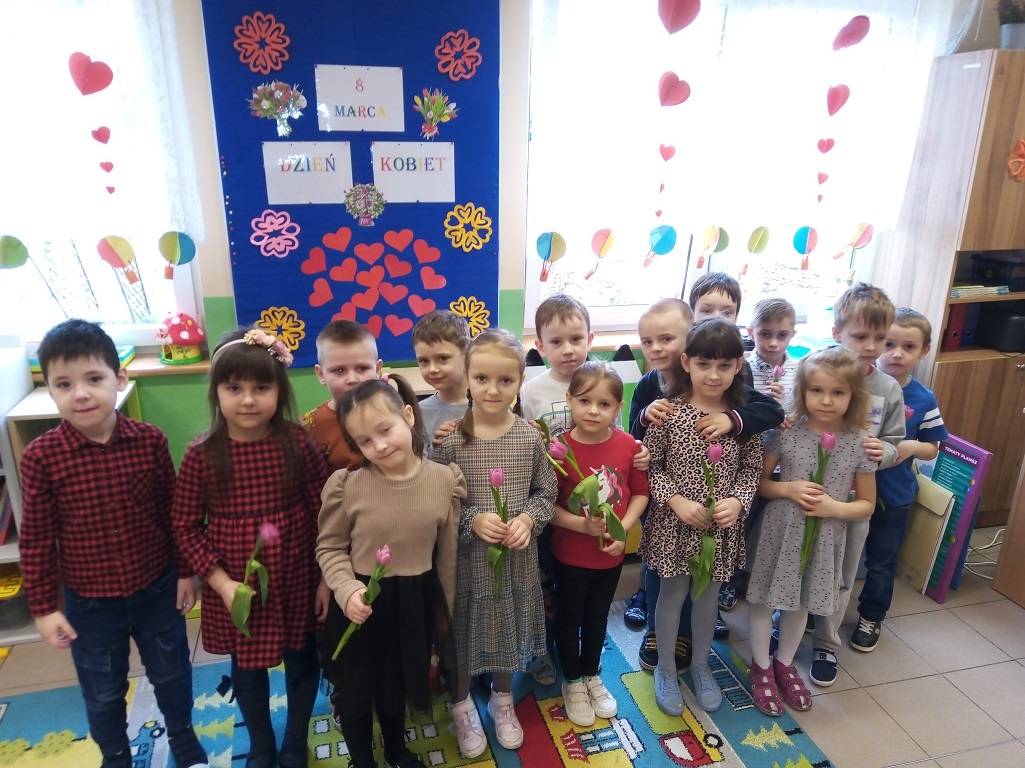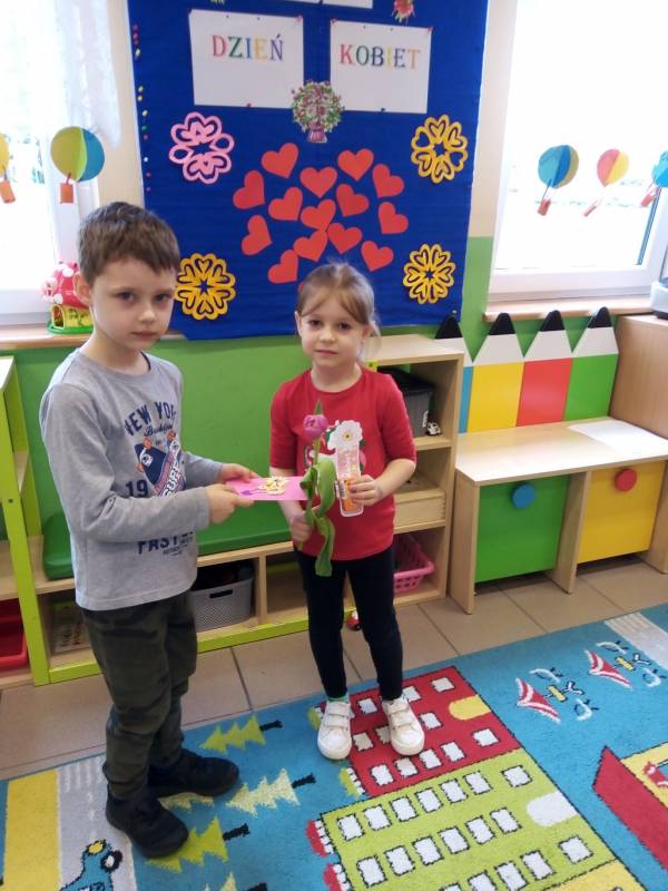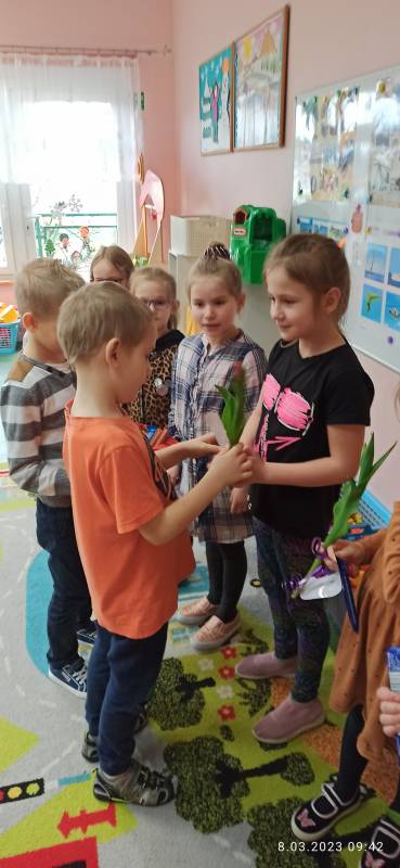8 marca to wyjątkowy dzień w roku. Wtedy swoje święto obchodzą wszystkie kobiety, zarówno te duże, jak i te małe. W tym szczególnym czasie wszyscy chłopcy w każdej grupie składali życzenia dziewczynkom i swoim paniom. Nie obyło się bez drobnych upominków i słodkiego poczęstunku. Tego dnia panowała radosna atmosfera każda dziewczynka czuła się wyjątkowo. Chłopcy byli przemili, uprzejmi i sympatyczni.