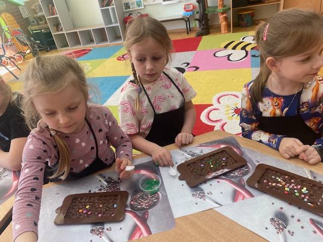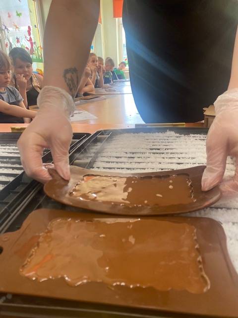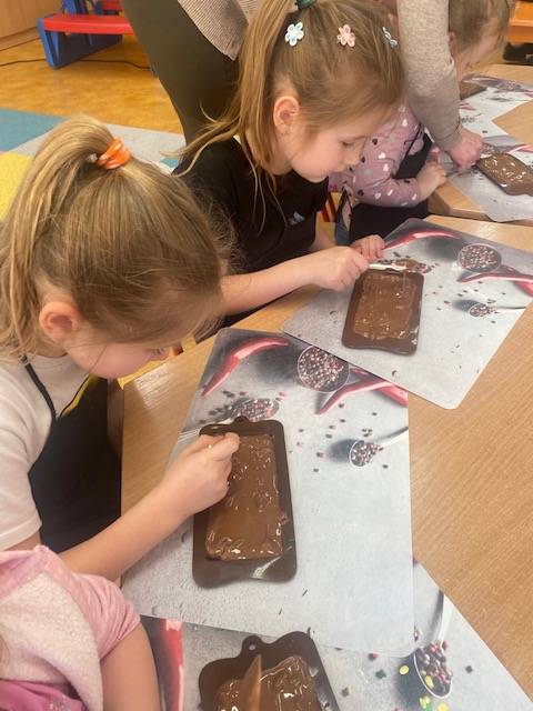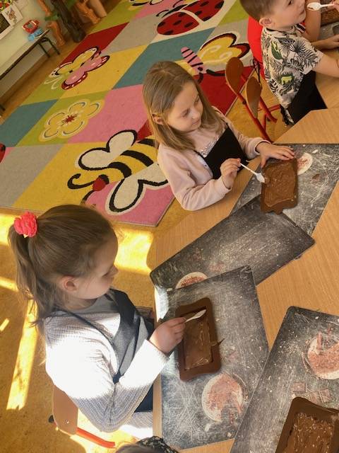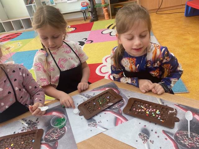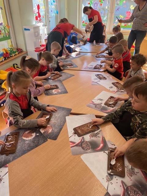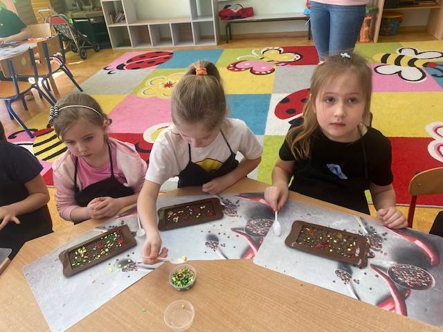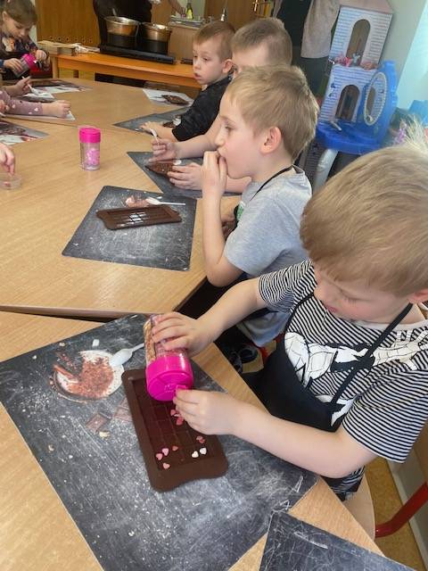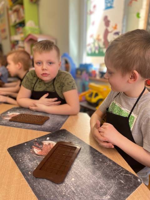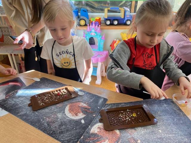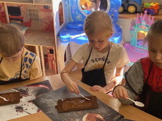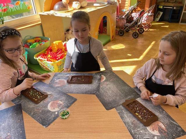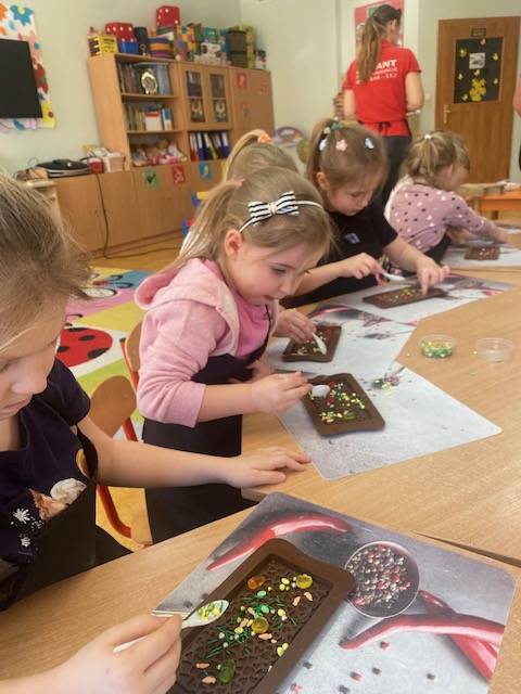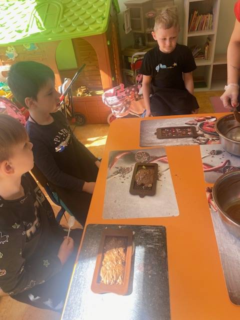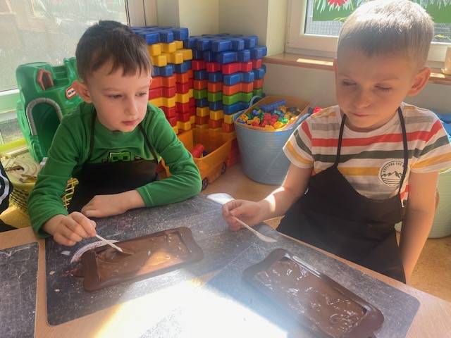 W dniu 29 marca w Przedszkolu Samorządowym w Gorzkowicach odbyły się długo wyczekiwane warsztaty czekoladowe. Uczestnicy warsztatów zostali zapoznani z historią czekolady, dowiedzieli się z czego i jak powstaje oraz poznali jej różne smaki. Dzieci miały możliwość oglądania ziaren i owoców kakaowca. W dalszej części biorący udział w warsztatach ubrani w fartuszki, mogli przenieść się w czekoladowy świat, stworzyli prawdziwą własną tabliczkę czekolady. Przedszkolaki otrzymały formy, wypełniły je kolorowymi ozdobami, a następnie panie prowadzące wypełniły je płynną, pyszną czekoladą. Dzieci za pomocą łyżeczek formowały swoje czekoladki, które następnie były studzone w suchym lodzie. Już po kilkunastu minutach gotowe, smakowite dzieło można było zapakować i zabrać do domu. Teraz już każdy uczestnik warsztatów wie, jak powstaje czekolada. Takie wyjątkowe zajęcia sprawiają dzieciom radość, pobudzają wyobraźnię, precyzję, sprzyjają budowaniu dobrych relacji oraz pozwalają poznać w praktyczny sposób za pomocą zmysłów i własnych doświadczeń otaczający nas świat.