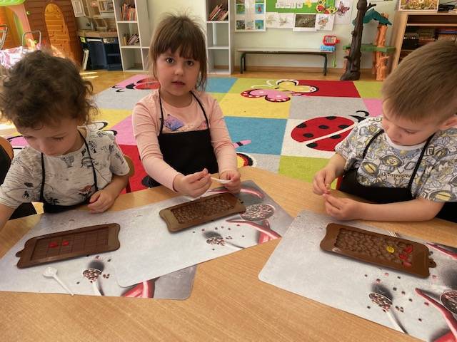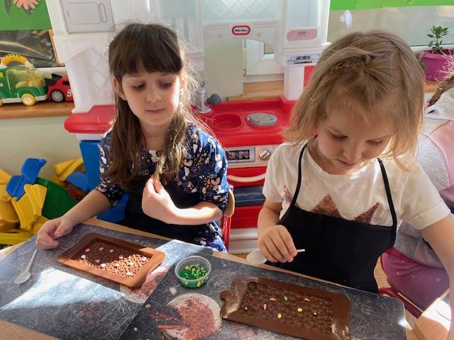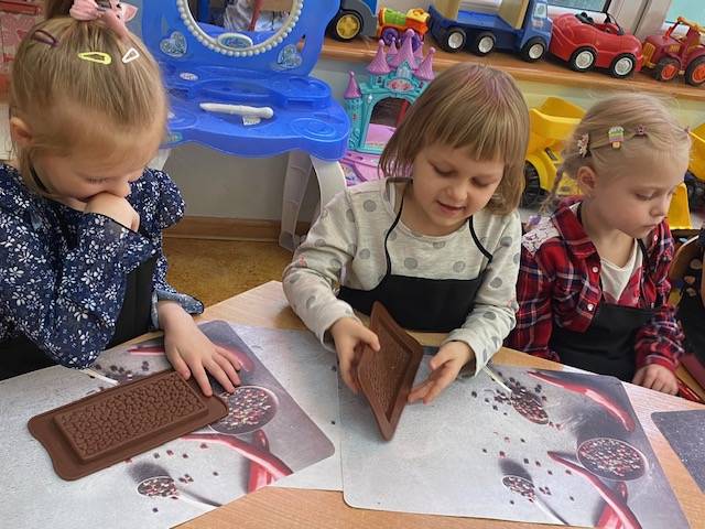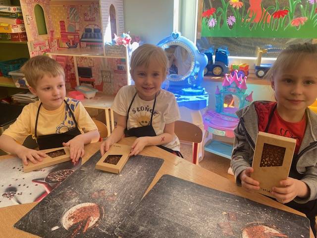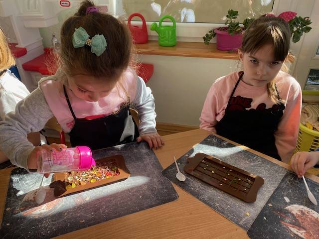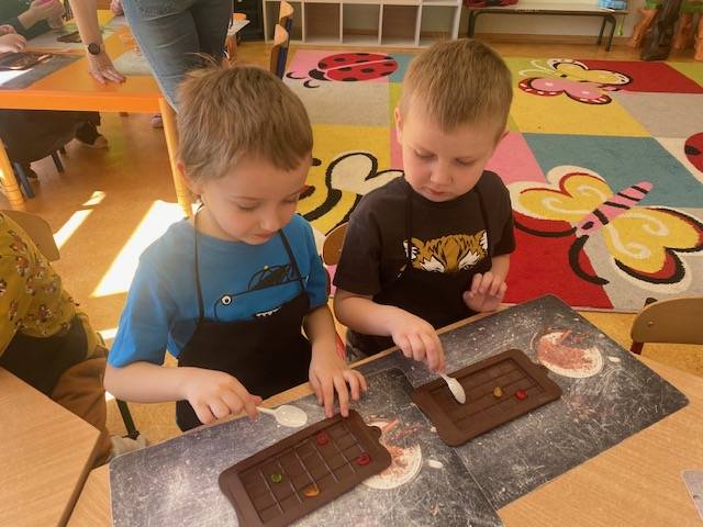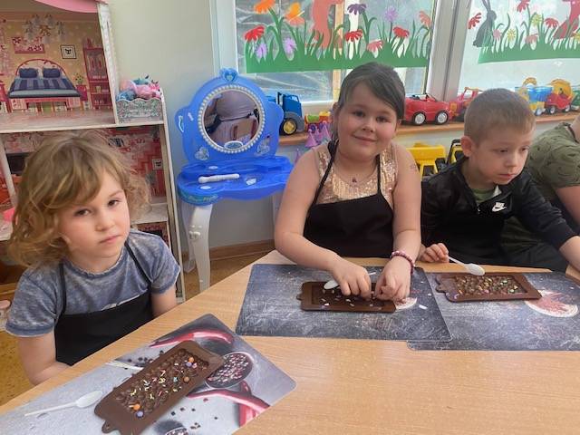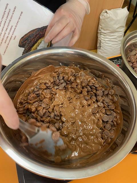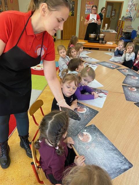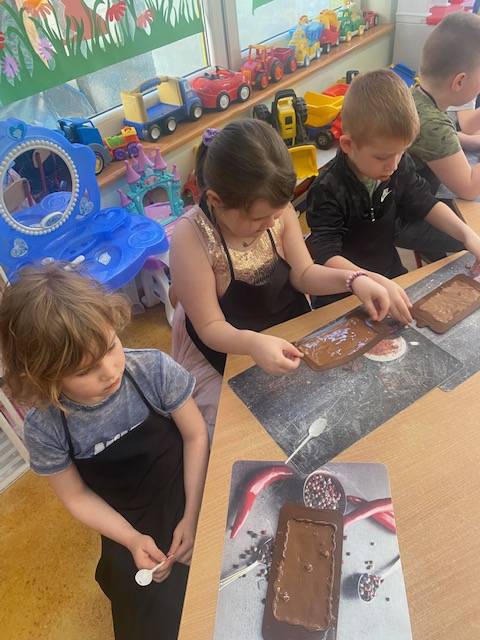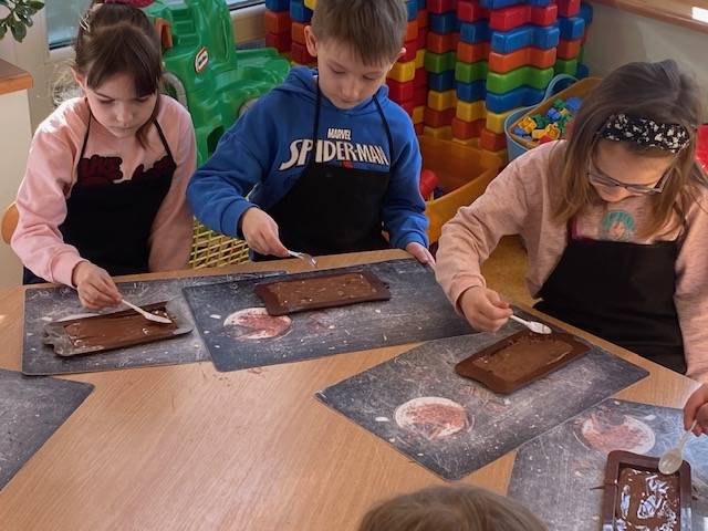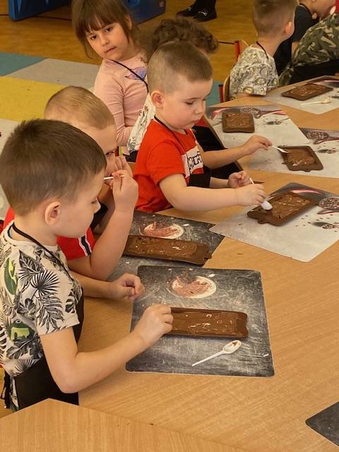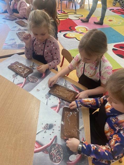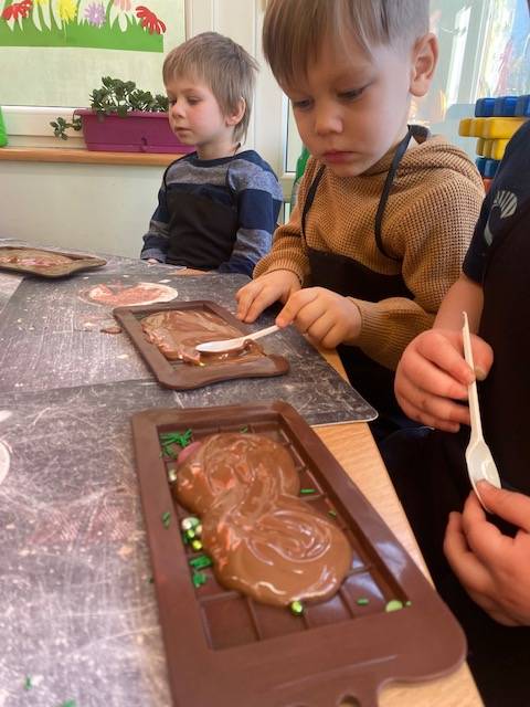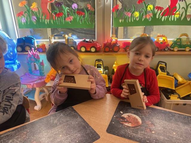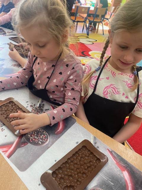 W dniu 29 marca w Przedszkolu Samorządowym w Gorzkowicach odbyły się długo wyczekiwane warsztaty czekoladowe. Uczestnicy warsztatów zostali zapoznani z historią czekolady, dowiedzieli się z czego i jak powstaje oraz poznali jej różne smaki. Dzieci miały możliwość oglądania ziaren i owoców kakaowca. W dalszej części biorący udział w warsztatach ubrani w fartuszki, mogli przenieść się w czekoladowy świat, stworzyli prawdziwą własną tabliczkę czekolady. Przedszkolaki otrzymały formy, wypełniły je kolorowymi ozdobami, a następnie panie prowadzące wypełniły je płynną, pyszną czekoladą. Dzieci za pomocą łyżeczek formowały swoje czekoladki, które następnie były studzone w suchym lodzie. Już po kilkunastu minutach gotowe, smakowite dzieło można było zapakować i zabrać do domu. Teraz już każdy uczestnik warsztatów wie, jak powstaje czekolada. Takie wyjątkowe zajęcia sprawiają dzieciom radość, pobudzają wyobraźnię, precyzję, sprzyjają budowaniu dobrych relacji oraz pozwalają poznać w praktyczny sposób za pomocą zmysłów i własnych doświadczeń otaczający nas świat.