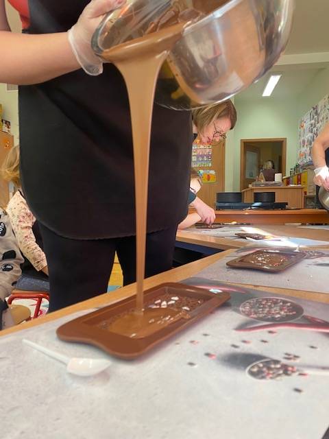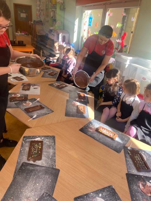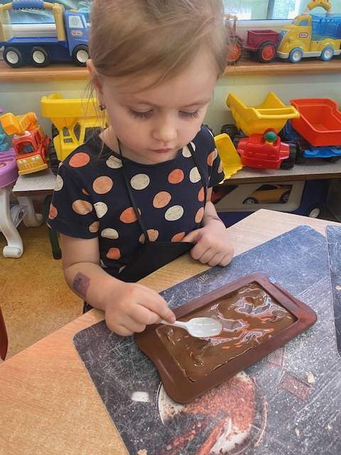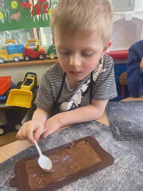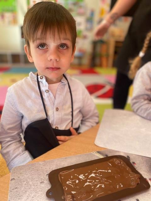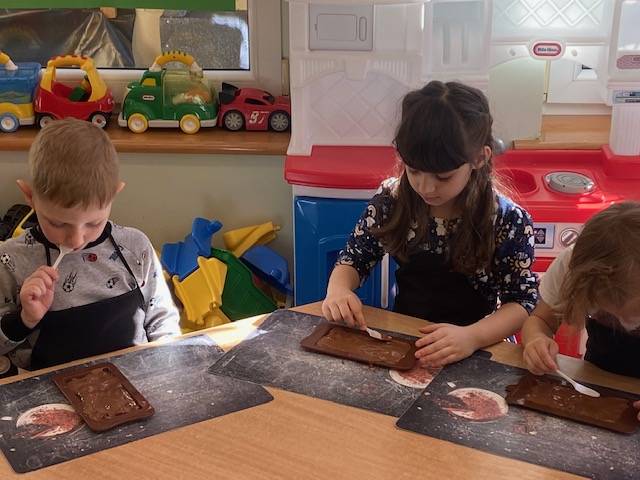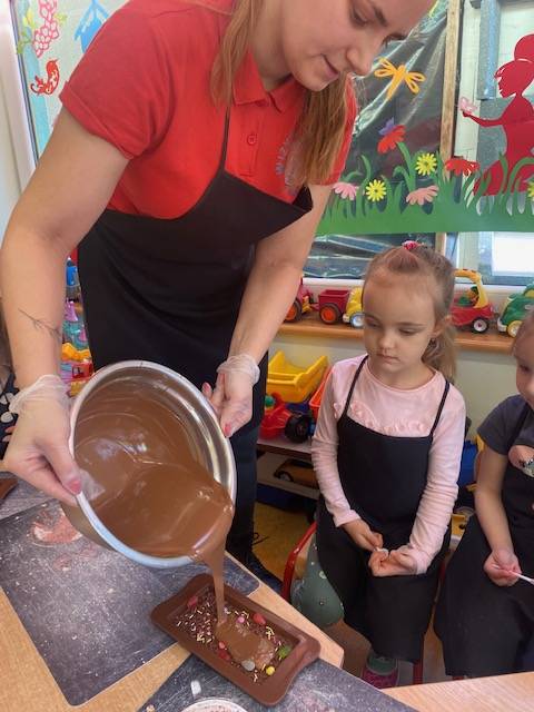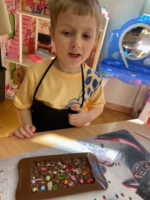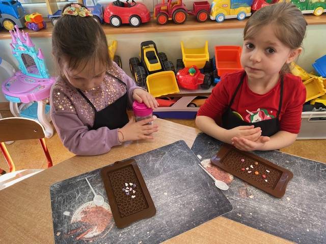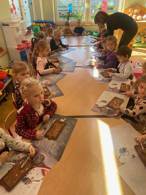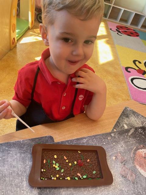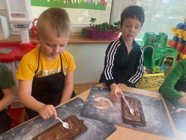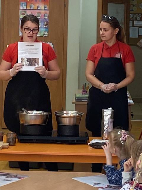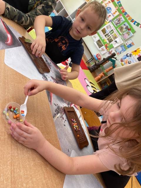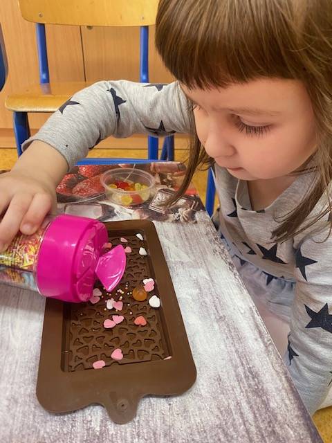 W dniu 29 marca w Przedszkolu Samorządowym w Gorzkowicach odbyły się długo wyczekiwane warsztaty czekoladowe. Uczestnicy warsztatów zostali zapoznani z historią czekolady, dowiedzieli się z czego i jak powstaje oraz poznali jej różne smaki. Dzieci miały możliwość oglądania ziaren i owoców kakaowca. W dalszej części biorący udział w warsztatach ubrani w fartuszki, mogli przenieść się w czekoladowy świat, stworzyli prawdziwą własną tabliczkę czekolady. Przedszkolaki otrzymały formy, wypełniły je kolorowymi ozdobami, a następnie panie prowadzące wypełniły je płynną, pyszną czekoladą. Dzieci za pomocą łyżeczek formowały swoje czekoladki, które następnie były studzone w suchym lodzie. Już po kilkunastu minutach gotowe, smakowite dzieło można było zapakować i zabrać do domu. Teraz już każdy uczestnik warsztatów wie, jak powstaje czekolada. Takie wyjątkowe zajęcia sprawiają dzieciom radość, pobudzają wyobraźnię, precyzję, sprzyjają budowaniu dobrych relacji oraz pozwalają poznać w praktyczny sposób za pomocą zmysłów i własnych doświadczeń otaczający nas świat.