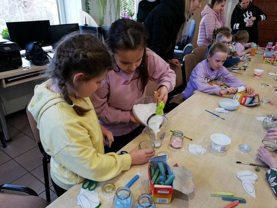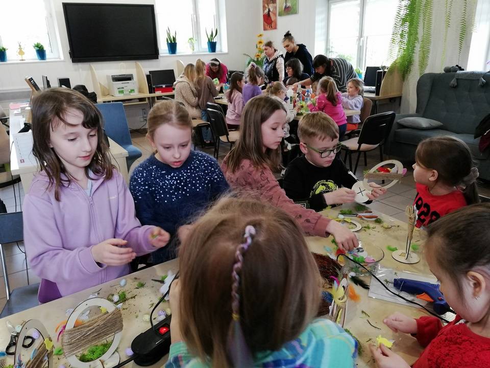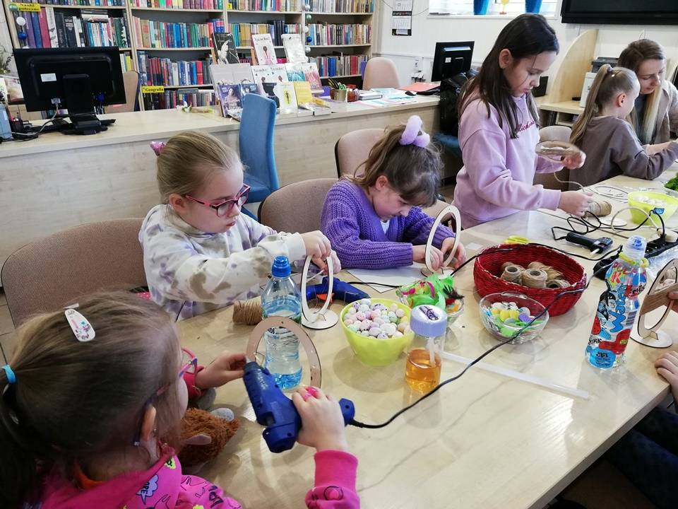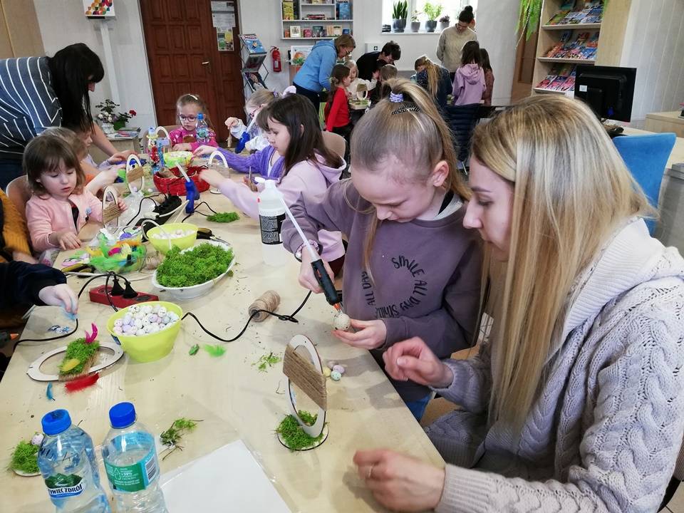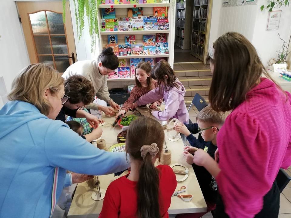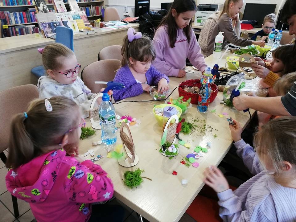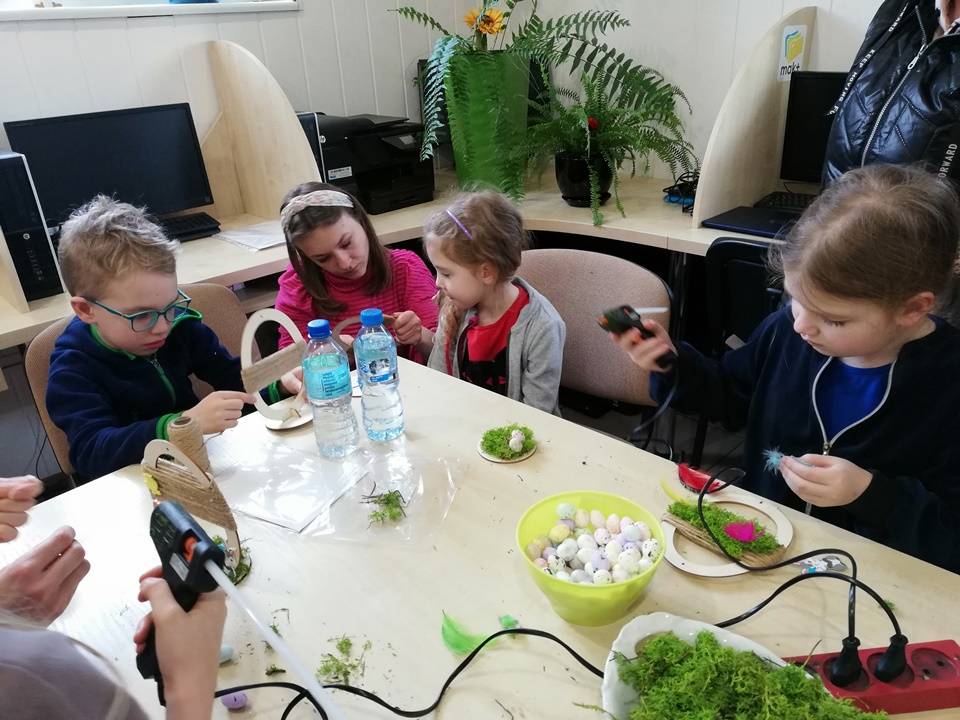 Święta Wielkanocne to radosny czas, na który dzieci czekają z niecierpliwością. To święta pełne tradycji i zwyczajów, które chcemy przekazywać naszym młodszym pokoleniom. Z tej okazji w bibliotece w Gorzkowicach zorganizowałyśmy dla dzieci warsztaty tworzenia świątecznych stroików i kolorowych zajączków. W ruch poszły kolorowe wstążki, jajka, kurki, sól, kreda i wiele innych ciekawych, a czasem zaskakujących materiałów. Wszystkie prace zostały wykonane z dużą starannością i fantazją, bo uczestnicy naszych warsztatów wiedzą, że najpiękniejsze ozdoby to te, które wykonamy własnoręcznie.