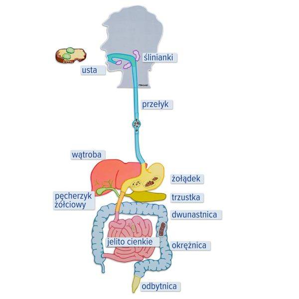 Tablice magnetyczne – układ pokarmowy. Bezpośrednio na tablicy można zobrazować przebieg procesu trawienia u człowieka. W zależności od poziomu edukacji można go przedstawić i wyjaśnić w sposób bardzo prosty lub bardzo szczegółowy. Łatwy do zrozumienia i wyjątkowo kolorowy rysunek. Zestaw zawiera: 18 magnetycznych obrazków (wielkość głowy: ok. 23 × 18 cm), 11 zadrukowanych plakietek z nazwami, 1 podręczną instrukcję z materiałami dydaktycznymi.