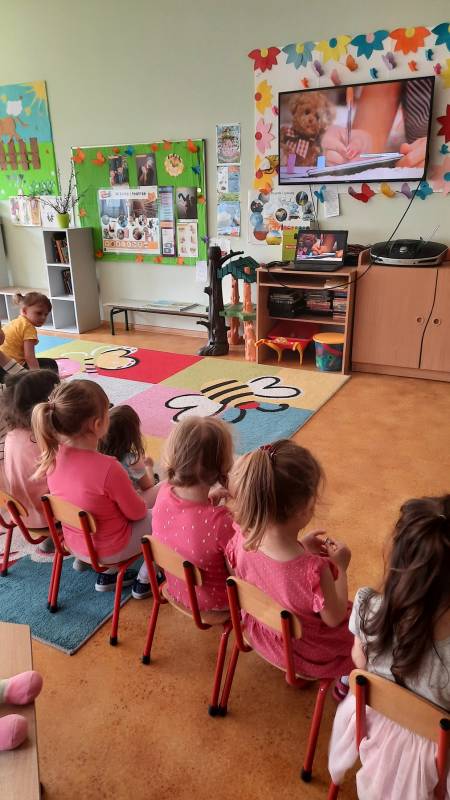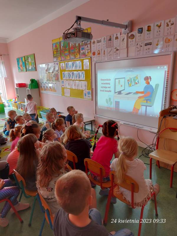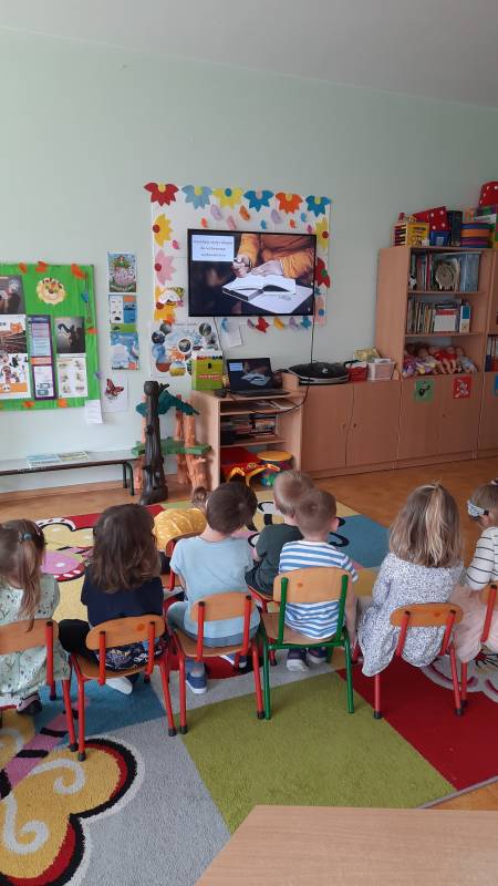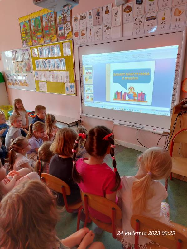 W tym dniu dzieci obejrzały prezentację ,,Jak powstaje książka? Dowiedziały się o ,,Zasadach korzystania z książek”.