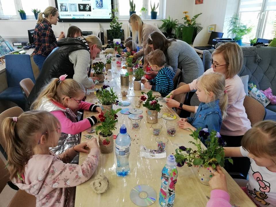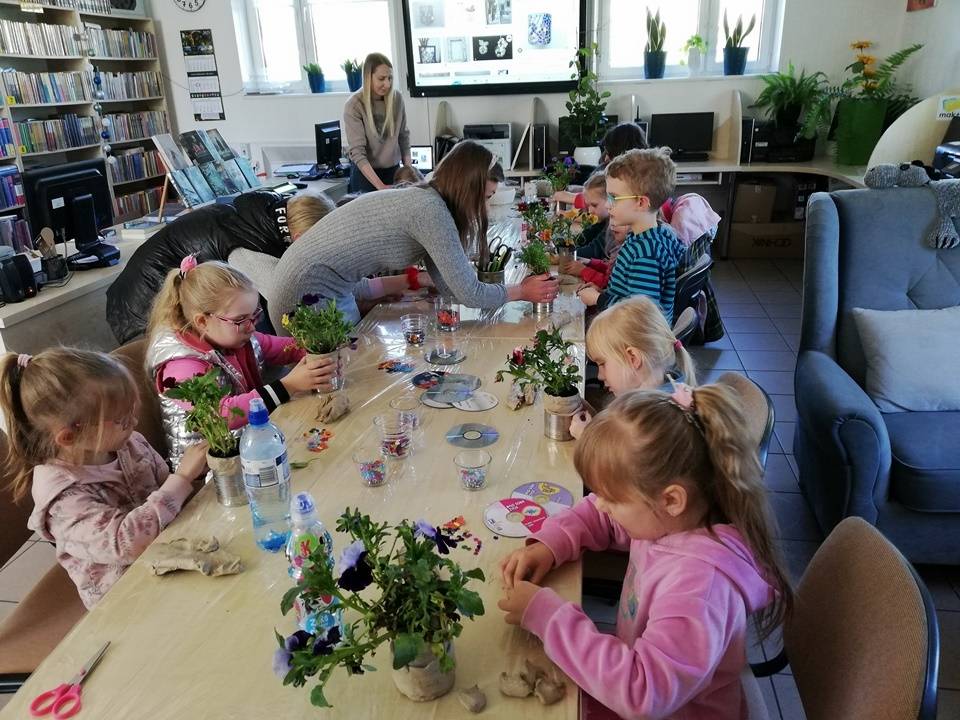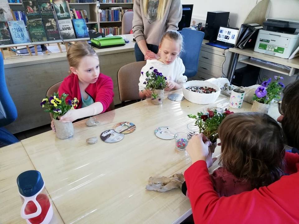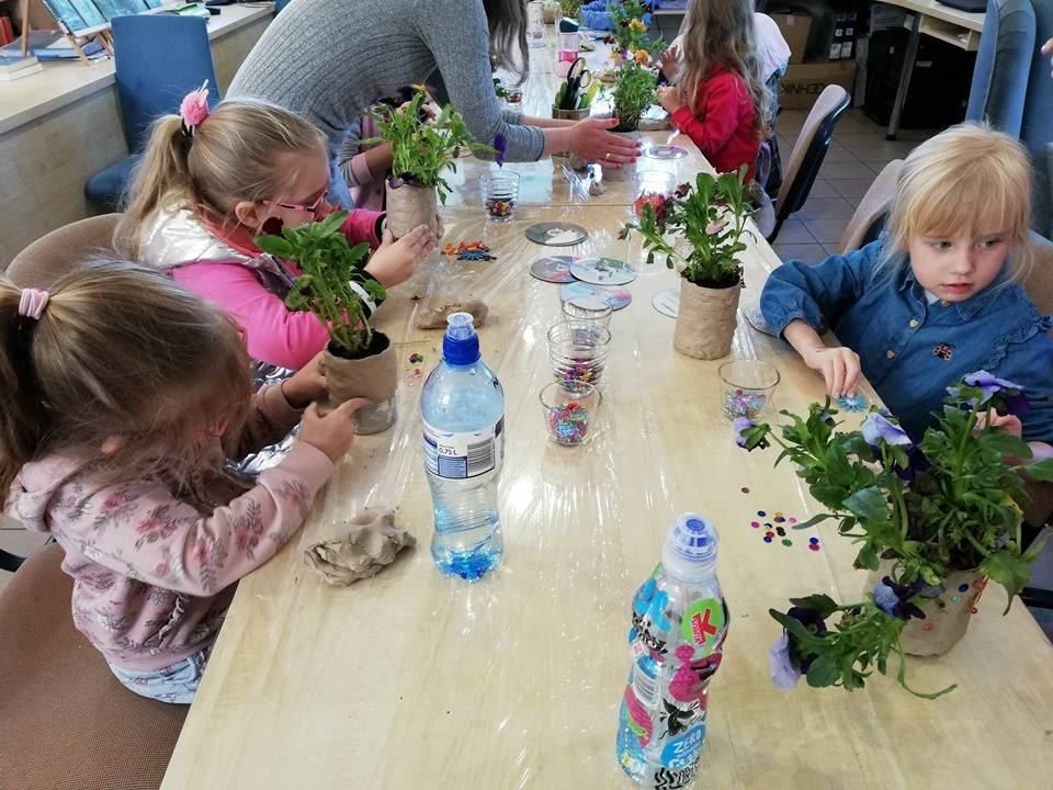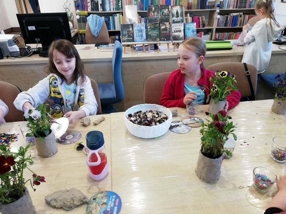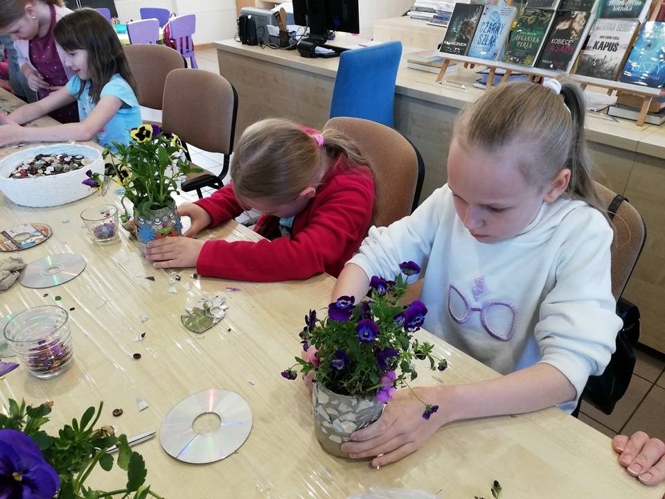 Słoneczna pogoda pozwoliła nam zrealizować część naszych artystyczno-ogrodniczych warsztatów dla dzieci w przestrzeni woków biblioteki w Gorzkowicacach. W pierwszym etapie dzieci przesadzały rośliny do puszek. W drugim, zgodnie z własną wyobraźnią tworzyły mozaikowe doniczki. Na kolejne spotkanie zapraszamy we wtorek, 23 maja.