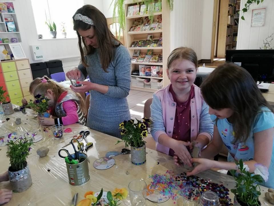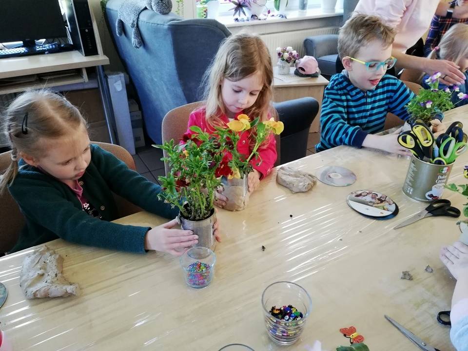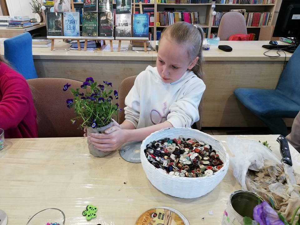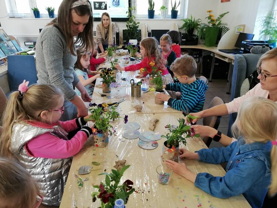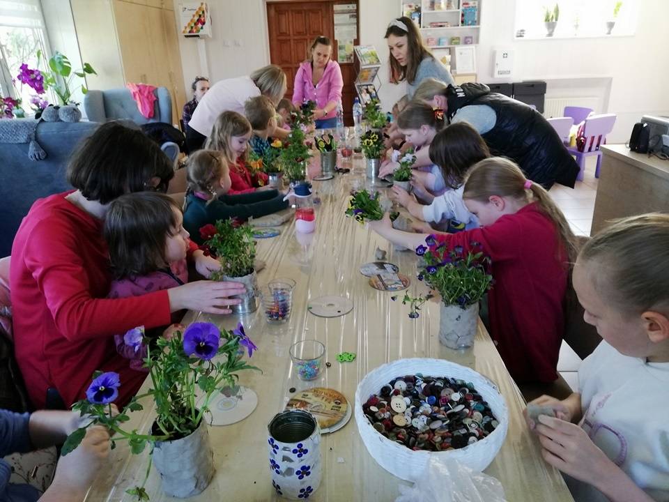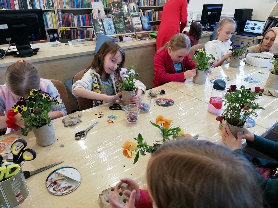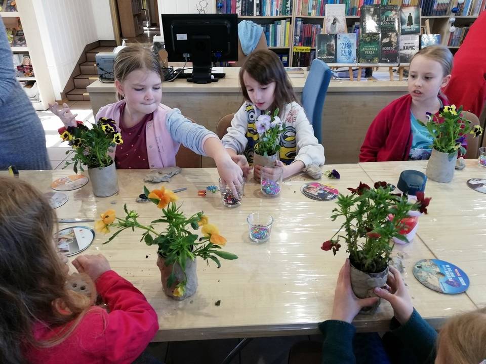 Słoneczna pogoda pozwoliła nam zrealizować część naszych artystyczno-ogrodniczych warsztatów dla dzieci w przestrzeni woków biblioteki w Gorzkowicacach. W pierwszym etapie dzieci przesadzały rośliny do puszek. W drugim, zgodnie z własną wyobraźnią tworzyły mozaikowe doniczki. Na kolejne spotkanie zapraszamy we wtorek, 23 maja.