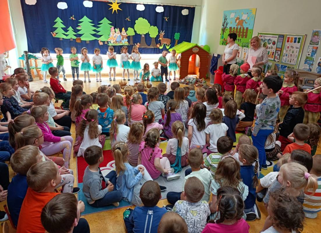 Najmłodsze przedszkolaki z grupy „Krasnoludki” aktywnie włączyły się do realizacji zadań zawartych w projekcie edukacyjnym. Zaprezentowały one wszystkim grupom przedszkolnym piosenki: o tematyce ekologicznej „ Duszki leśne” oraz wiosennej „Maszeruje wiosna”. Spotkanie to było okazją dla wszystkich przedszkolaków,